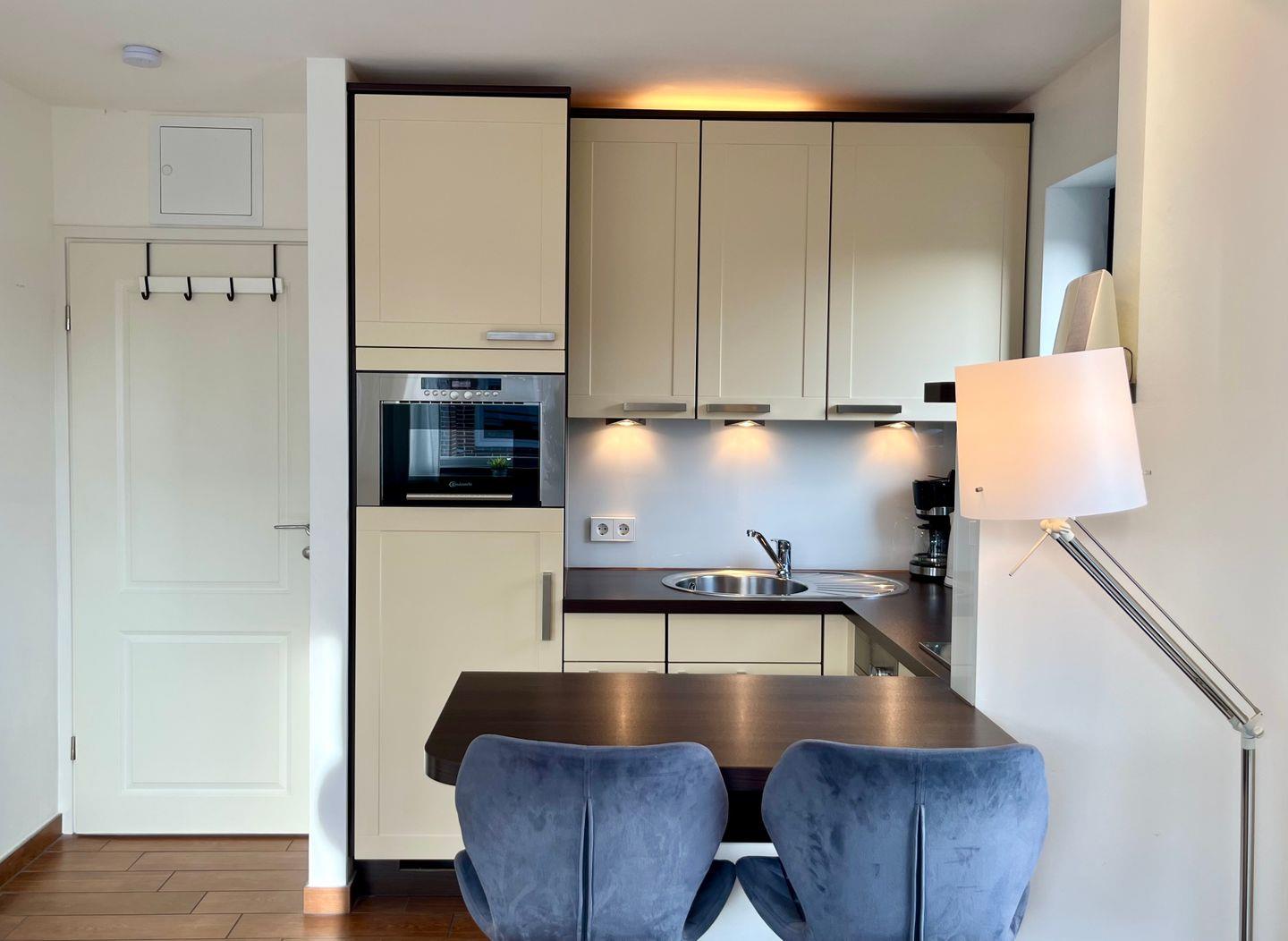 Komfortables 1-Zimmer-Apartment (25 m²) im 2. Stock für 2 Personen mit Sitzecke, Küchenzeile, Tresen, Ceranfeld, Bad mit Dusche und Balkon. Optional kann ein Frühstück hinzugebucht werden.