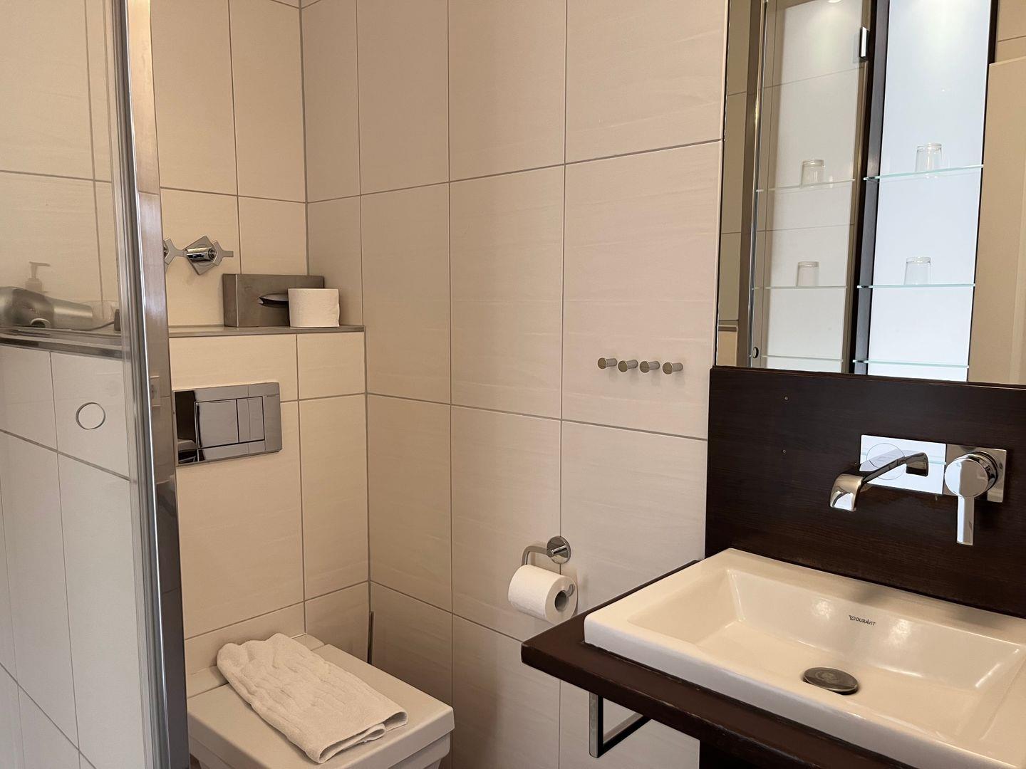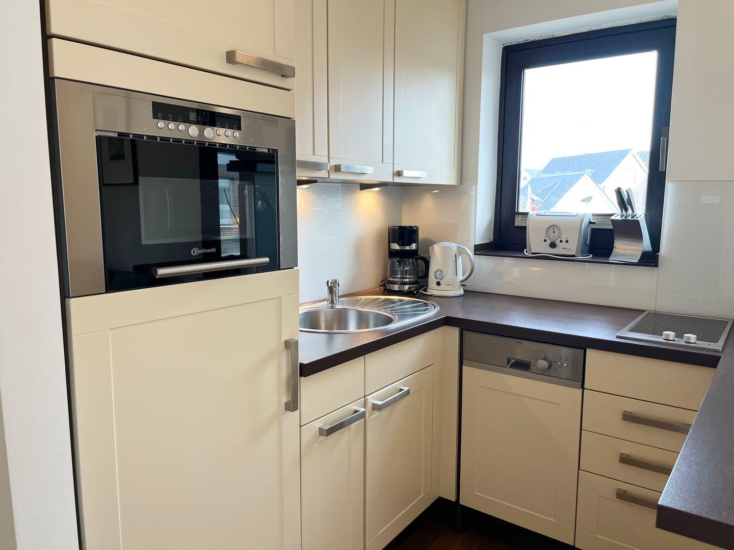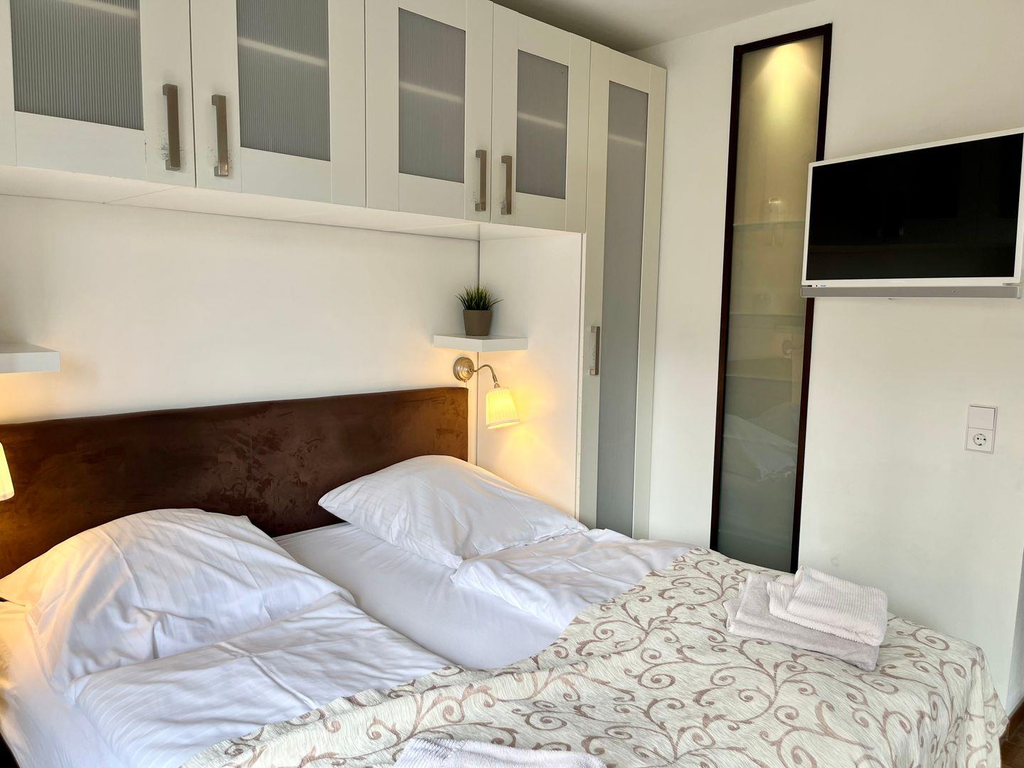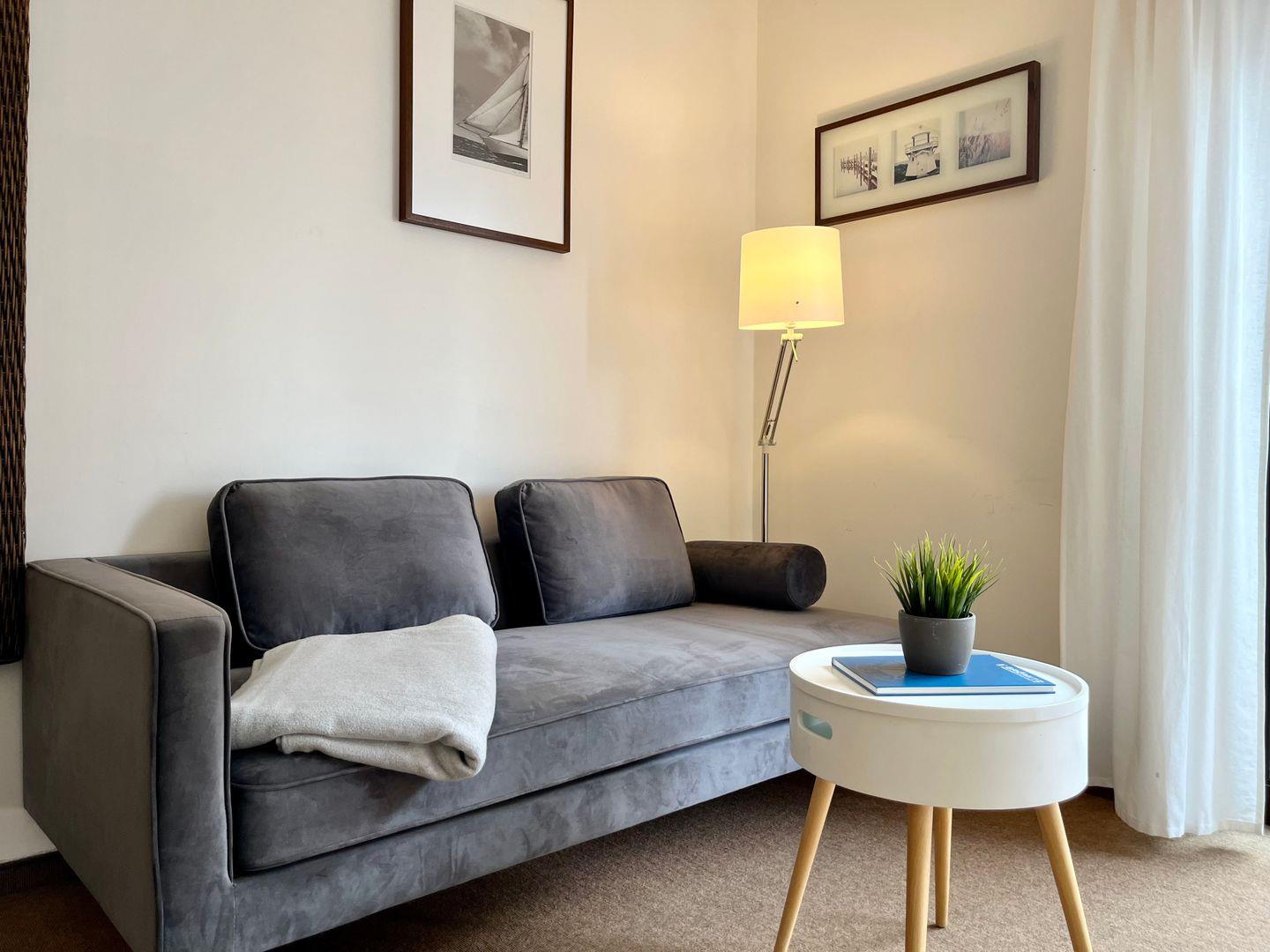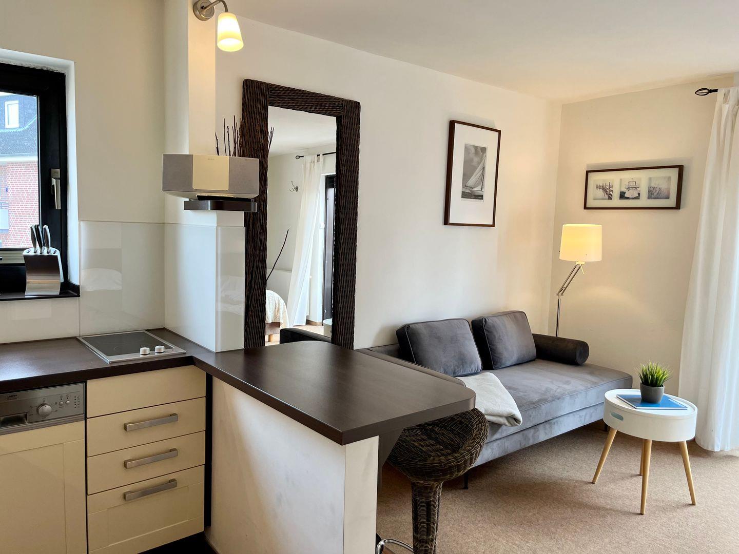 Komfortables 1-Zimmer-Apartment (25 m²) im 1. Stock für 2 Personen mit Sitzecke, Küchenzeile, Tresen, Ceranfeld, Bad mit Dusche und Balkon. Nur wenige Minute zum Strand. Optional kann ein Frühstück hinzugebucht werden.