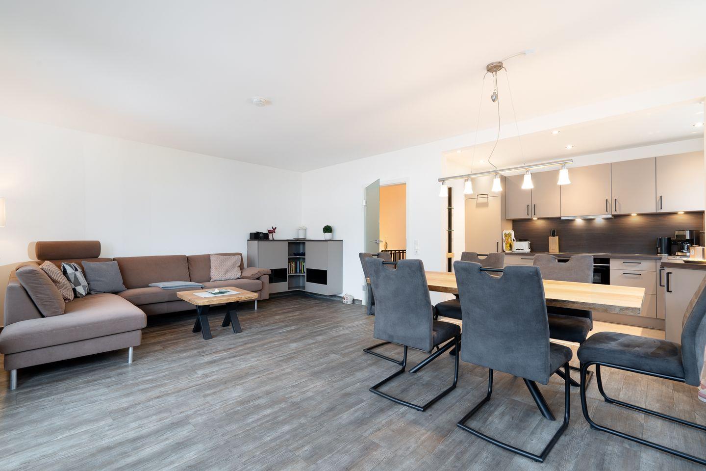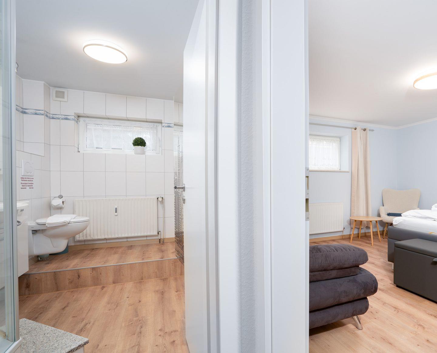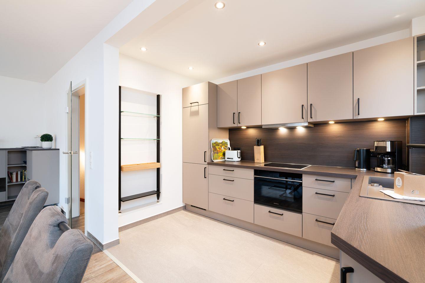Im Obergeschoss des Ferienapartments erwartet Sie ein Wohnbereich mit einer gemütlichen Sofaecke und einem Essplatz. Das Sofa bietet eine komfortable Schlafmöglichkeit für eine Person. Zusätzlich finden Sie hier die gut ausgestattete Einbauküche, eines der beiden Schlafzimmer mit zwei Einzelbetten und das "Mini-Duschbad".