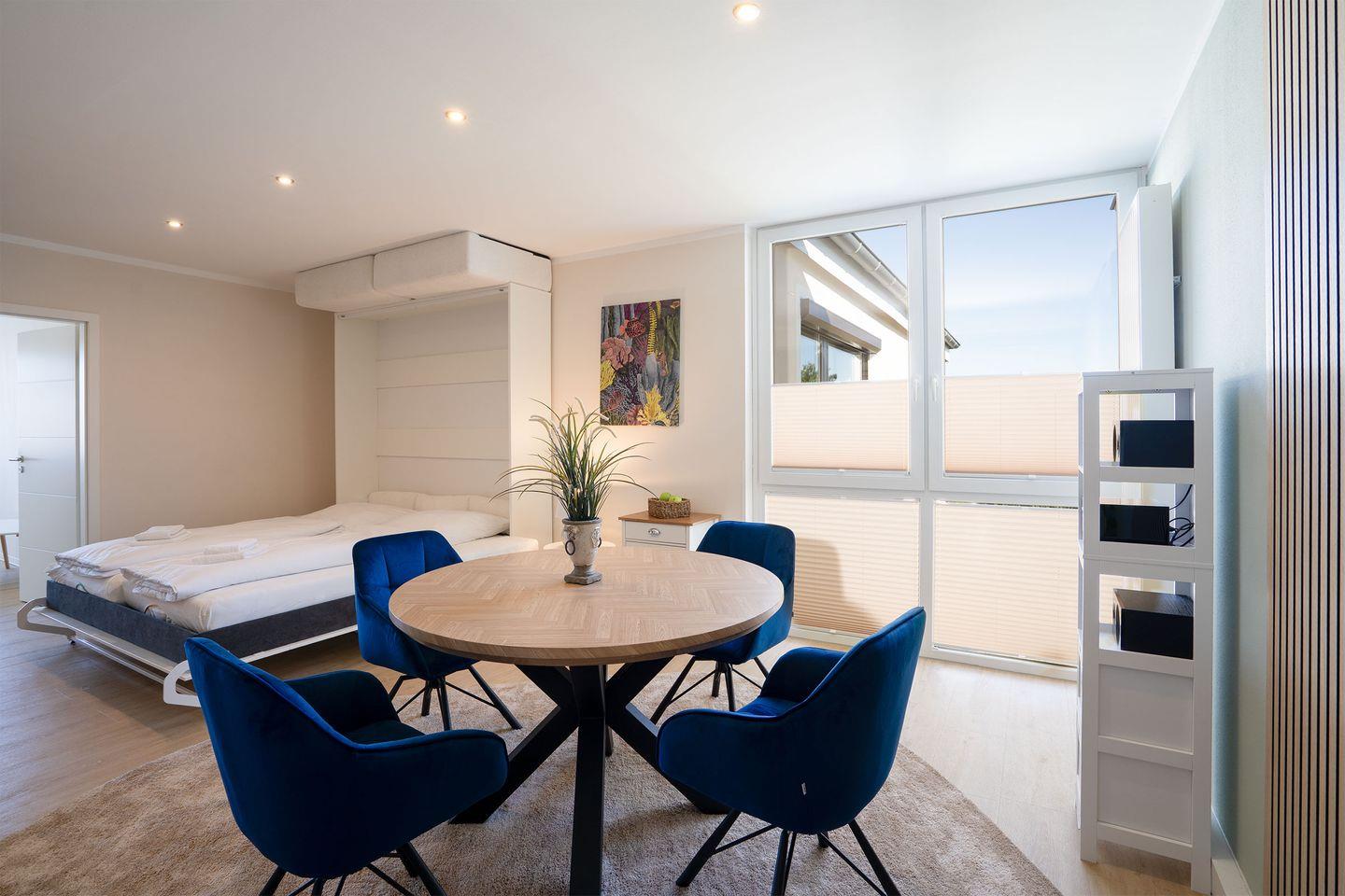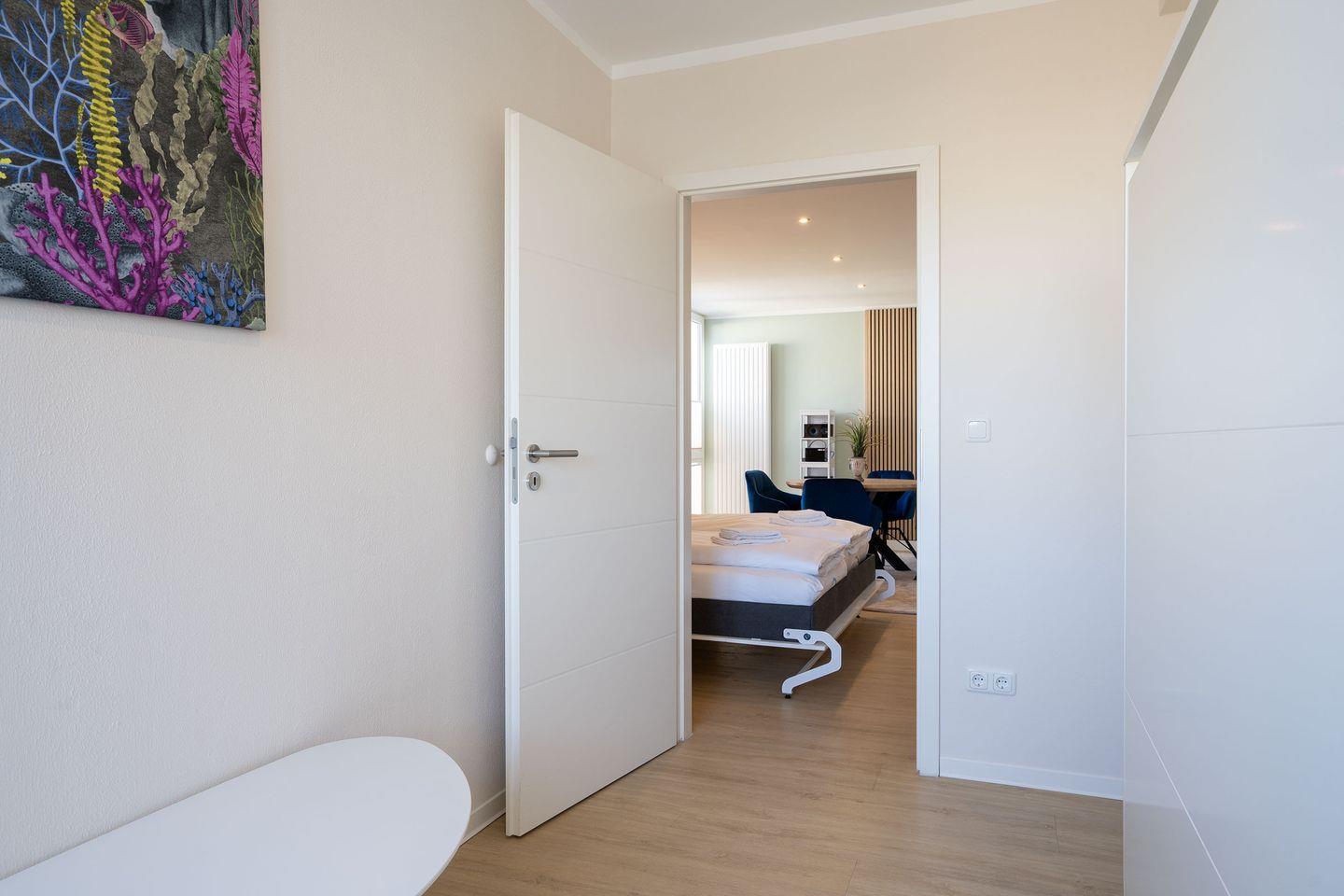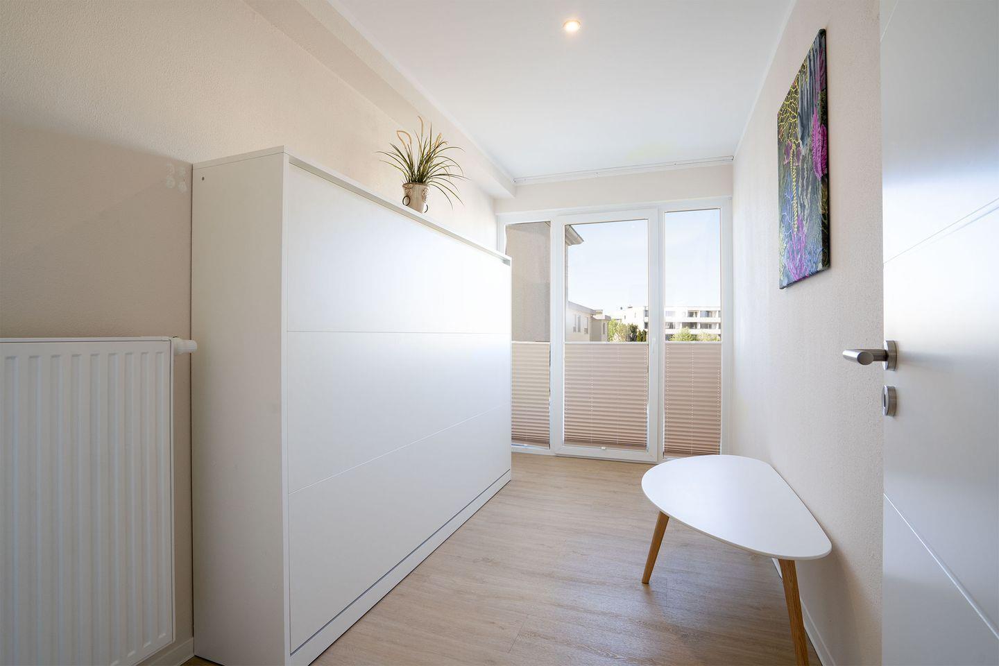Die Wohnung verfügt über einen hellen Wohnbereich mit einem Sofa-Schrankbett für zwei Personen. Der kleine Flur Richtung Balkon hat es in sich; hier versteckt sich ein Schrankbett, das sich im Handumdrehen in einen gemütlichen Schlafplatz für zwei weitere Personen, ideal für Kinder, verwandelt. Das Badezimmer ist mit einer Dusche ausgestattet. Eine kleine Küchenzeile mit einem Essplatz sowie einen möblierten Balkon runden das Angebot ab.