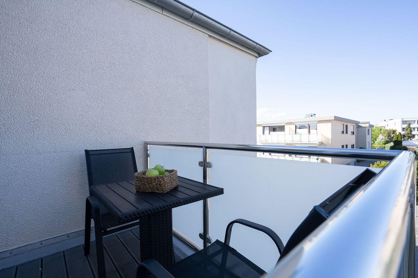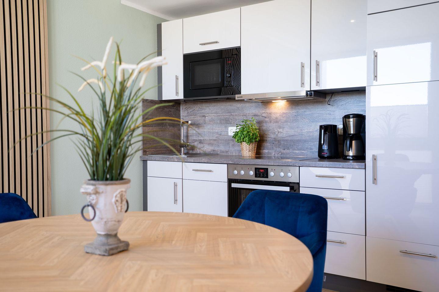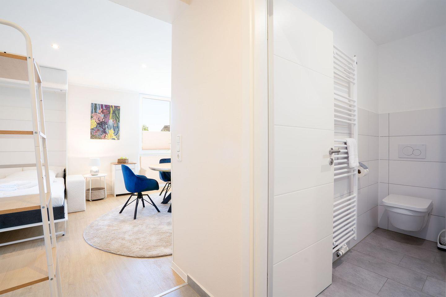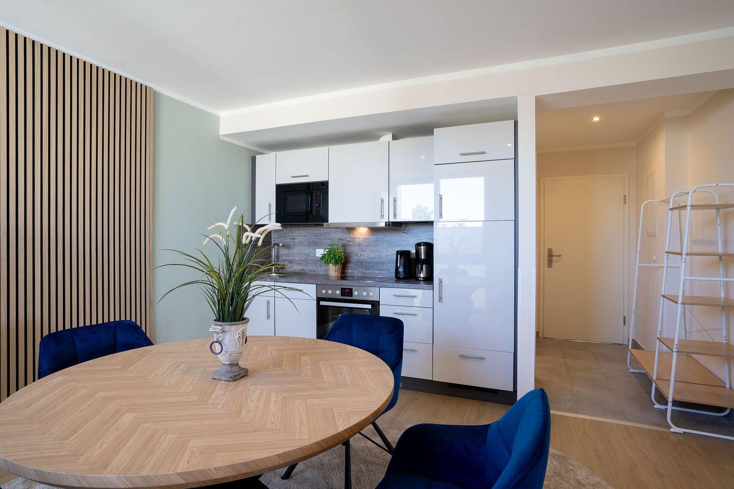 Die Wohnung verfügt über einen hellen Wohnbereich mit einem Sofa-Schrankbett für zwei Personen. Der kleine Flur Richtung Balkon hat es in sich; hier versteckt sich ein Schrankbett, das sich im Handumdrehen in einen gemütlichen Schlafplatz für zwei weitere Personen, ideal für Kinder, verwandelt. Das Badezimmer ist mit einer Dusche ausgestattet. Eine kleine Küchenzeile mit einem Essplatz sowie einen möblierten Balkon runden das Angebot ab.