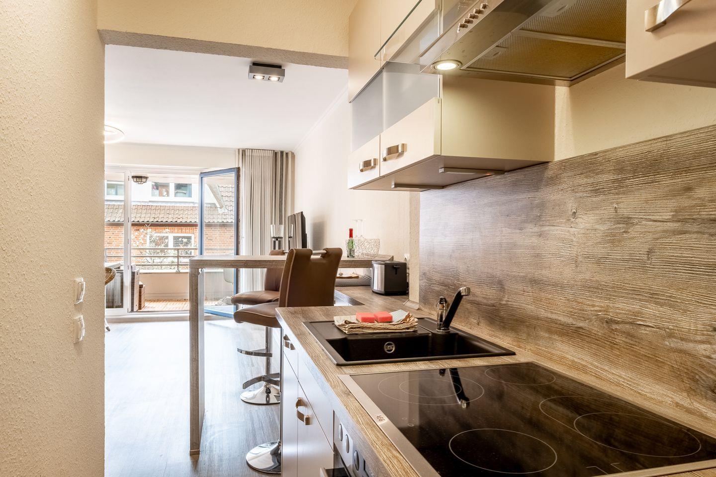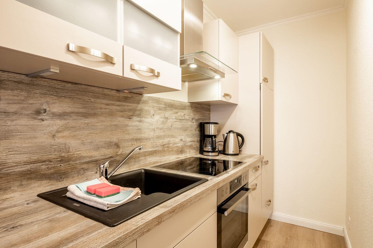 Die Küche ist vollständig ausgestattet und bietet alle nötigen Küchenutensilien, um Ihrer Kreativität beim Kochen freien Lauf zu lassen. Sie finden hier unter anderem ein Cerankochfeld, einen Kühlschrank mit Gefrierfach, einen Backofen sowie eine Kaffeemaschine und einen Toaster. Weiterhin ist die Unterkunft allergikergeeignet und bietet Sichtschutz für alle Fenster, sodass Sie Ihre Privatsphäre genießen können.