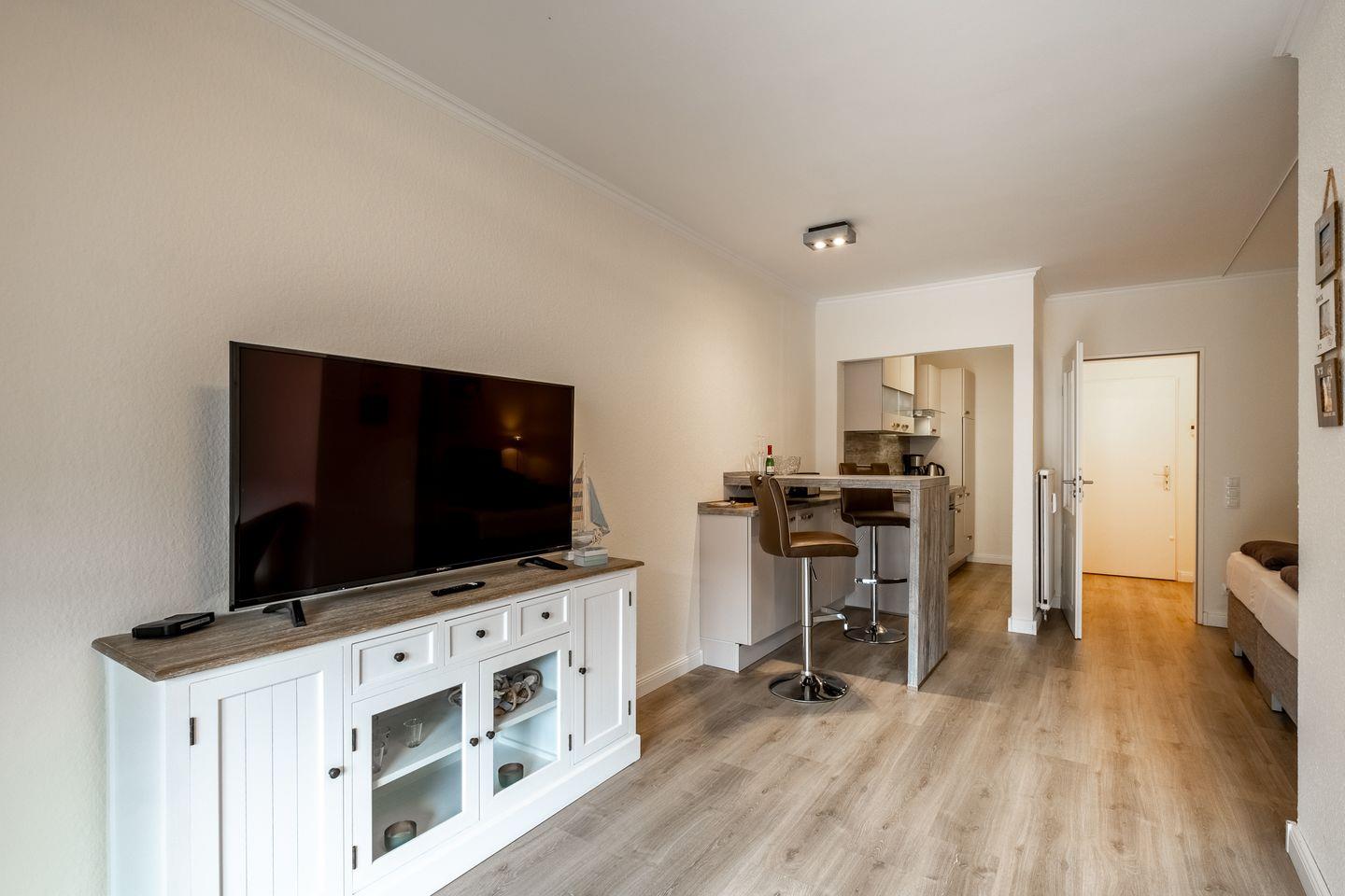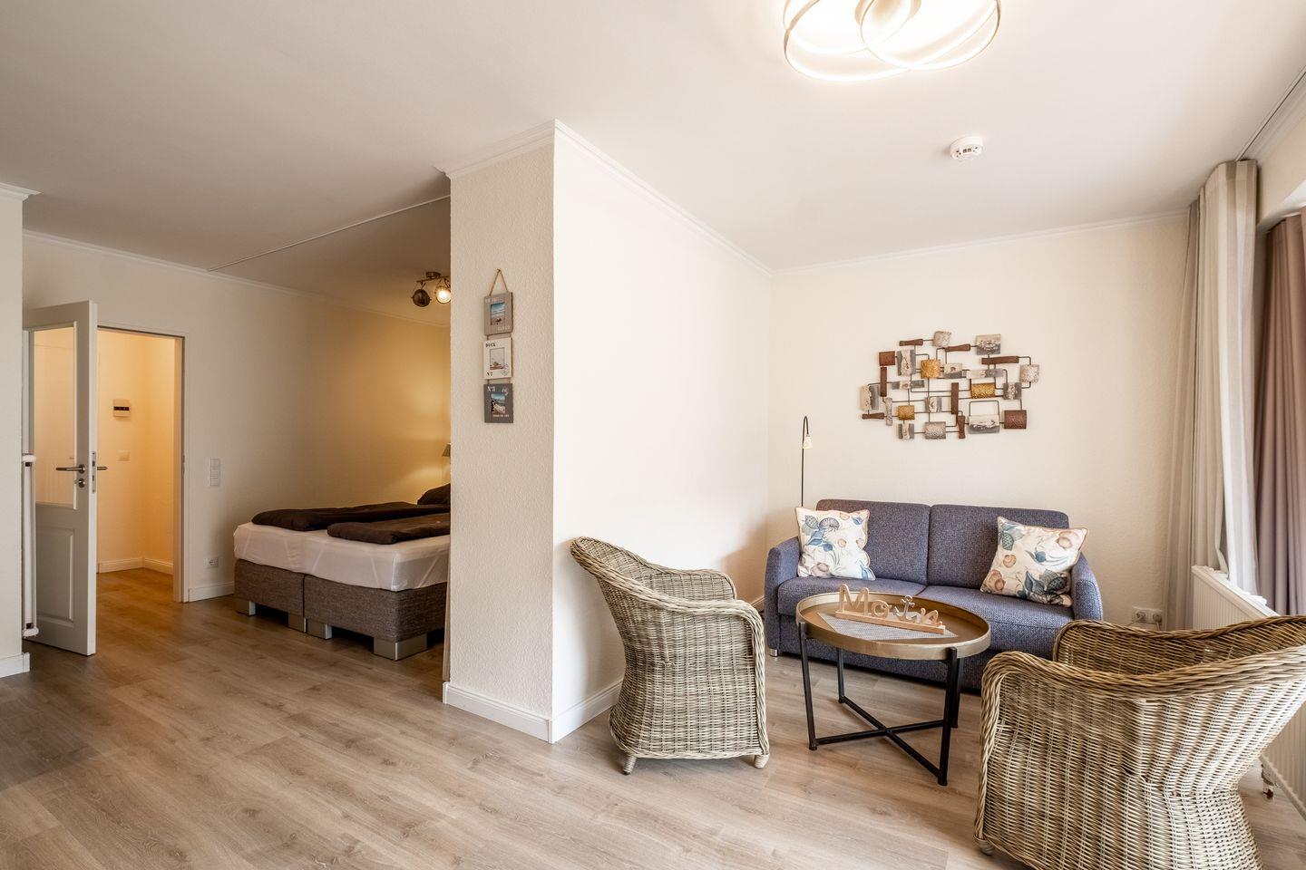 Die Unterkunft erstreckt sich über 43 m² und bietet Platz für bis zu vier Personen. Sie umfasst ein gemütliches Schlafzimmer und ein weiteres Zimmer, das sich hervorragend als Wohnbereich eignet. Das stilvolle Wohnzimmer ist mit einer Sofaecke ausgestattet, die zu entspannten Momenten einlädt. Zusätzlich finden Sie einen Essbereich mit einem Esstisch, an dem gemeinsame Mahlzeiten genossen werden können. Die offenen Räume schaffen eine einladende Atmosphäre und ermöglichen einen fließenden Übergang zwischen den verschiedenen Bereichen der Unterkunft.