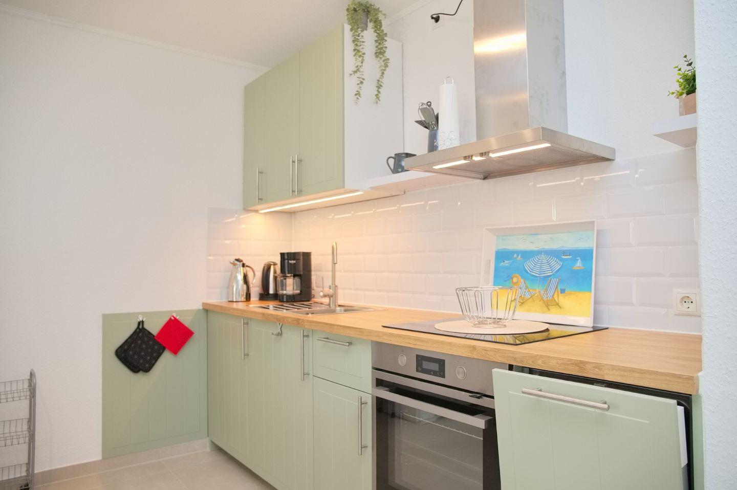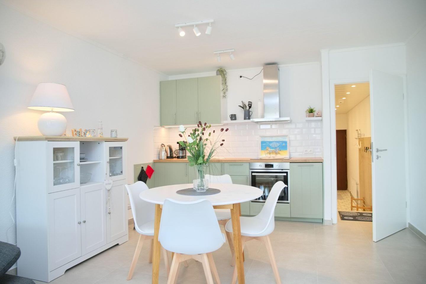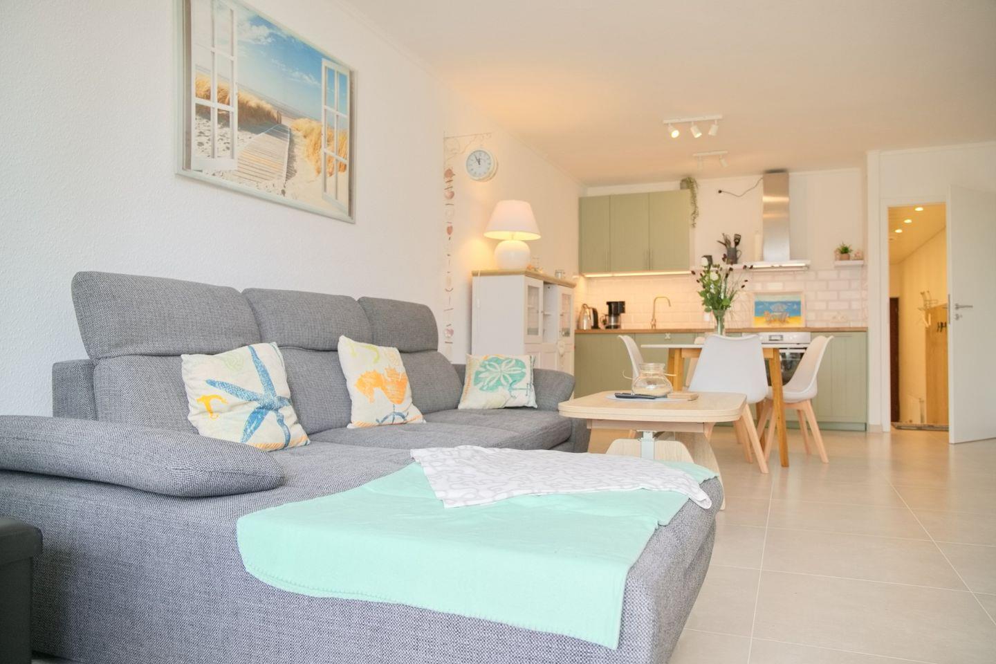 Die Unterkunft mit einer Gesamtgröße von 48 m² bietet Platz für bis zu vier Personen und verfügt über ein stilvoll eingerichtetes Schlafzimmer und ein geräumiges Wohnzimmer, das mit einer Sofaecke und einem Esstisch ausgestattet ist. Die offene Küche ist mit modernen Küchenutensilien ausgestattet, darunter ein Cerankochfeld, ein Backofen, eine Spülmaschine, ein Kühlschrank mit Gefrierfach sowie eine Kaffeemaschine und ein Wasserkocher. Hier können Sie Ihre Lieblingsgerichte zubereiten und im Essbereich gemeinsam genießen.