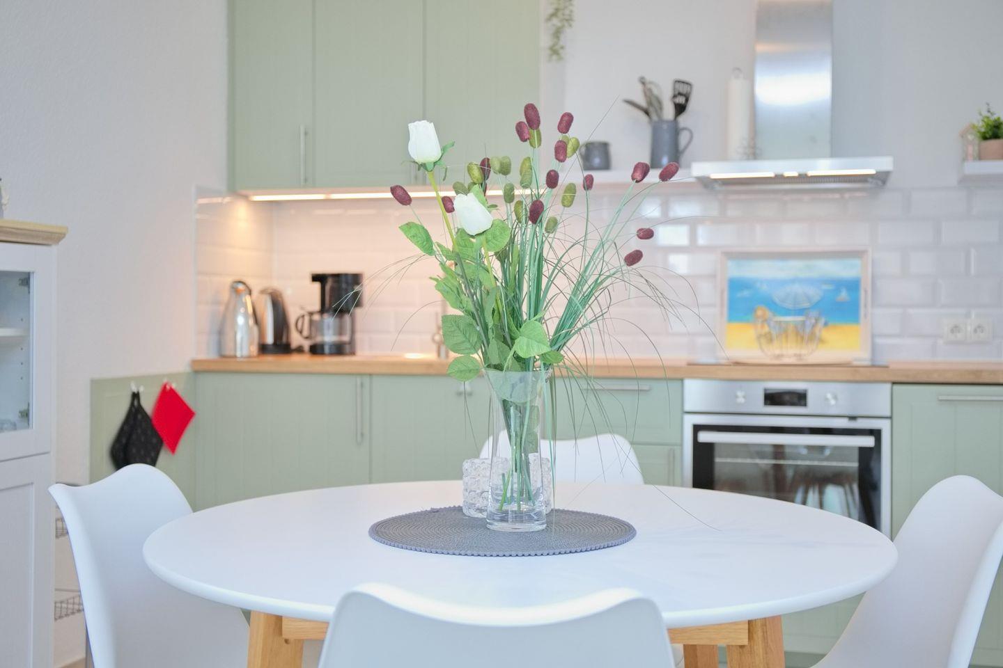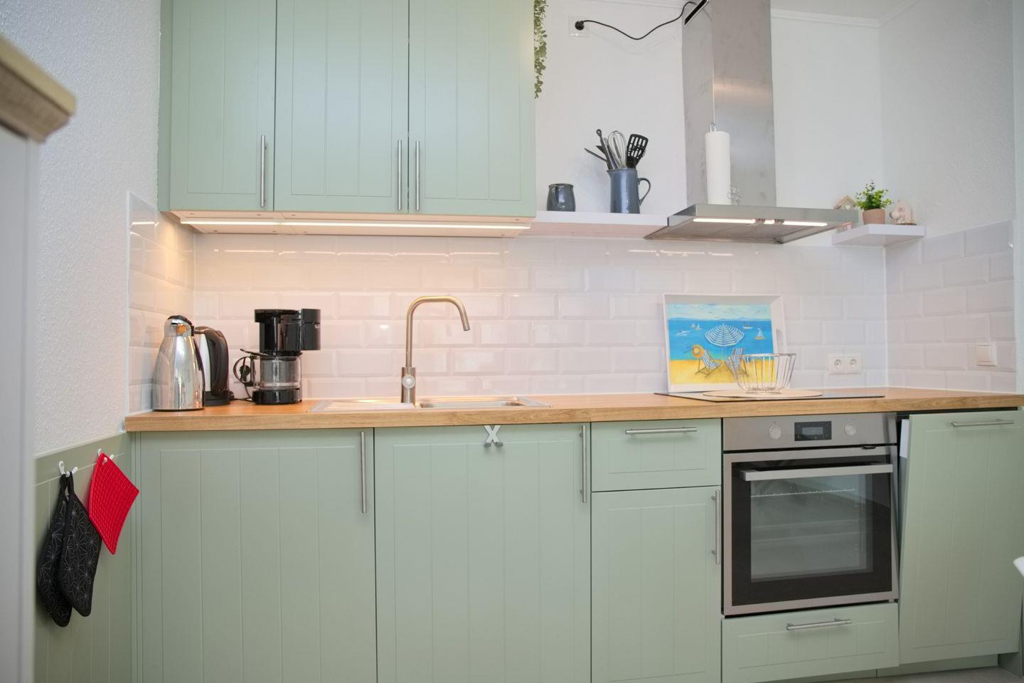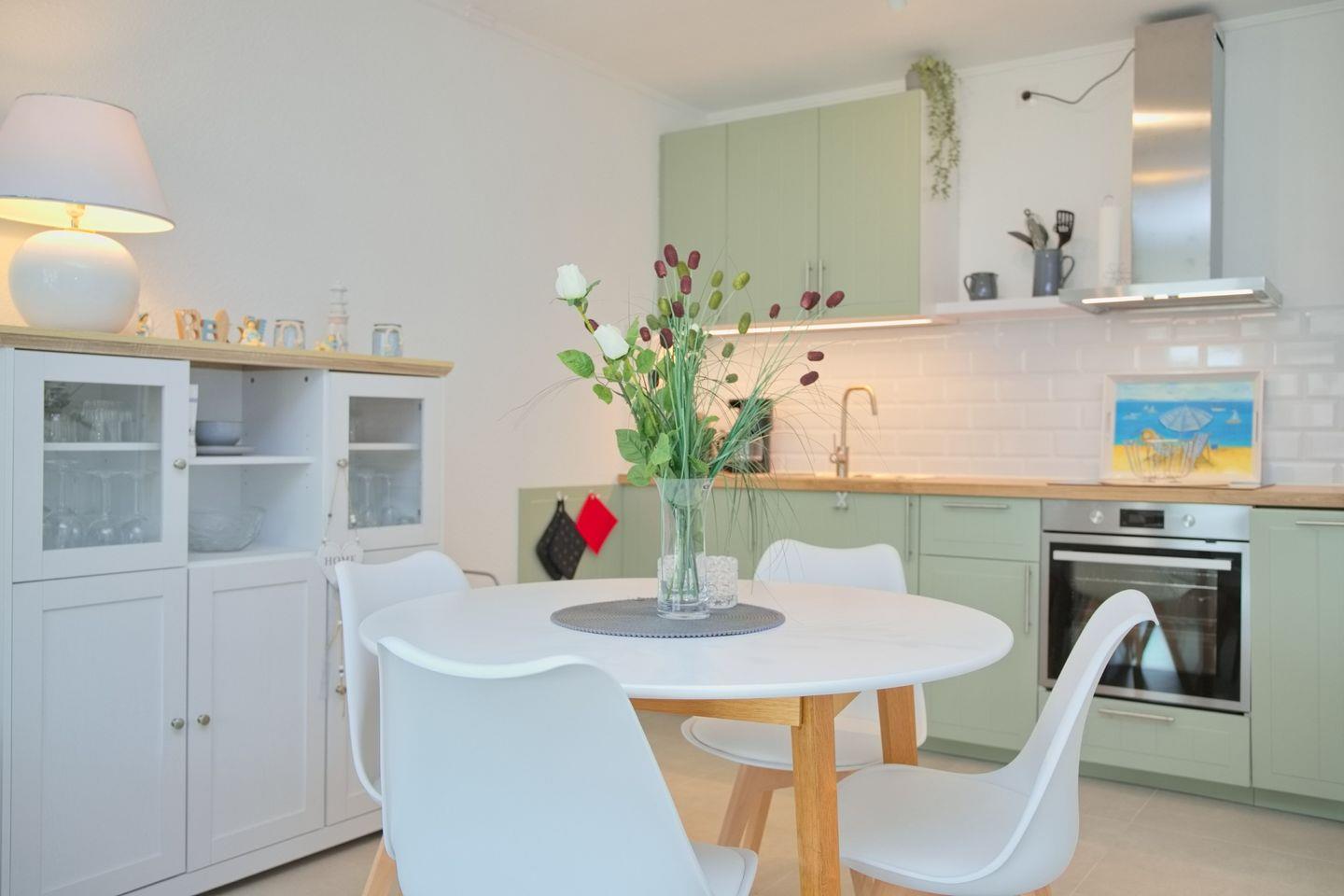 Die Unterkunft mit einer Gesamtgröße von 48 m² bietet Platz für bis zu vier Personen und verfügt über ein stilvoll eingerichtetes Schlafzimmer und ein geräumiges Wohnzimmer, das mit einer Sofaecke und einem Esstisch ausgestattet ist. Die offene Küche ist mit modernen Küchenutensilien ausgestattet, darunter ein Cerankochfeld, ein Backofen, eine Spülmaschine, ein Kühlschrank mit Gefrierfach sowie eine Kaffeemaschine und ein Wasserkocher. Hier können Sie Ihre Lieblingsgerichte zubereiten und im Essbereich gemeinsam genießen.