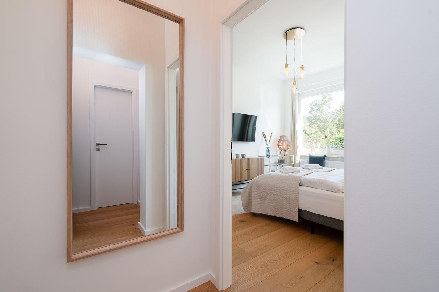 Stilvoll eingerichtet: 27?m² im Erdgeschoss mit Eichenparkett, Doppelbett, Esstisch, TV und offener Küche (Herd, Toaster, Wasserkocher, Kaffeemaschine). Vorflur mit Garderobe, Spiegel und Schuhregal. Modernes Bad mit ebenerdiger Dusche, WC, Waschbecken, Spiegel und Föhn. Ideal für Paare oder Alleinreisende!