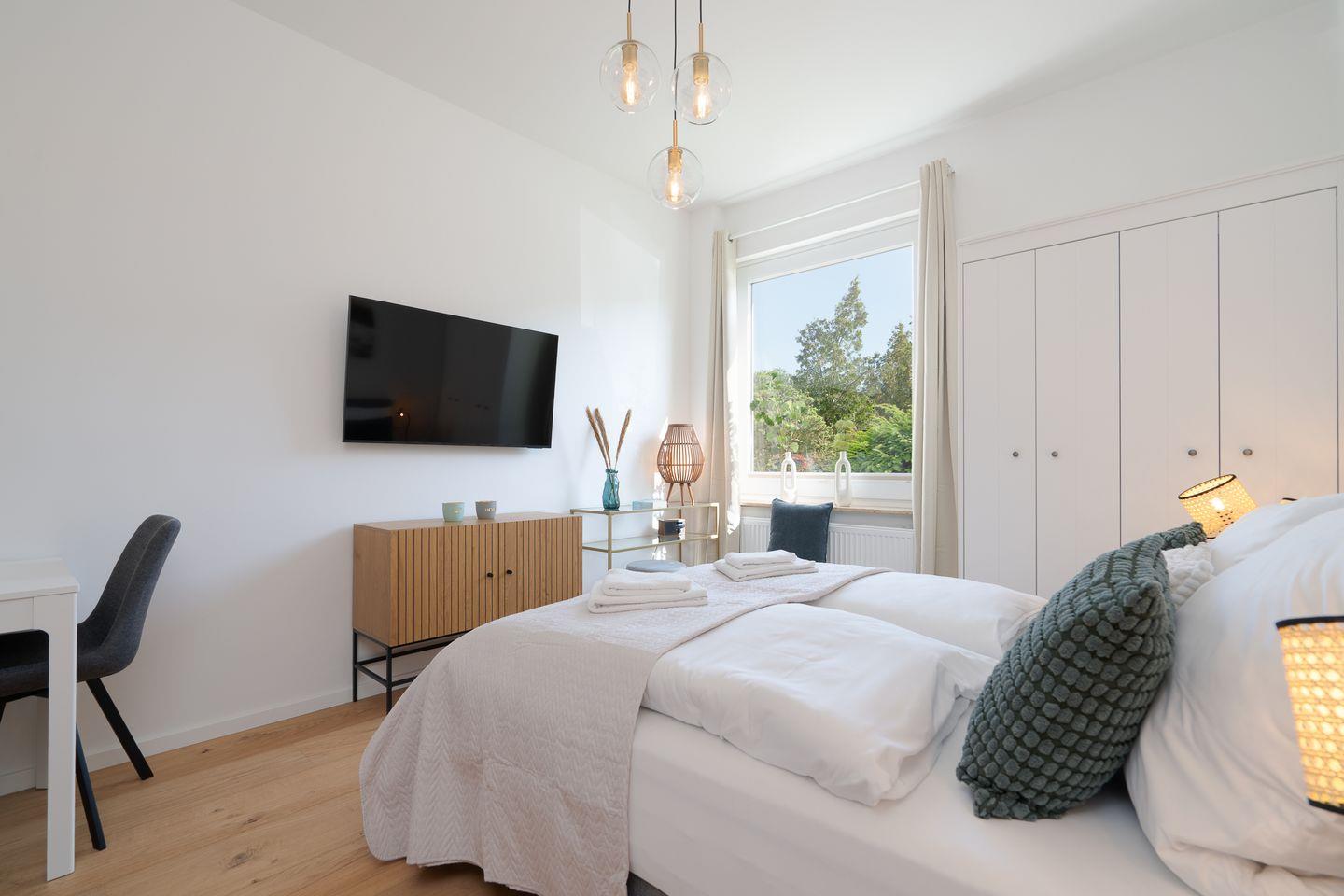 Eine Kommode bietet zusätzlichen Stauraum, und für Ihre Unterhaltung sorgt ein modernes TV-Gerät.