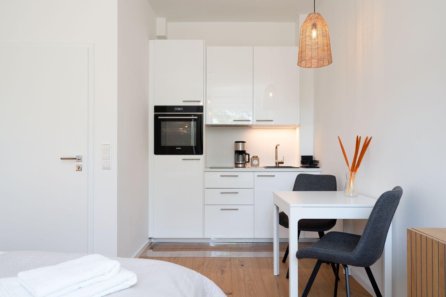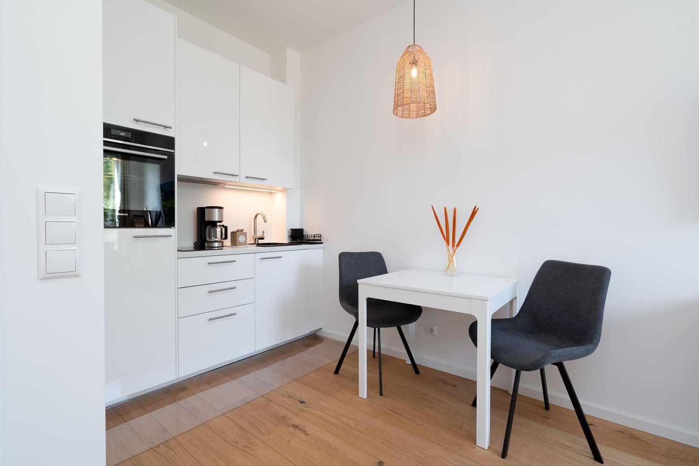 Die offene Küche ist kompakt und funktional, ausgestattet mit allem, was Sie für Ihren Aufenthalt benötigen: Herd, Wasserkocher, Toaster und Kaffeemaschine stehen bereit, damit Sie sich ganz wie zu Hause fühlen können.