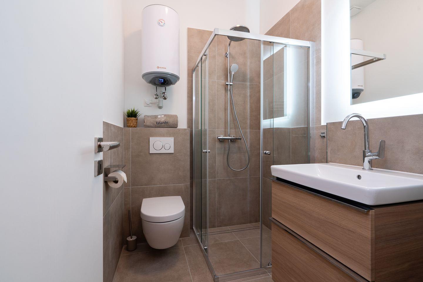 Das modern gestaltete Badezimmer verfügt über eine ebenerdige Dusche, WC, Waschbecken, Spiegel sowie einen Föhn – alles, was Sie für einen angenehmen Start in den Tag brauchen.