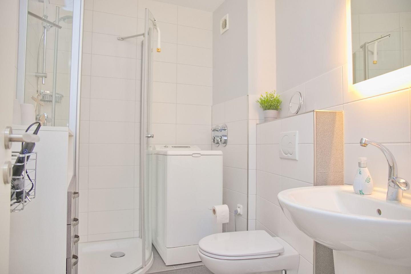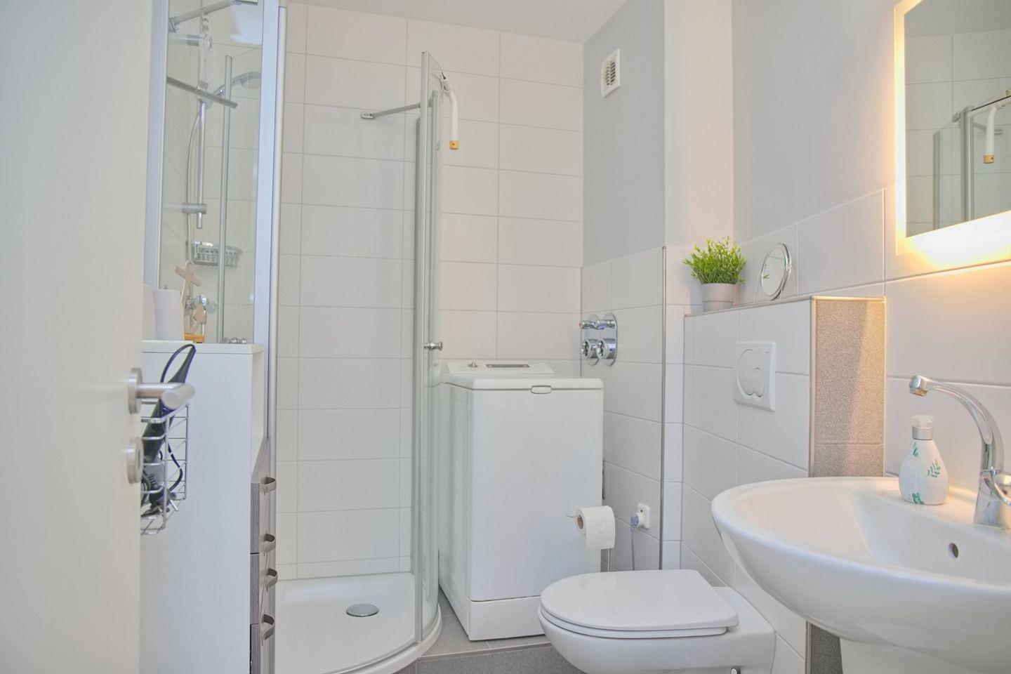 Das moderne Badezimmer verfügt über eine Dusche mit flachem Einstieg, ein WC, ein Waschbecken, einen Kosmetikspiegel, einen Föhn sowie einen praktischen Waschtrockner zur alleinigen Nutzung.