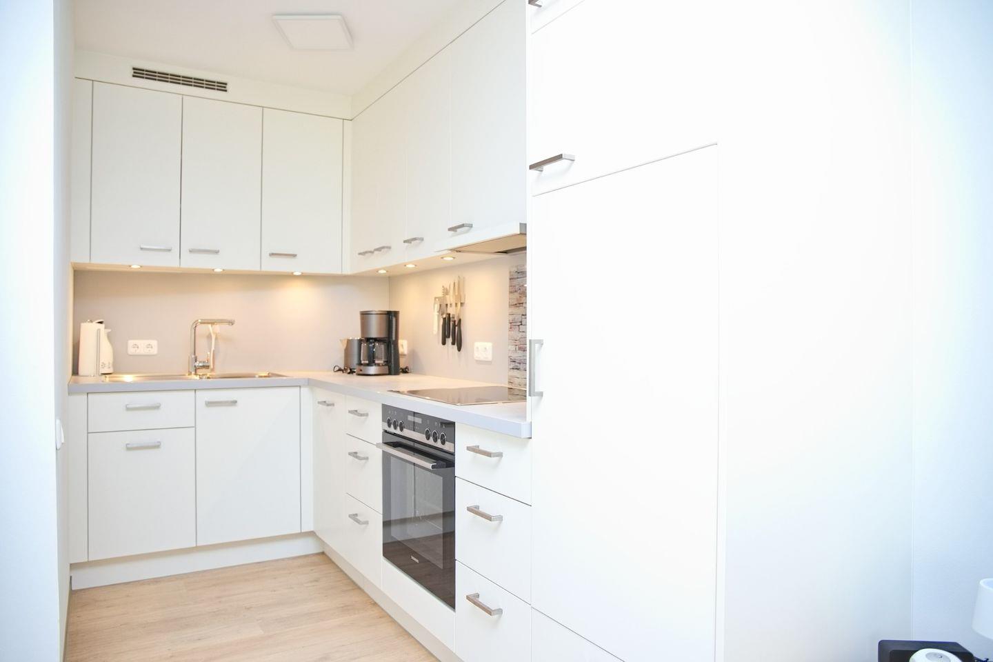 Die offene Küche lässt keine Wünsche offen: Ceranfeld, Backofen, Geschirrspüler, Mikrowelle, Kühlschrank mit Gefrierfach, Kaffeemaschine, Toaster und Wasserkocher stehen Ihnen zur Verfügung.