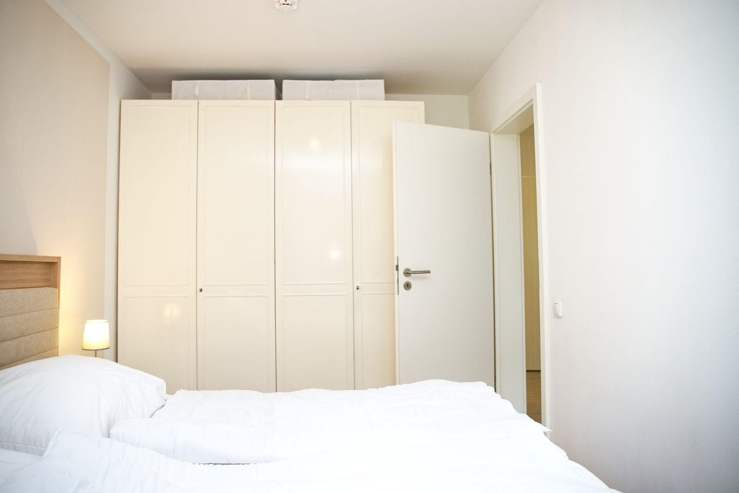 Das gemütliche Schlafzimmer ist mit einem komfortablen Doppelbett (180x200 cm) und einem geräumigen Kleiderschrank ausgestattet – perfekt für erholsame Nächte.