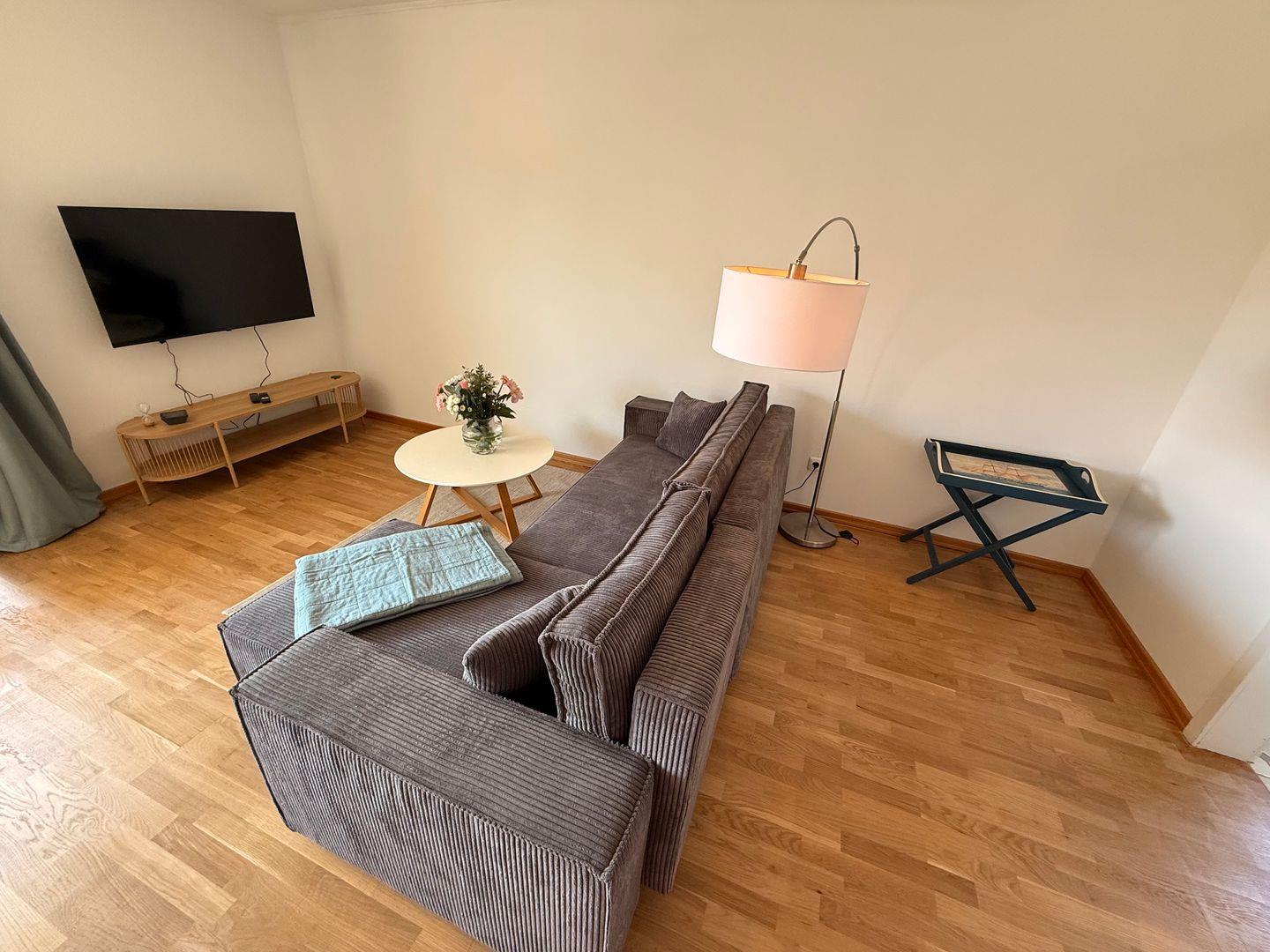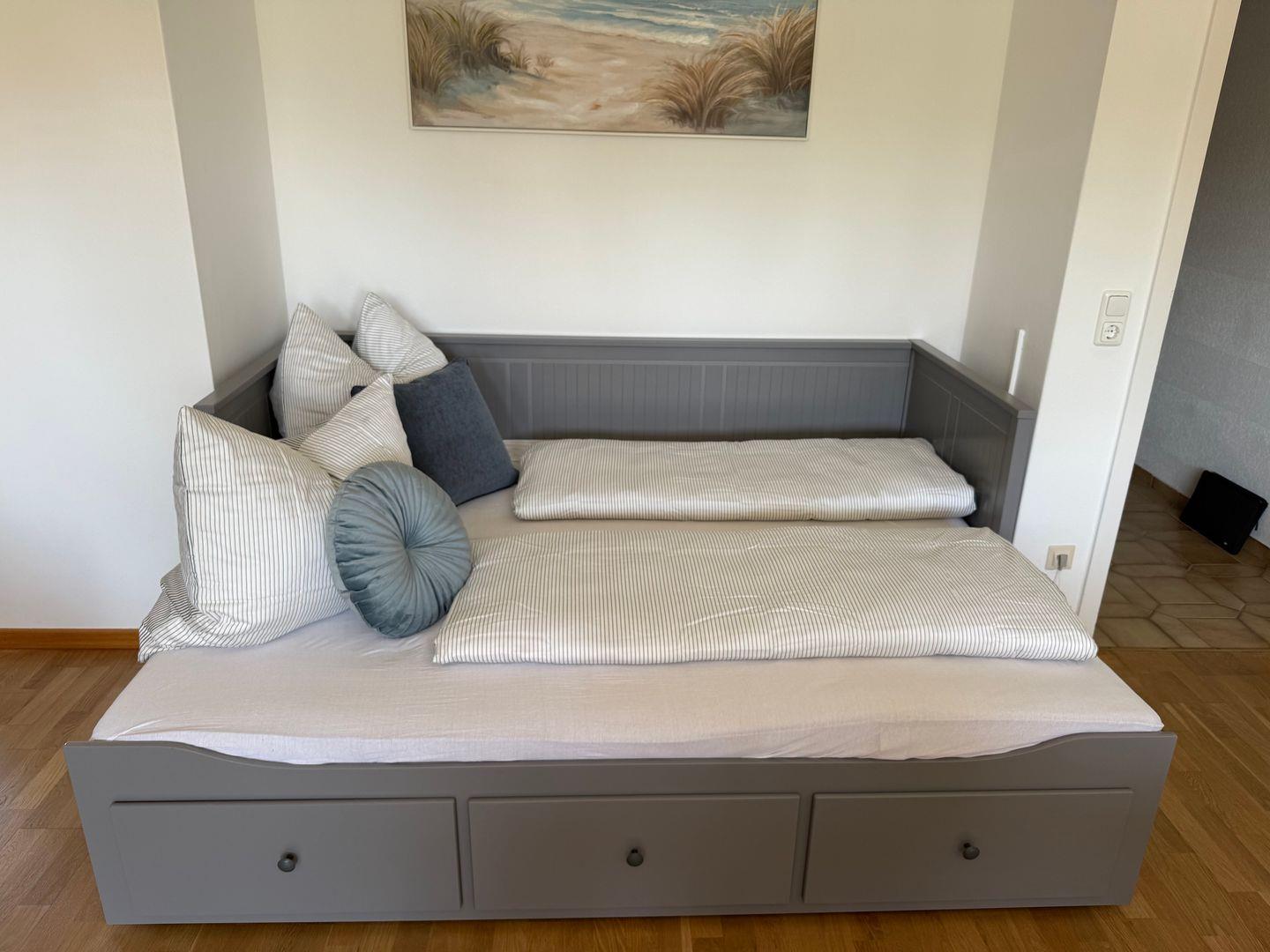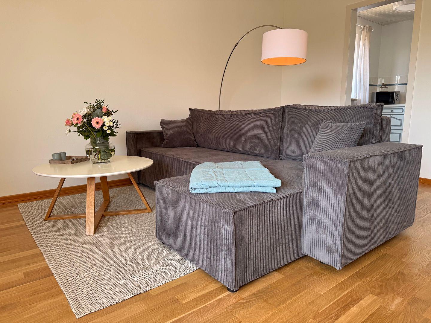 Das helle und gemütliche Wohnzimmer bietet Ihnen eine Sofaecke (Schlafsofa 140cm Breite) mit Smart-TV, kostenlosen WLAN-Zugang, einen Essbereich und ein zusätzliches Bett, welches sich im Handumdrehen in ein komfortables Doppelbett verwandeln lässt (2x80cm Matratzen).