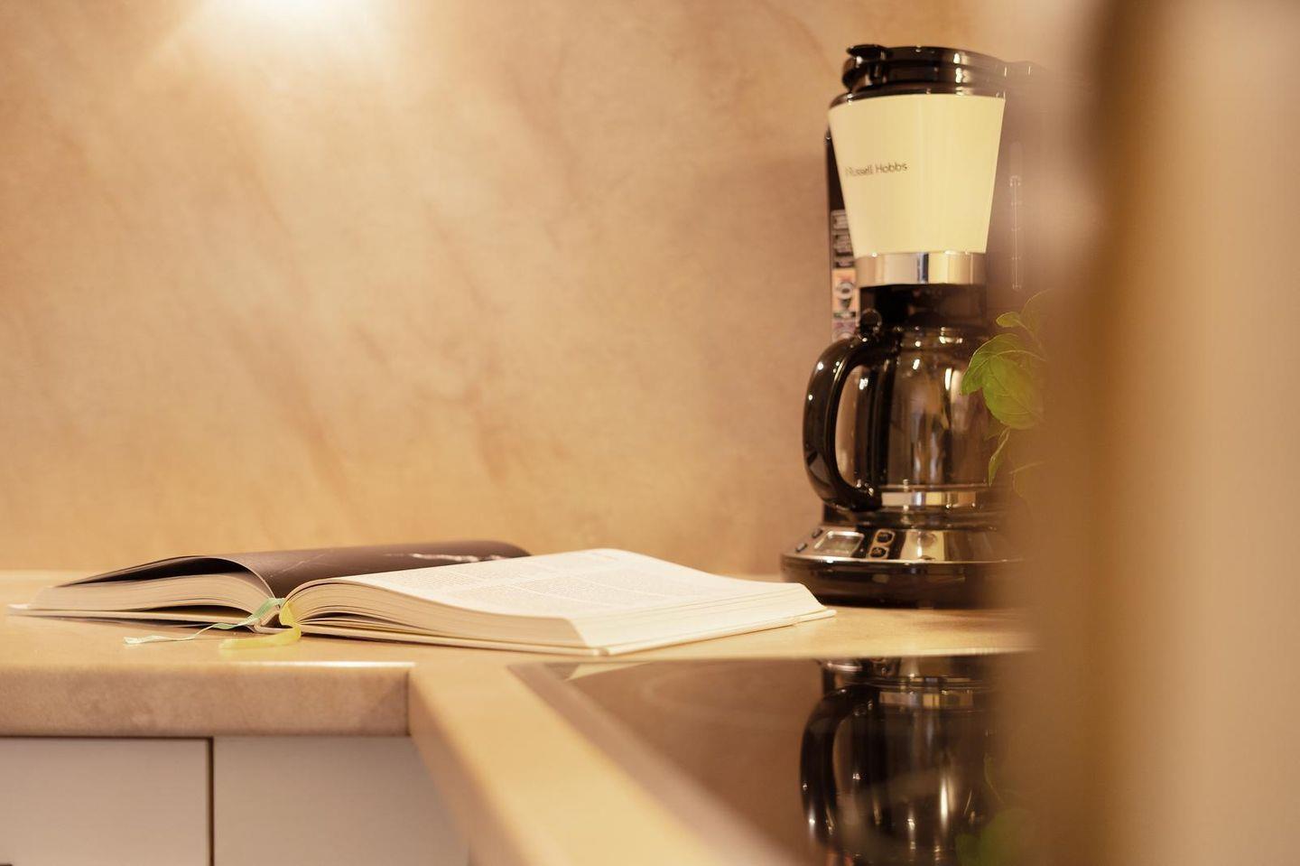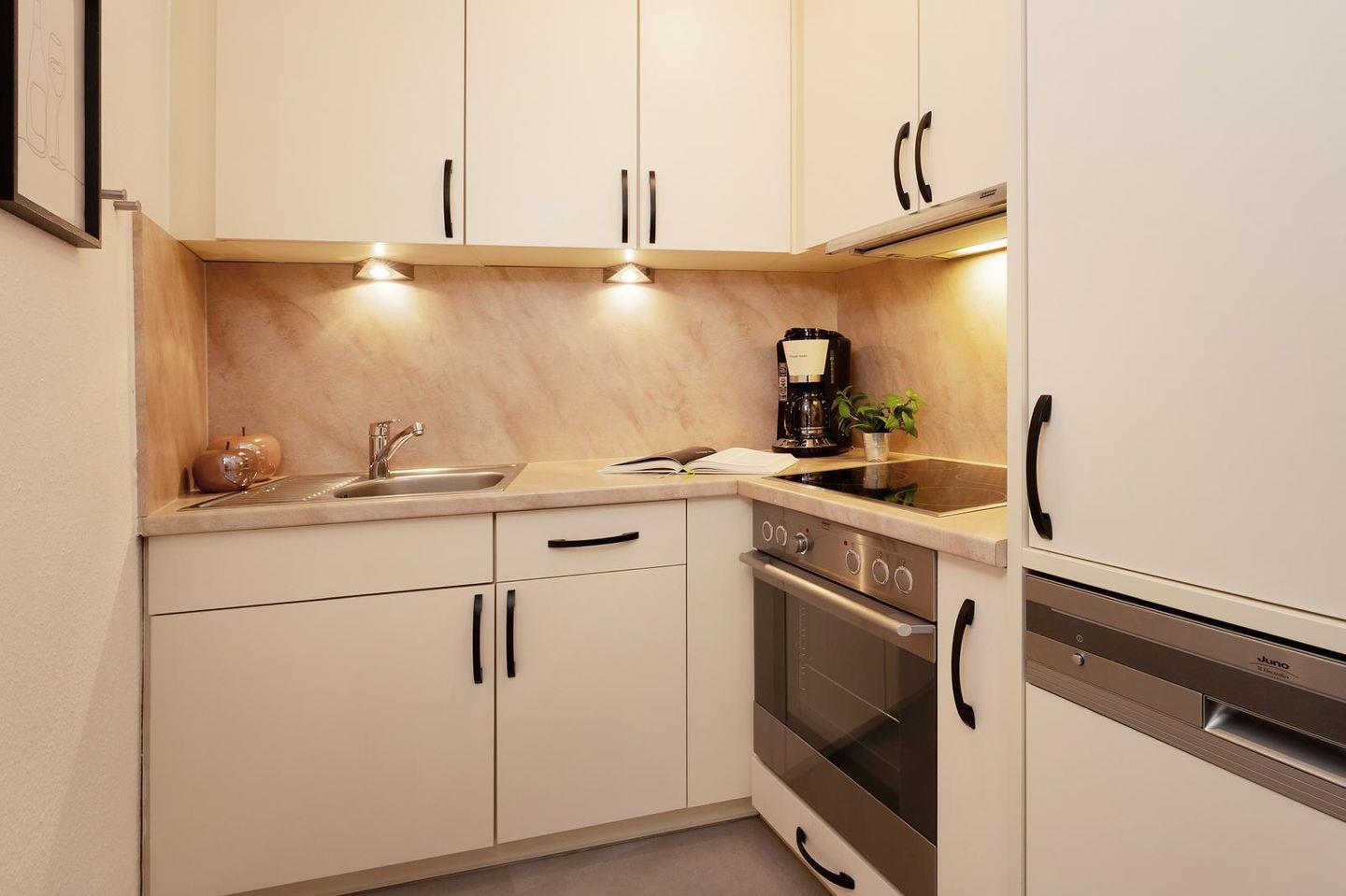Die moderne Küche lässt mit Ceranherd, Backofen, Mikrowelle, Kühlschrank (mit integriertem Gefrierfach), Spülmaschine, Wasserkocher, Toaster und Kaffeemaschine keine Wünsche offen. Geschirr, Besteck und alle notwendigen Küchenutensilien sind selbstverständlich vorhanden.