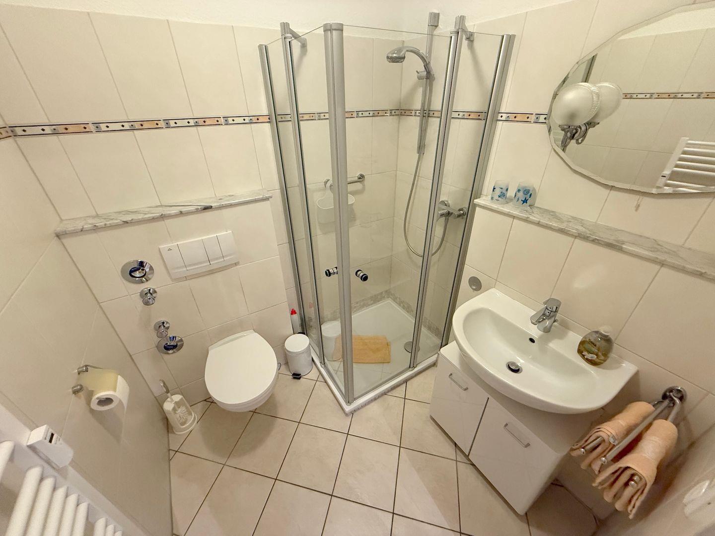 Das Badezimmer ist mit einem WC, einer Dusche, Waschbecken und Spiegel und einer Handtuchheizung ausgestattet.