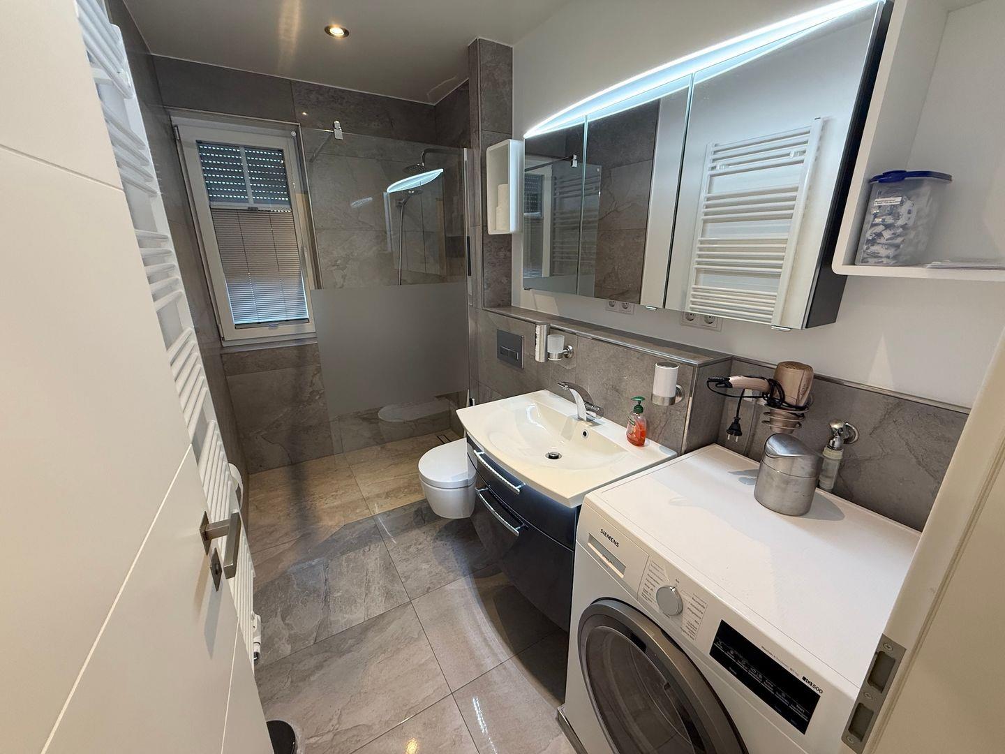 Im Badezimmer erwartet Sie eine großzügige ebenerdige Walk-In-Dusche, ein großer Spiegelschrank und ein Handtuchheizkörper.