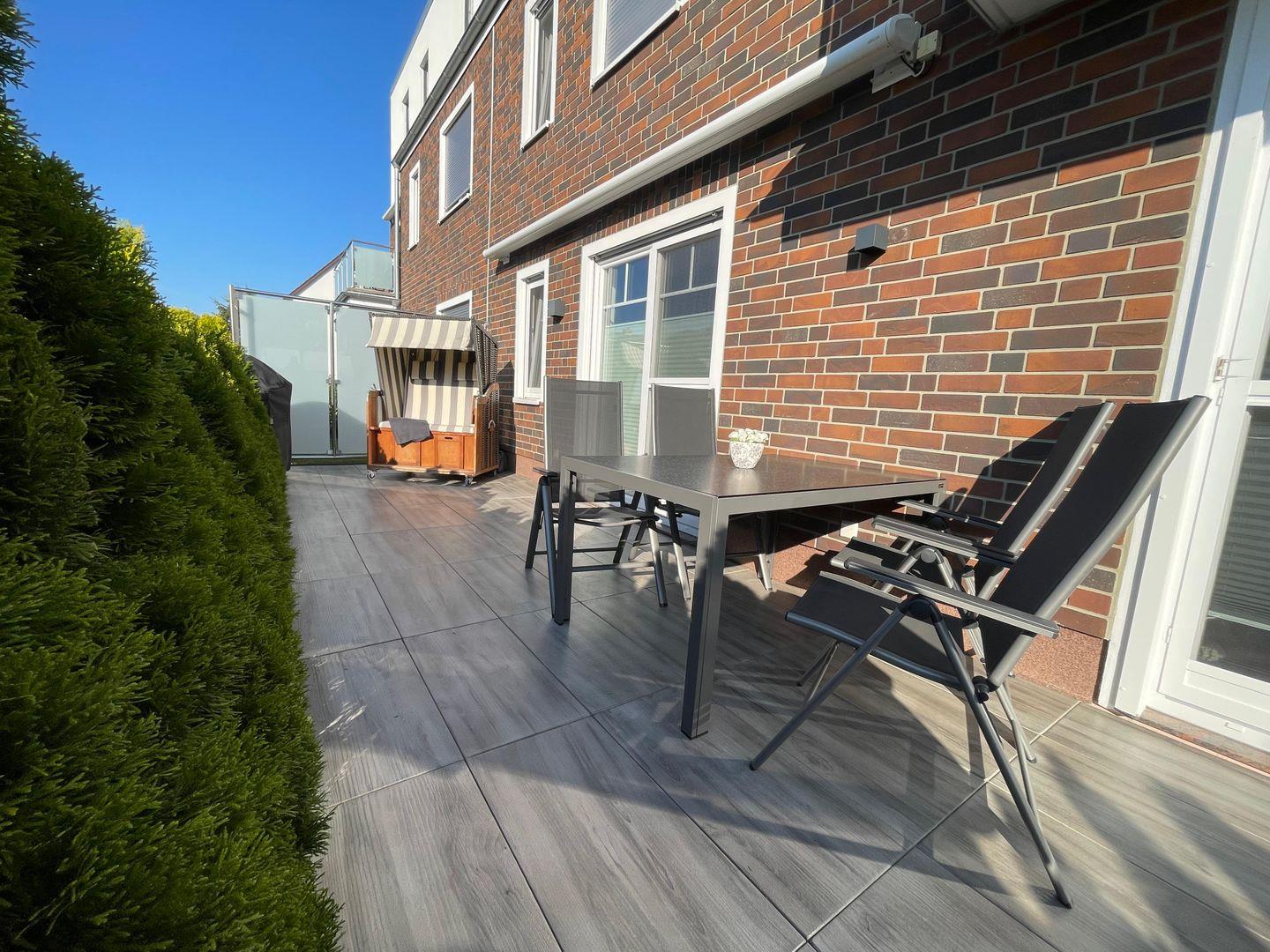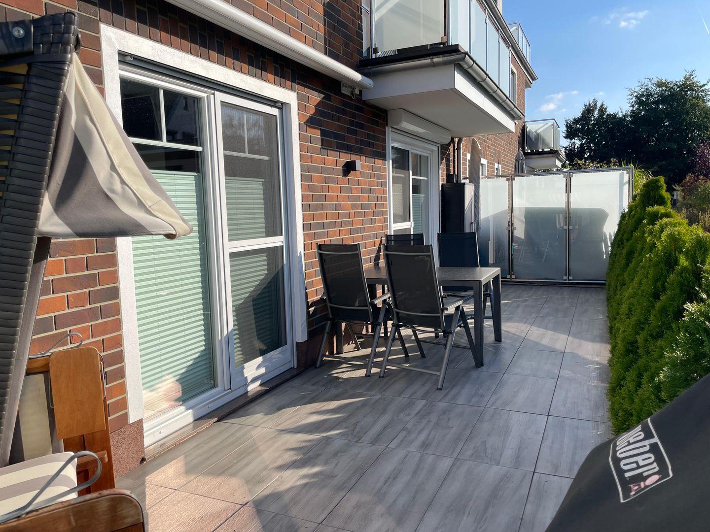 Highlight dieser barrierefreundlichen Erdgeschosswohnung ist die großzügige und nach Süd-Westen ausgerichtete Terrasse. Hier erwarten Sie ein gemütlicher Strandkorb, ein großer Esstisch, ein Gasgrill, eine elektrische Markise und außen Beleuchtung.