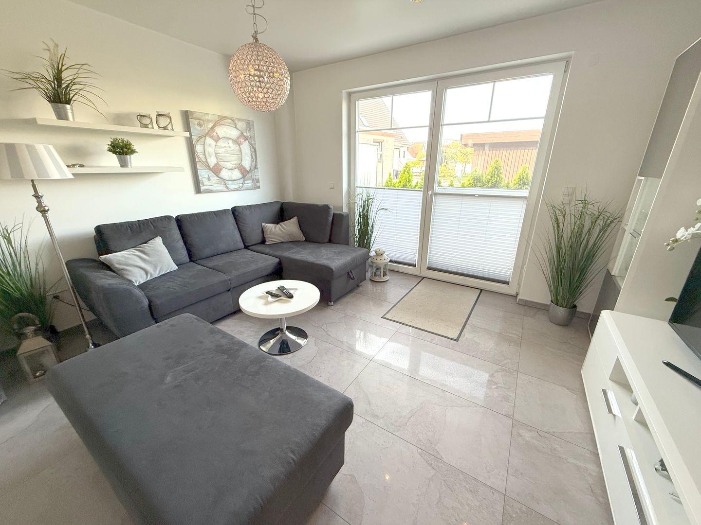 Komfortable Ferienwohnung in Grömitz mit Terrasse, Strandkorb und moderner Ausstattung nahe dem Strand.