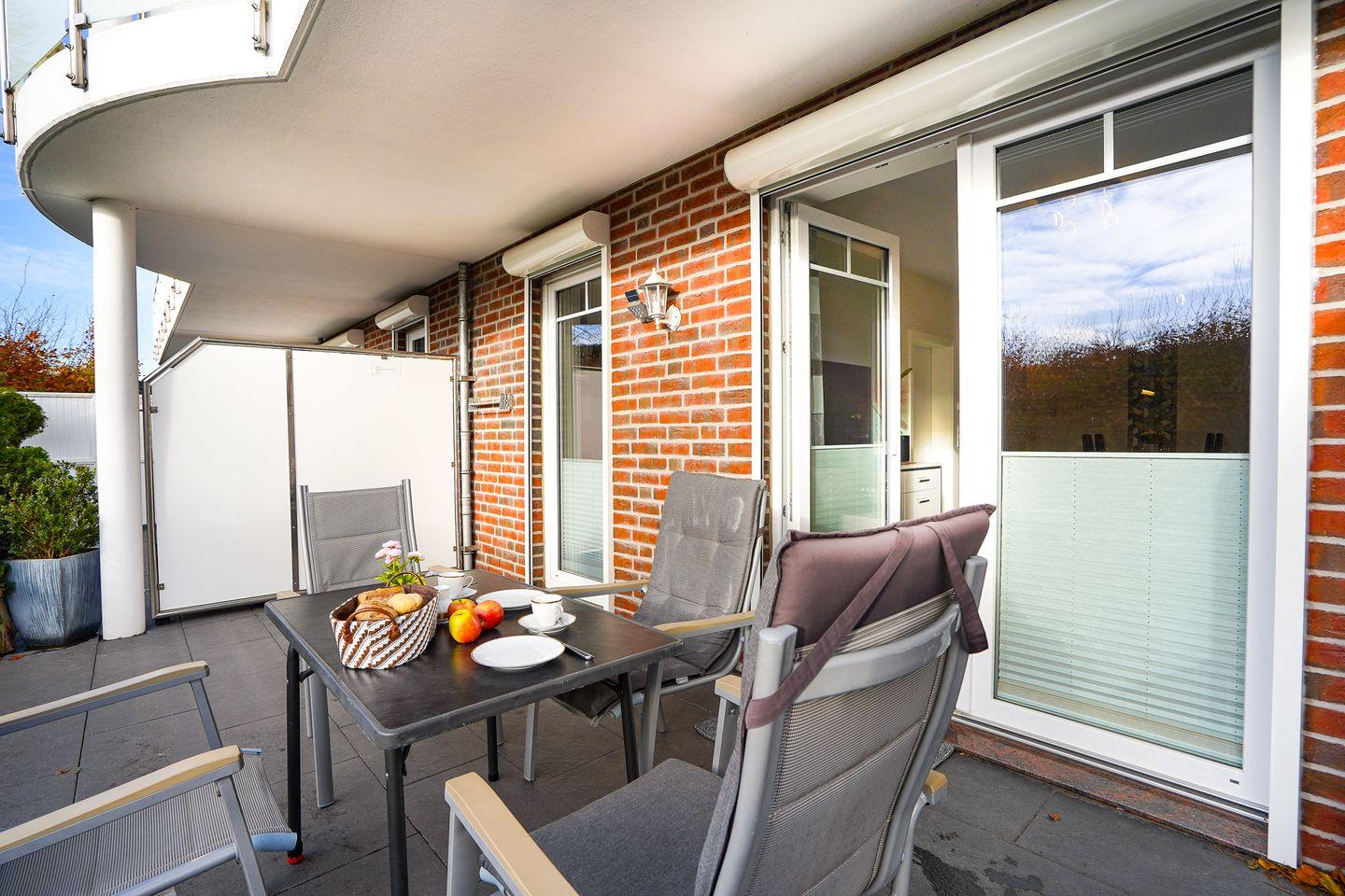 Entspannen Sie auf der eigenen Terrasse, die mit Gartenmöbeln ausgestattet ist. Hier können Sie die frische Ostseeluft und sonnige Stunden genießen, während der vorhandene Sonnenschutz für angenehme Schattierung sorgt. Für Ihr Fahrzeug steht ein kostenfreier Privatparkplatz direkt am Haus bereit.