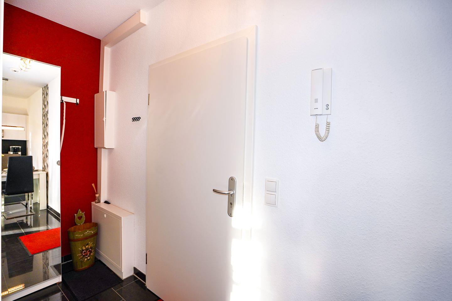 Das Badezimmer verfügt über eine Dusche, Waschbecken, Spiegel sowie ein WC. Für zusätzlichen Komfort stehen Ihnen nützliche Utensilien wie ein Ganzkörperspiegel, ein Wäscheständer, Staubsauger sowie eine Kommode zur Verfügung. Ein Sichtschutz an allen Fenstern gewährleistet Privatsphäre.