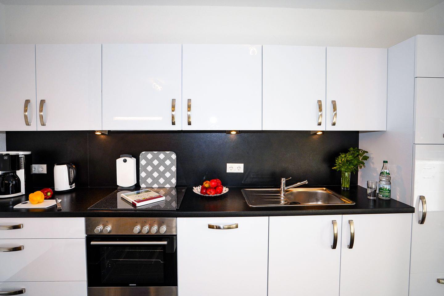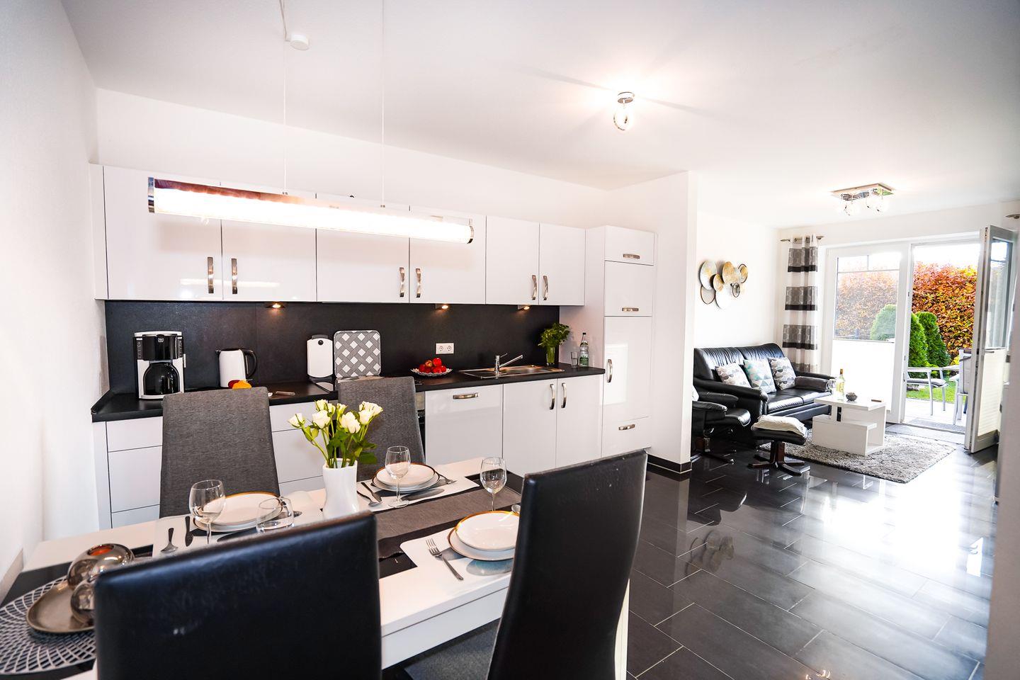 Die voll ausgestattete Küche mit Ceranherd, Backofen, Mikrowelle, Kühlschrank (mit Gefrierfach), Spülmaschine, Toaster, Kaffeemaschine, Wasserkocher und umfangreichen Küchenutensilien erfüllt sämtliche Wünsche für die Eigenversorgung. Der Essbereich lädt zu gemeinsamen Mahlzeiten ein.