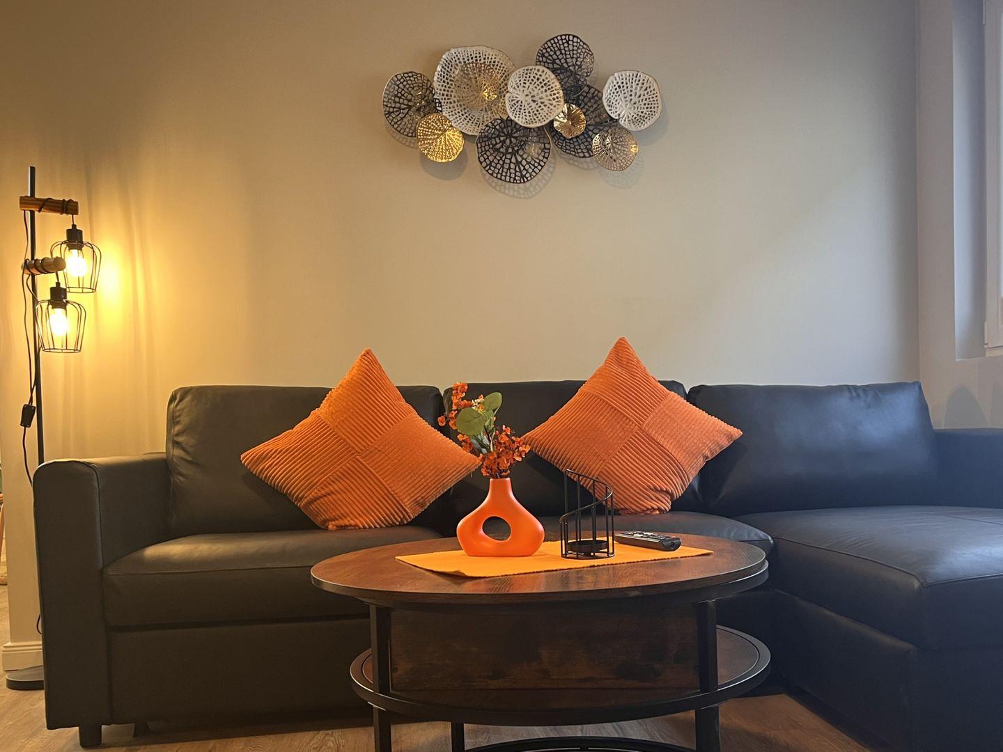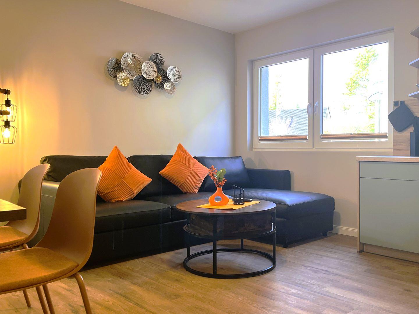 Die offene Küche ist modern ausgestattet mit Herd, Backofen, Kühlschrank, Gefrierfach, Wasserkocher, Kaffeemaschine, Toaster, Geschirr sowie Besteck und vielfältigen Küchenutensilien. Ein Esstisch lädt zum gemeinsamen Speisen ein. Für zusätzlichen Komfort sorgen Raucherfreiheit, Zentralheizung sowie Rauchmelder. Bettwäsche, Handtücher und Geschirrhandtücher werden gestellt, sodass Sie sich um nichts Weiteres kümmern müssen.
