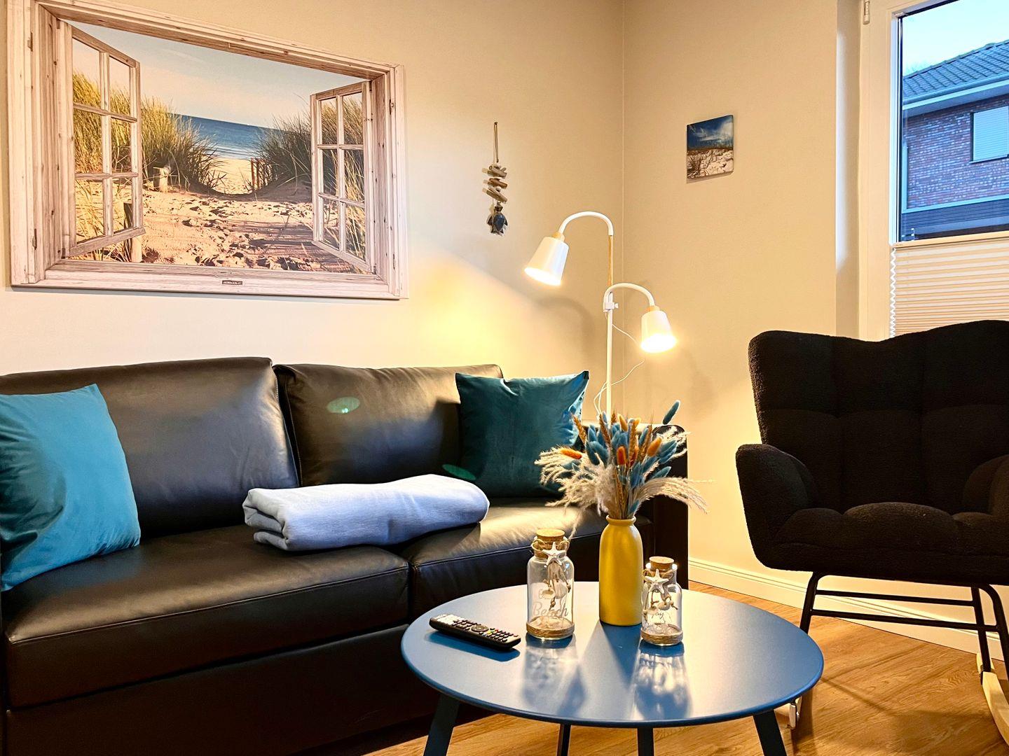 Das Apartment ist modern gestaltet und verfügt über eine offene Küche zum Wohnzimmer, die mit einer vollständigen Ausstattung überzeugt. Hierzu zählen ein Herd mit Backofen, Kühlschrank mit Gefrierfach, Kaffeemaschine, Wasserkocher, Toaster sowie Geschirr, Besteck und Küchenutensilien. Ein separater Esstisch schafft Platz für gemeinsame Mahlzeiten. Im Wohnbereich lädt ein komfortables Sofa zum Entspannen ein, ergänzt durch einen Fernseher. Die stilvolle Raumgestaltung wird durch ausgewählte Möbel, wie eine Kommode sowie eine praktische Garderobe, abgerundet.