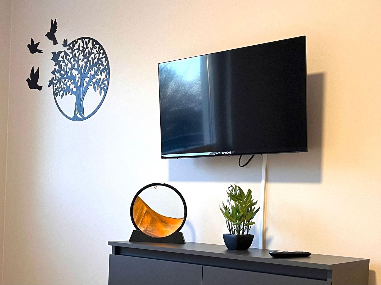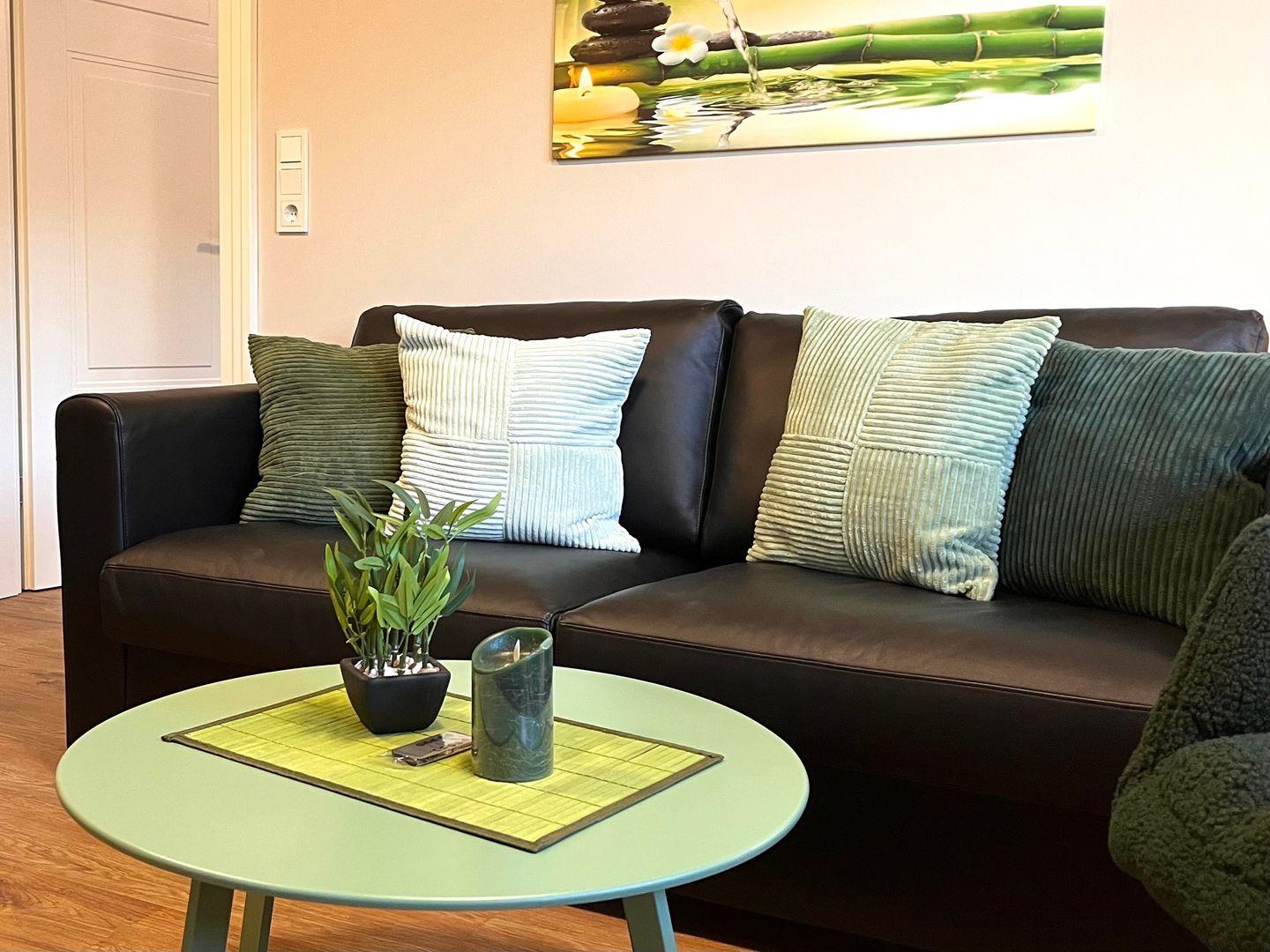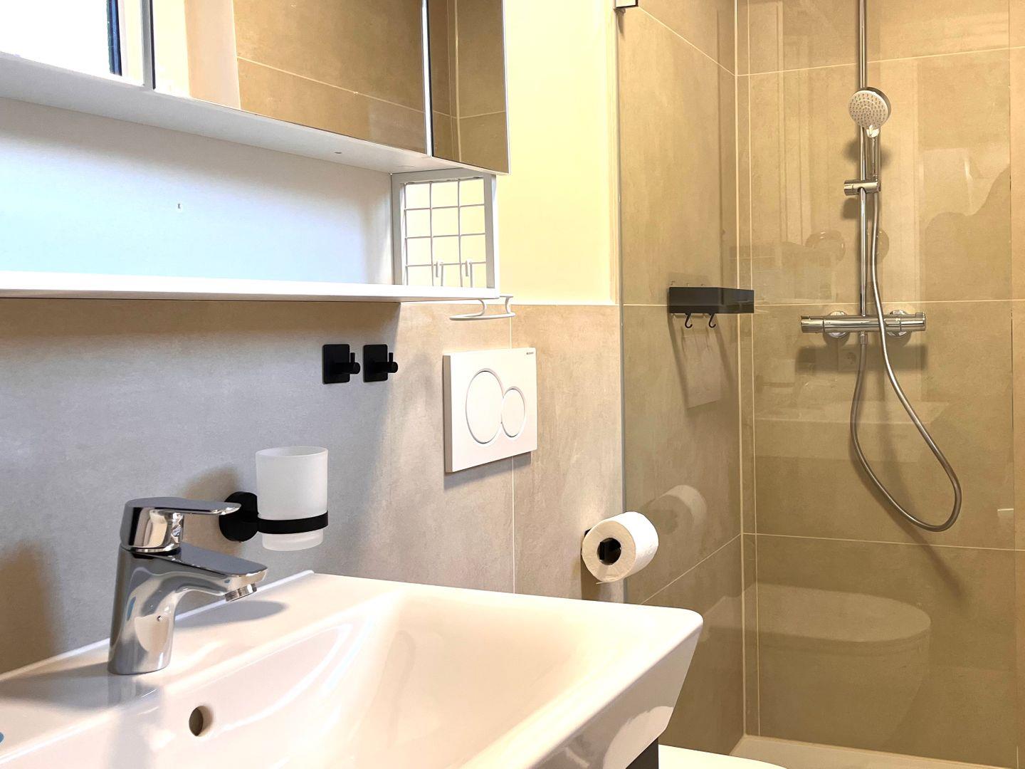 Das Appartement präsentiert sich modern und hochwertig ausgestattet. Die offene Küche geht nahtlos in das helle Wohnzimmer über und ist mit sämtlichen wichtigen Küchenutensilien ausgestattet. Dazu zählen ein Herd mit zwei Platten, Mikrowelle, Kühlschrank mit Gefrierfach, Kaffeemaschine, Wasserkocher, Toaster sowie Geschirr und Besteck. Für den Komfort auch im Alltag stehen ein Esstisch, ein gemütliches Sofa und eine Kommode zur Verfügung. Im Badezimmer erwartet Sie eine Dusche, ergänzt durch Waschbecken, Spiegel und einen Haartrockner.