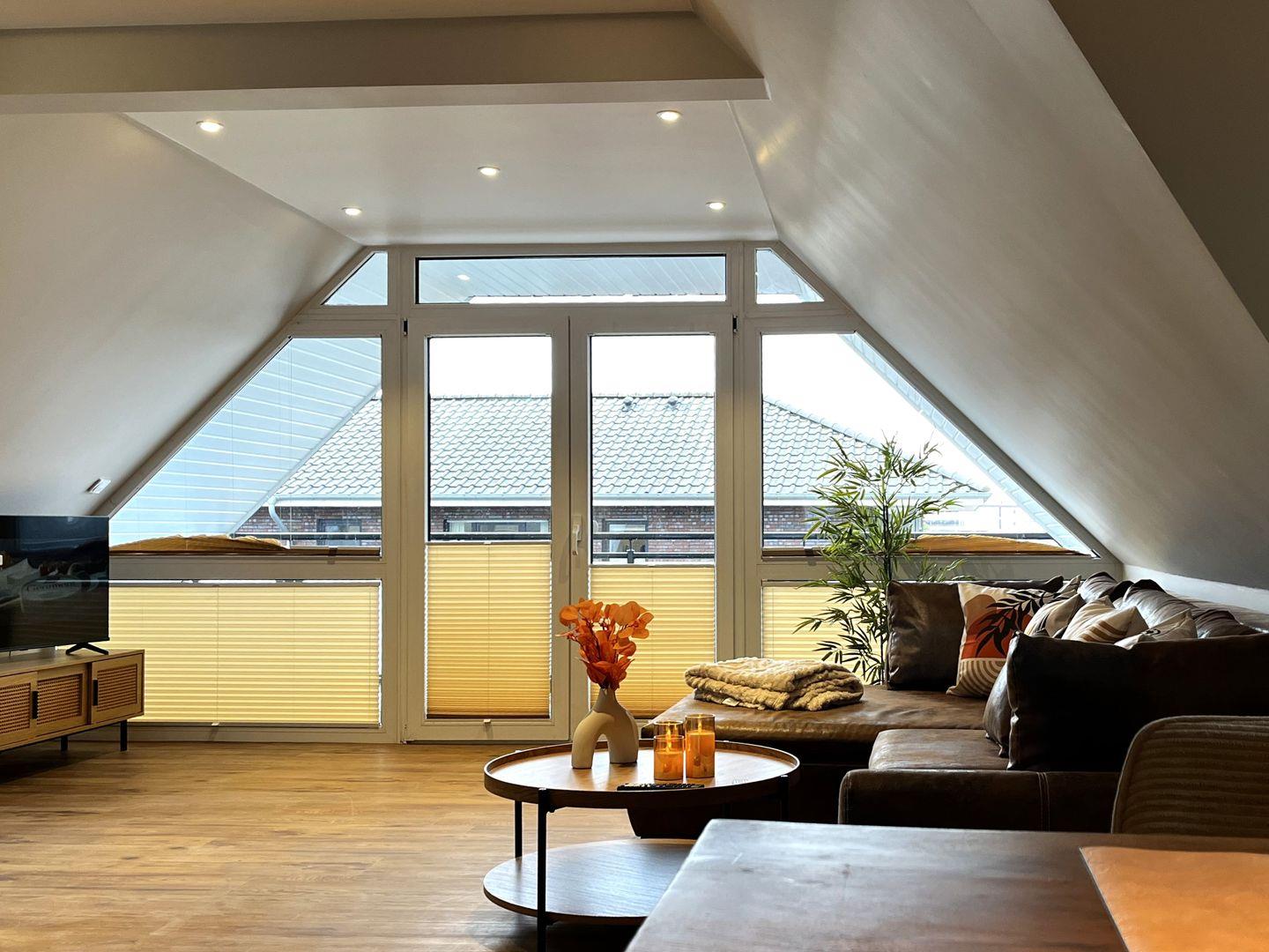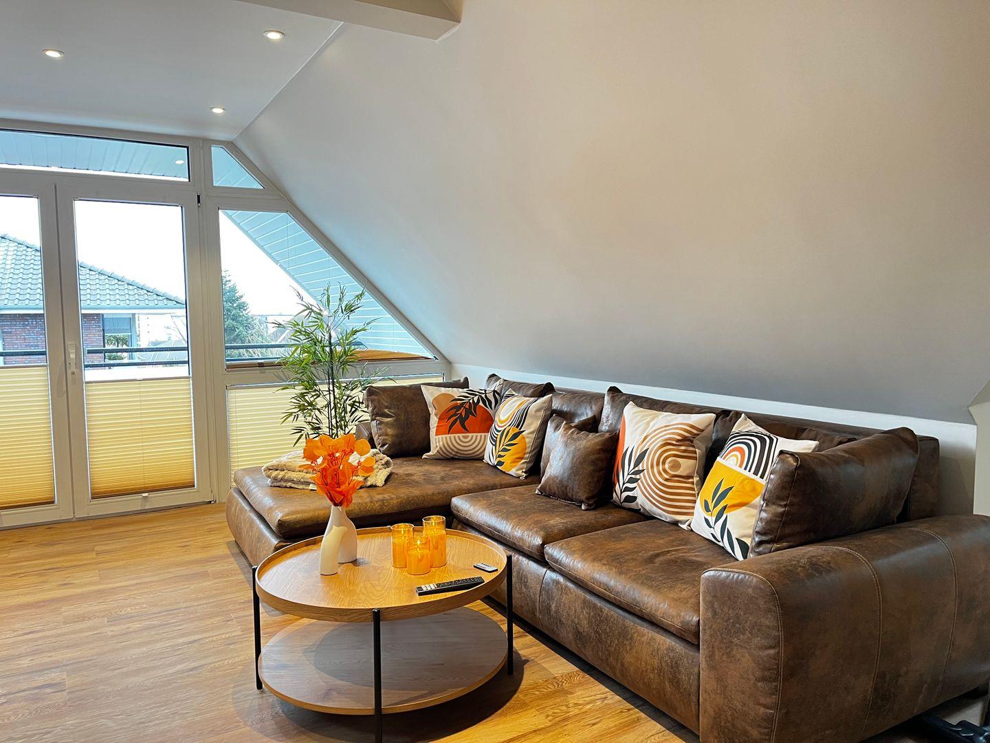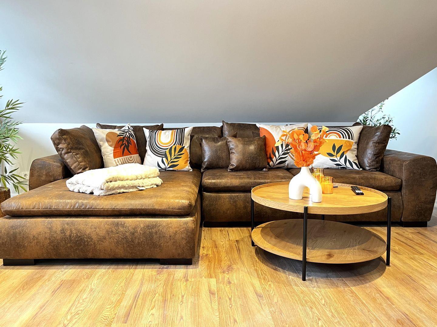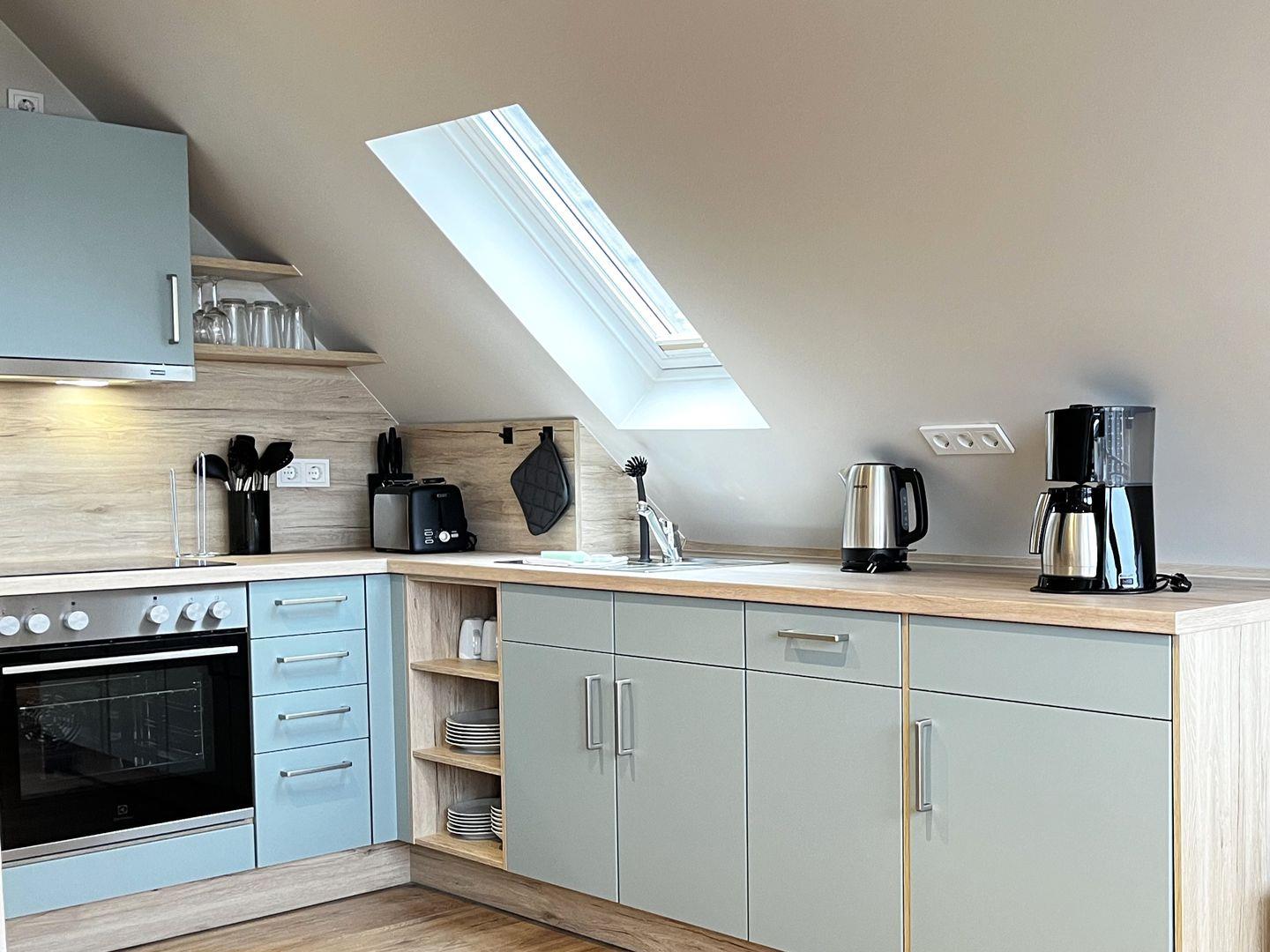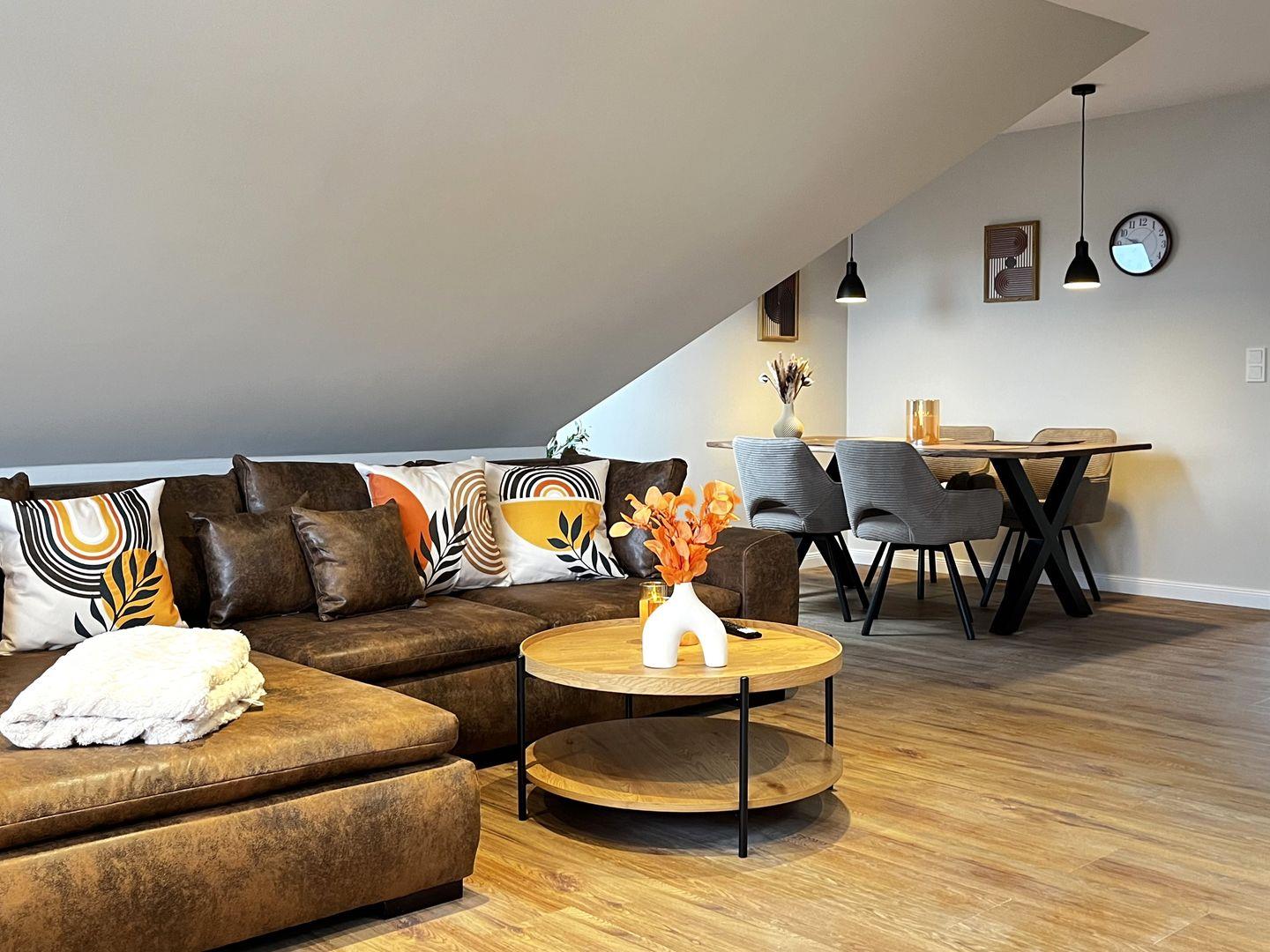 Der Wohnbereich ist freundlich gestaltet und verfügt über ein Wohnzimmer mit Sofaecke, Sofa, TV sowie einen Essbereich mit Esstisch. Die offene Küche ist in den Wohnraum integriert und gut ausgestattet. Ihnen stehen unter anderem Herd, Backofen, Kühlschrank, Gefrierfach, Kaffeemaschine, Wasserkocher, Toaster, Küchenutensilien sowie Geschirr und Besteck zur Verfügung. Damit sind die Voraussetzungen für eine unkomplizierte Selbstversorgung im Urlaub gegeben.