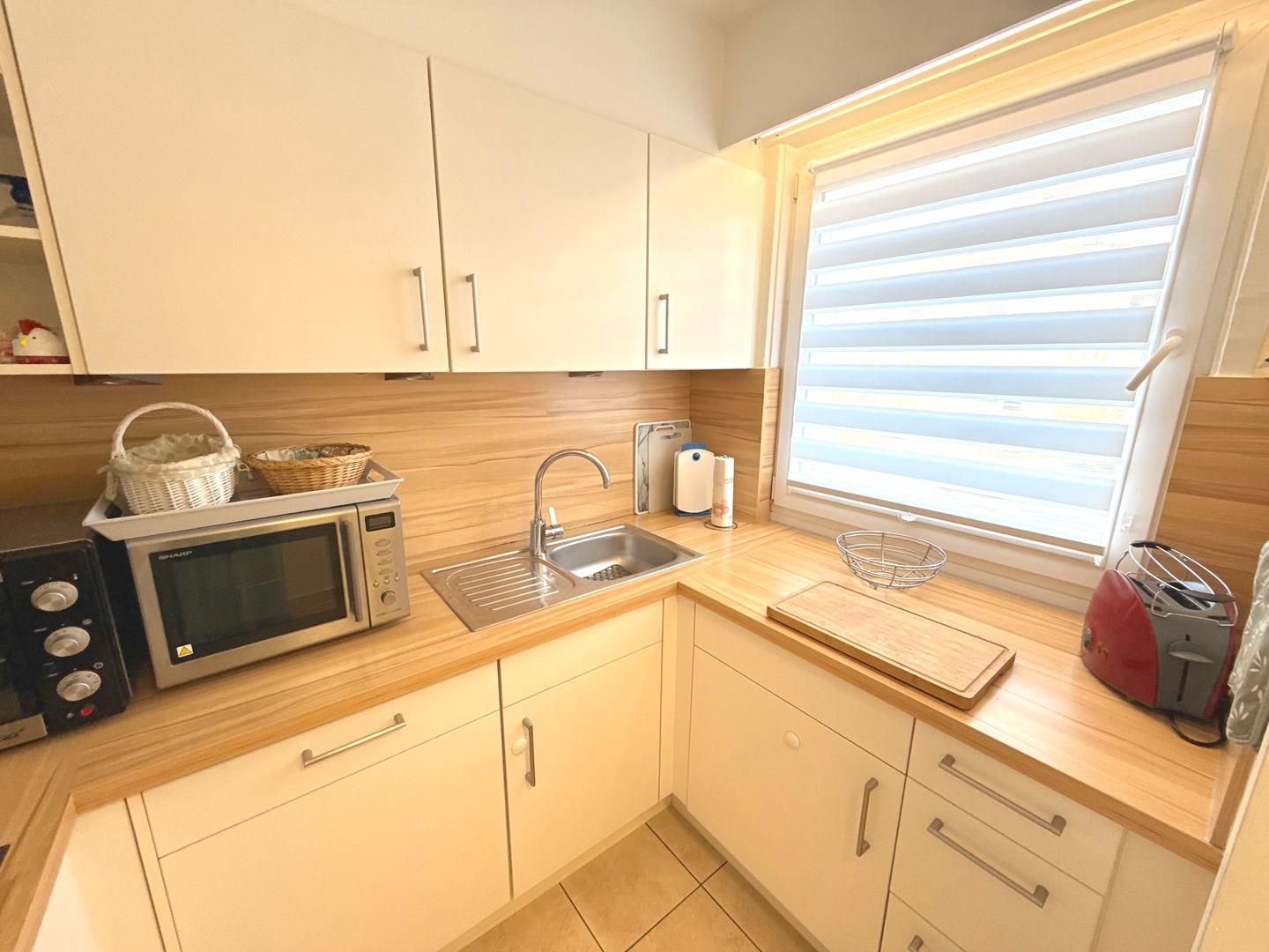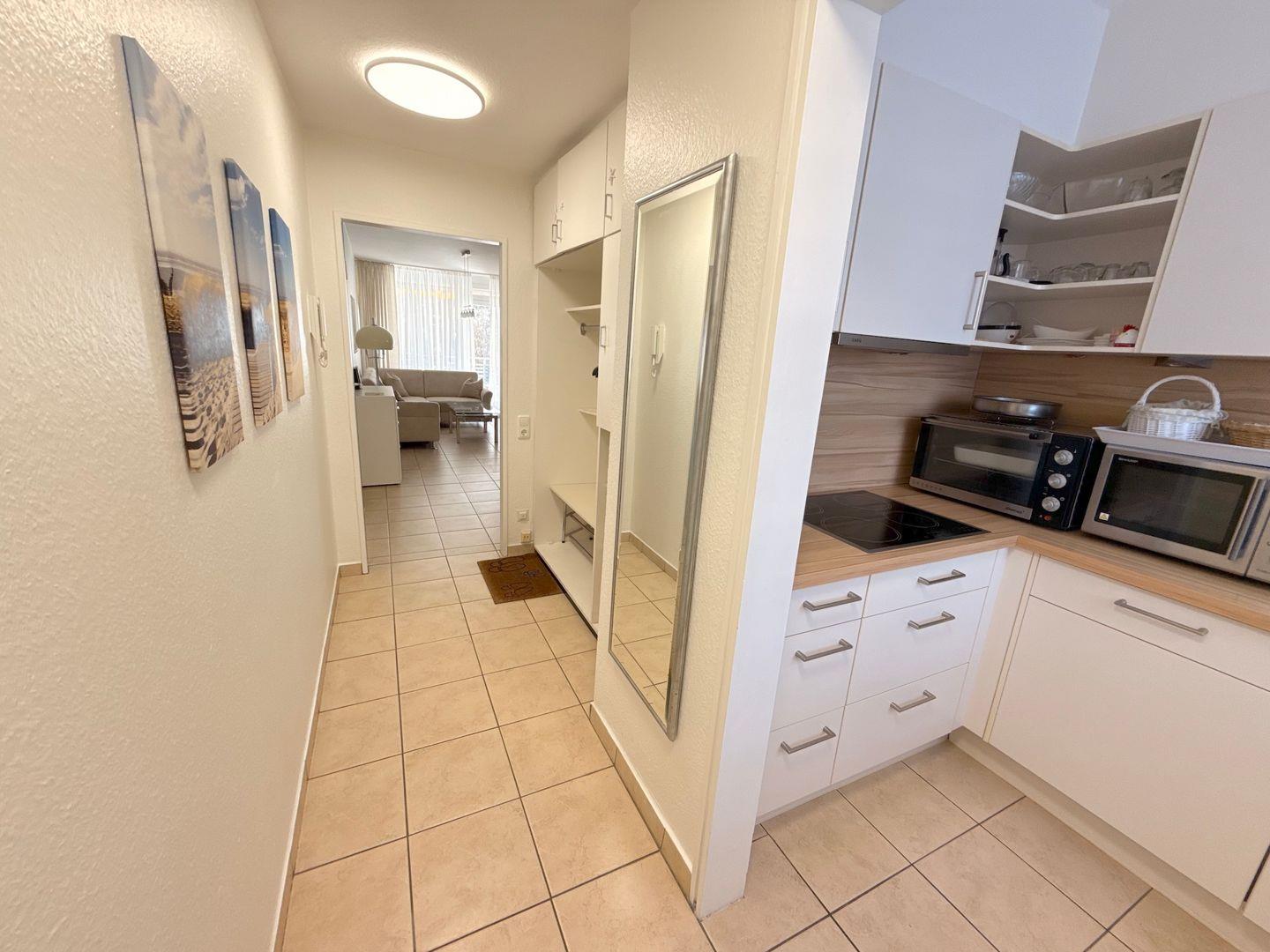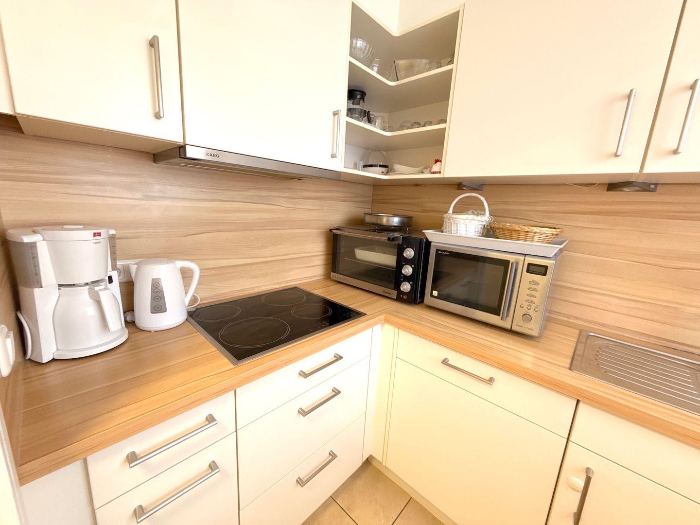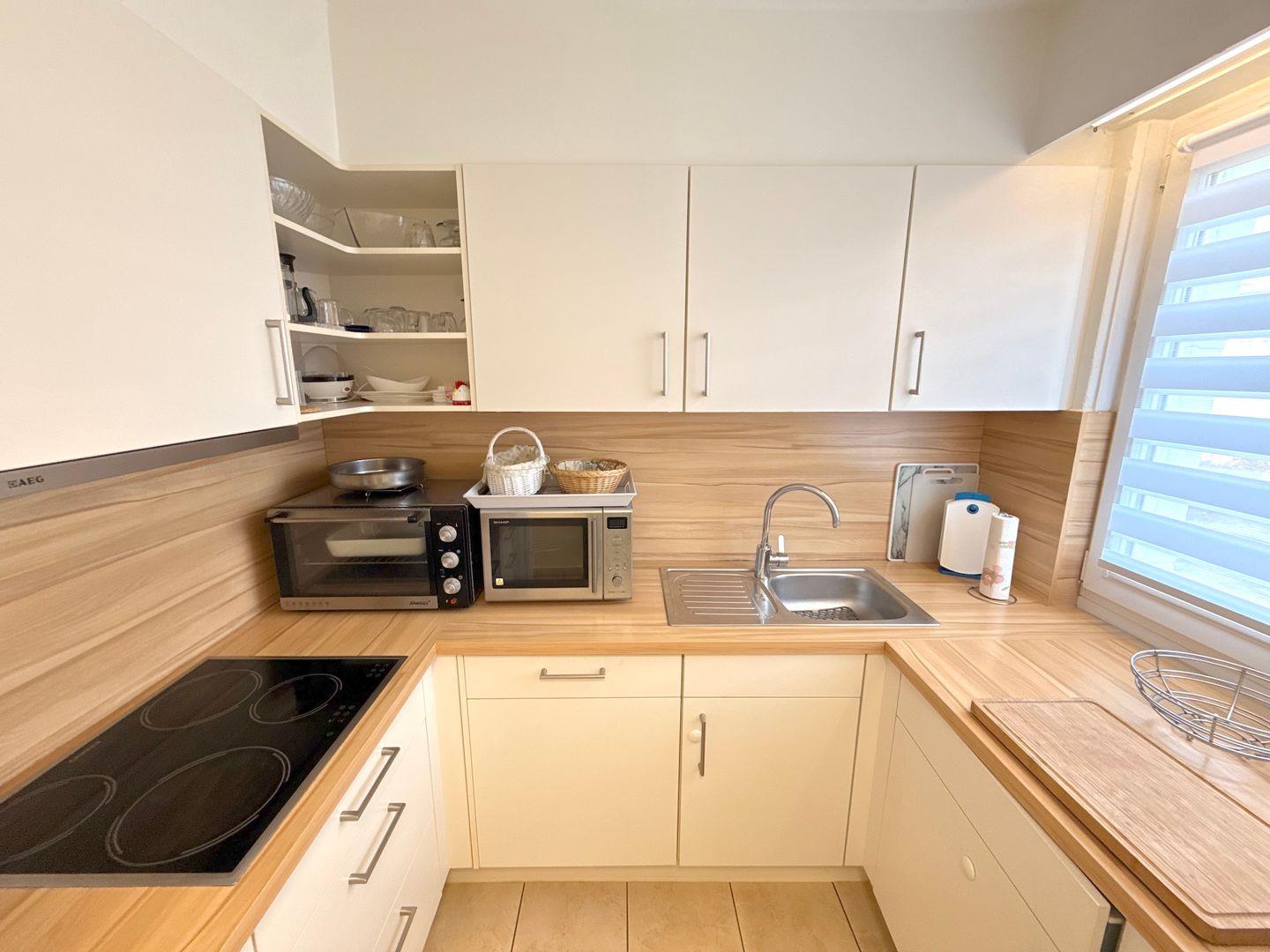 Die separate, helle Küche ist voll ausgestattet mit Induktionsherd, Geschirrspüler, Kühlschrank mit Gefrierfach, Mini-Backofen und Mikrowelle, sowie weitere grundlegende Küchenutensilien sind vorhanden – perfekt für Selbstversorger.