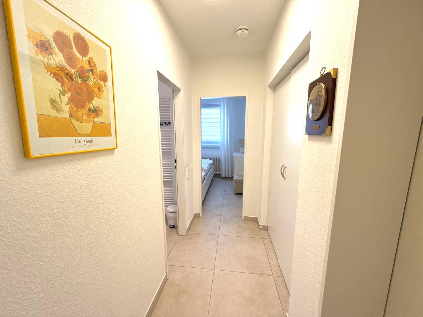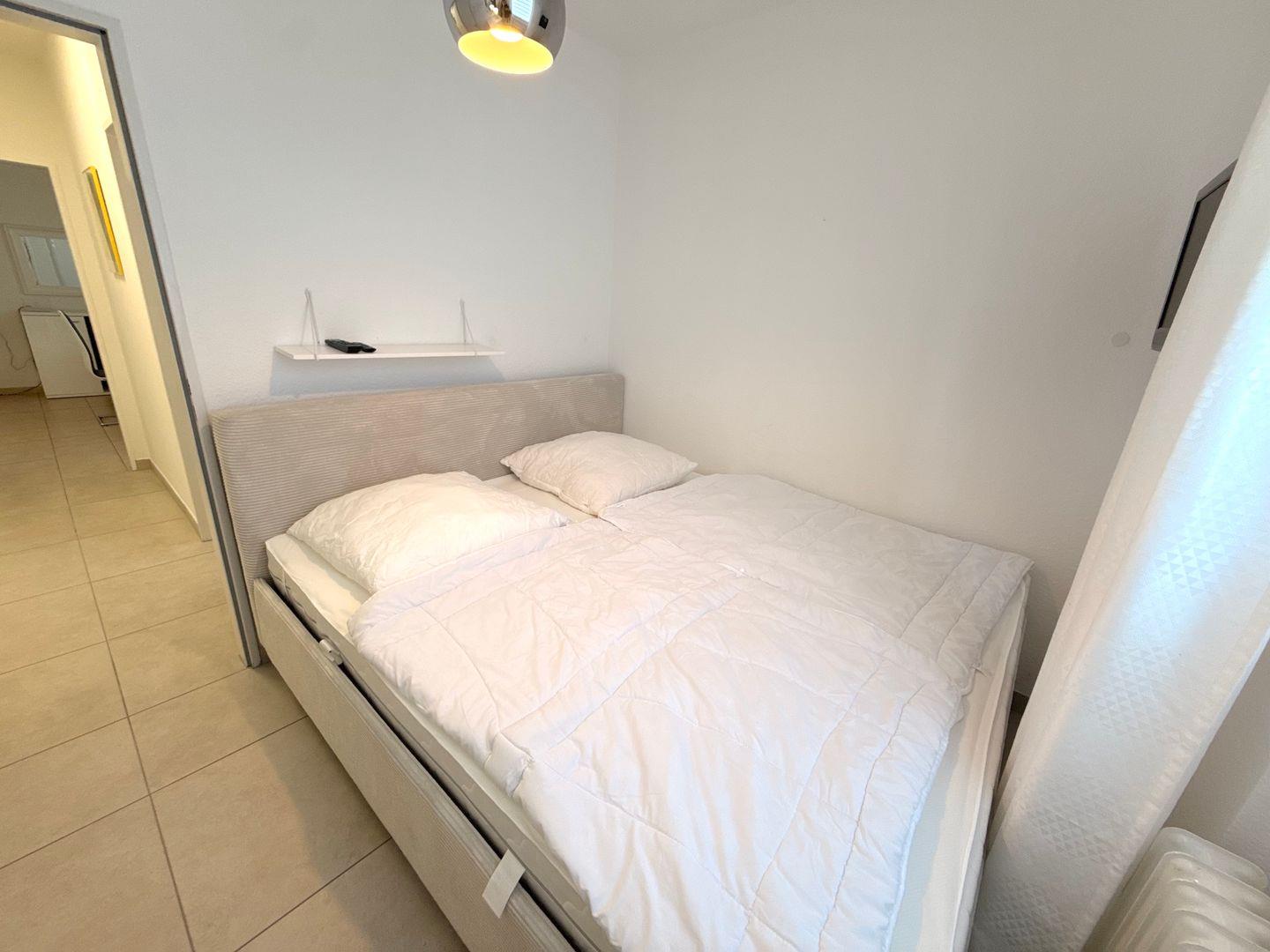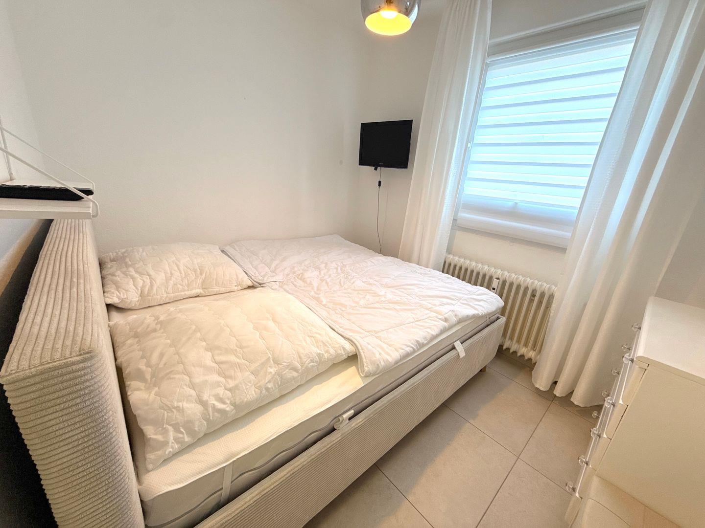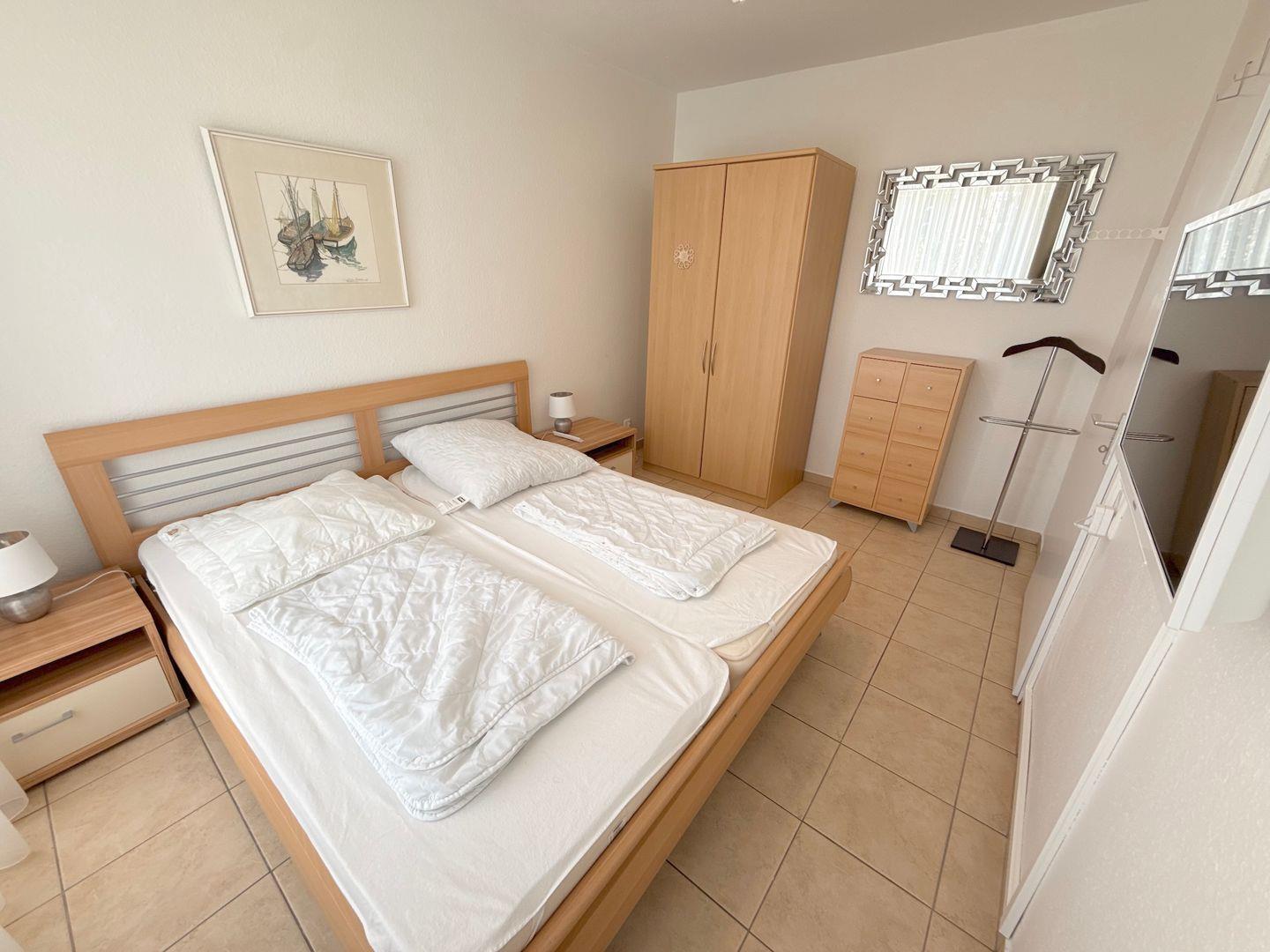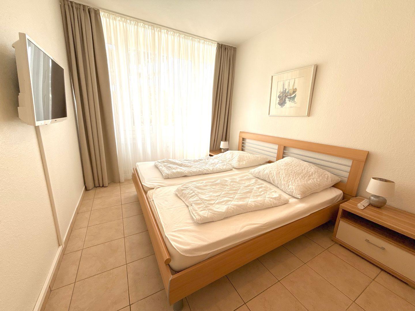 Zwei komfortable Schlafzimmer, eines mit einem Doppelbett (2x 90x200), Kleiderschrank, Kommode, Fernseher und Außenrollladen, das andere mit einem gemütlichen Doppelbett (180x200) (das Bett steht an der Wand und ist nur von einer Seite begehbar), Kommode und ebenfalls einem Fernseher. Der Fernseher hat keinen Kabel-TV Anschluss, kann aber mit einem Fire-TV Stick genutzt werden (Fire TV-Stick vorhanden).