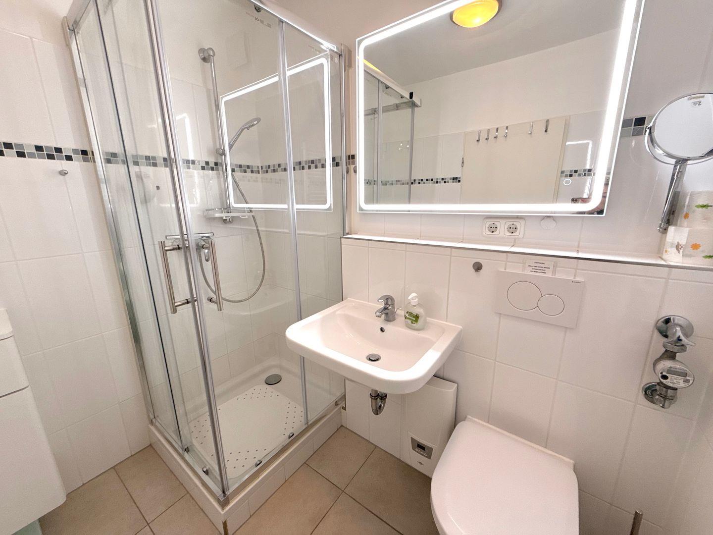 Das hell geflieste Duschbad ist mit WC, Haartrockner, Vergrößerungsspiegel und einem Handtuchheizkörper ausgestattet.