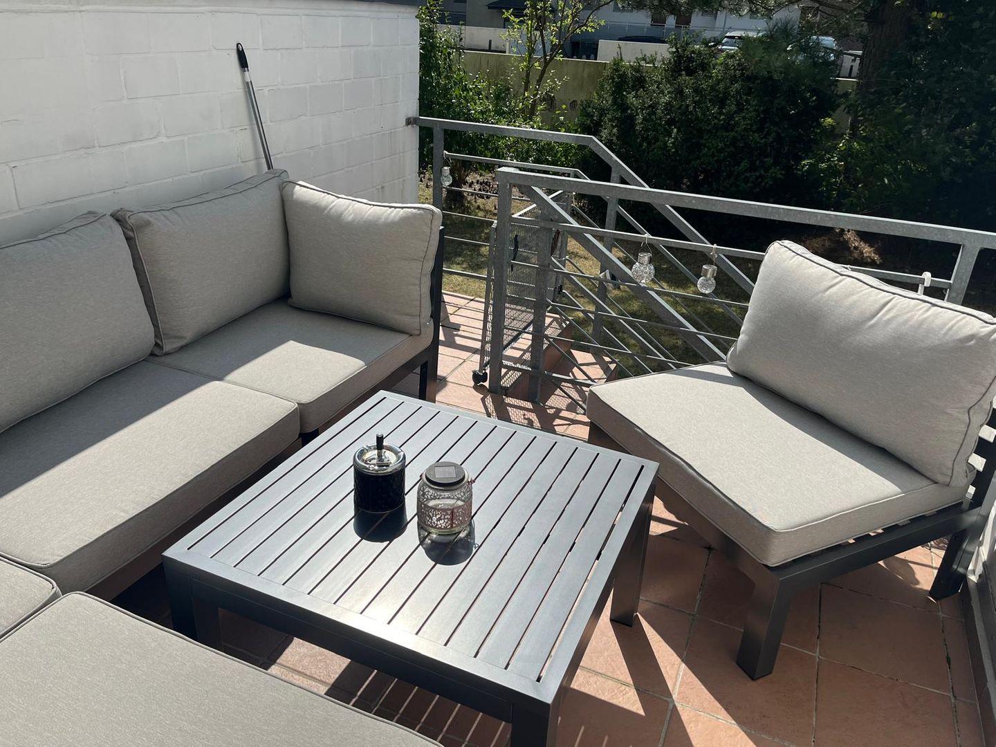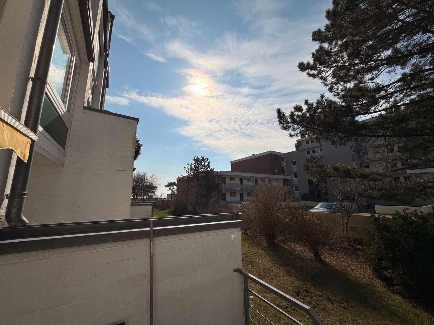 Der Balkon ist mit einer Sonnenmarkise und komfortablen Lounge Möbeln versehen. Eine kleine Treppe führt direkt zum Garten mit kleinem Rasenteil. Ihr Auto parken Sie bequem auf dem zur Wohnung gehörenden Stellplatz unter dem Parkdeck (für Klein- und Mittelklassewagen! Nr. 101 neben einem Pfeiler). Weitere Parkplätze in der Nähe sind kostenpflichtig.