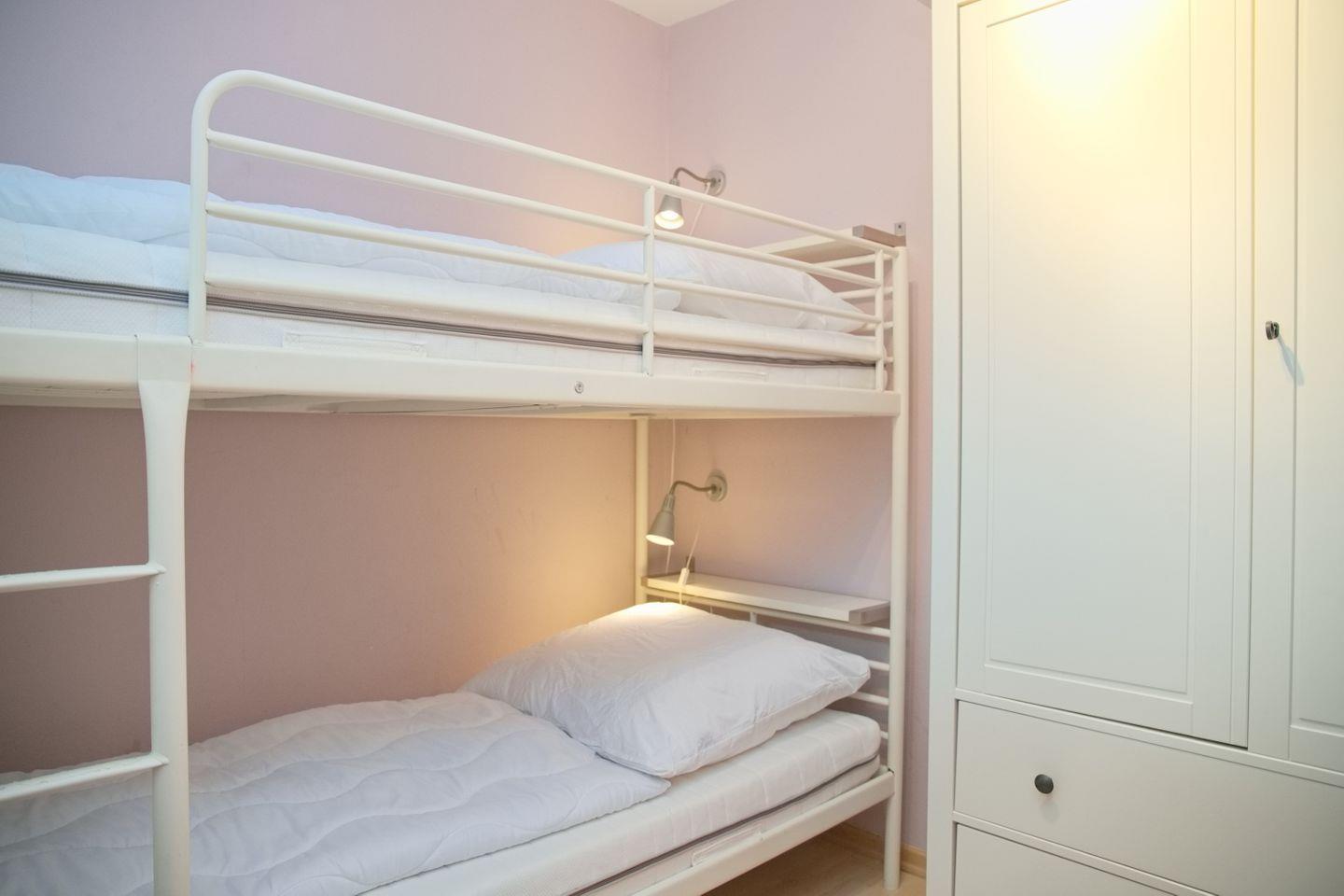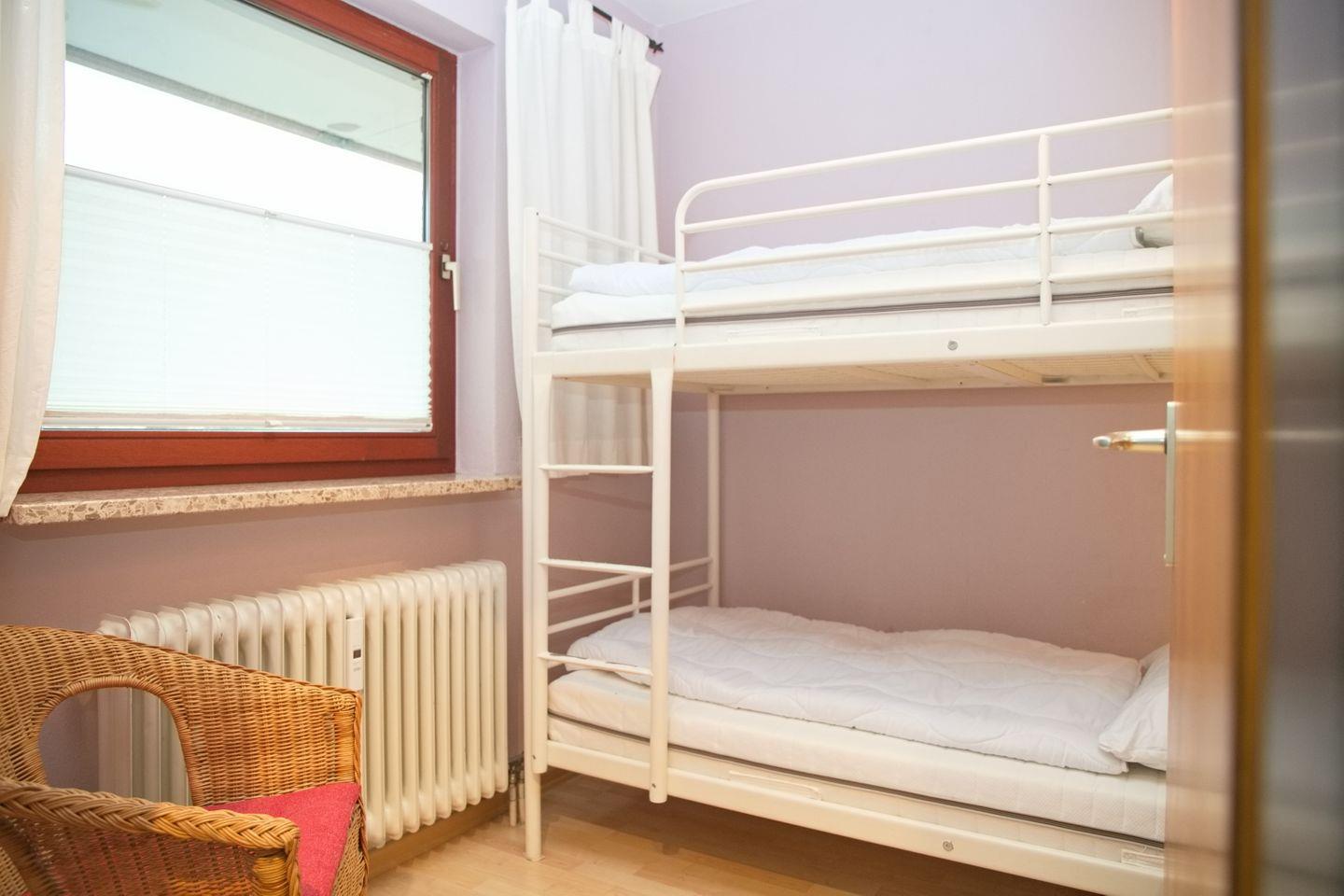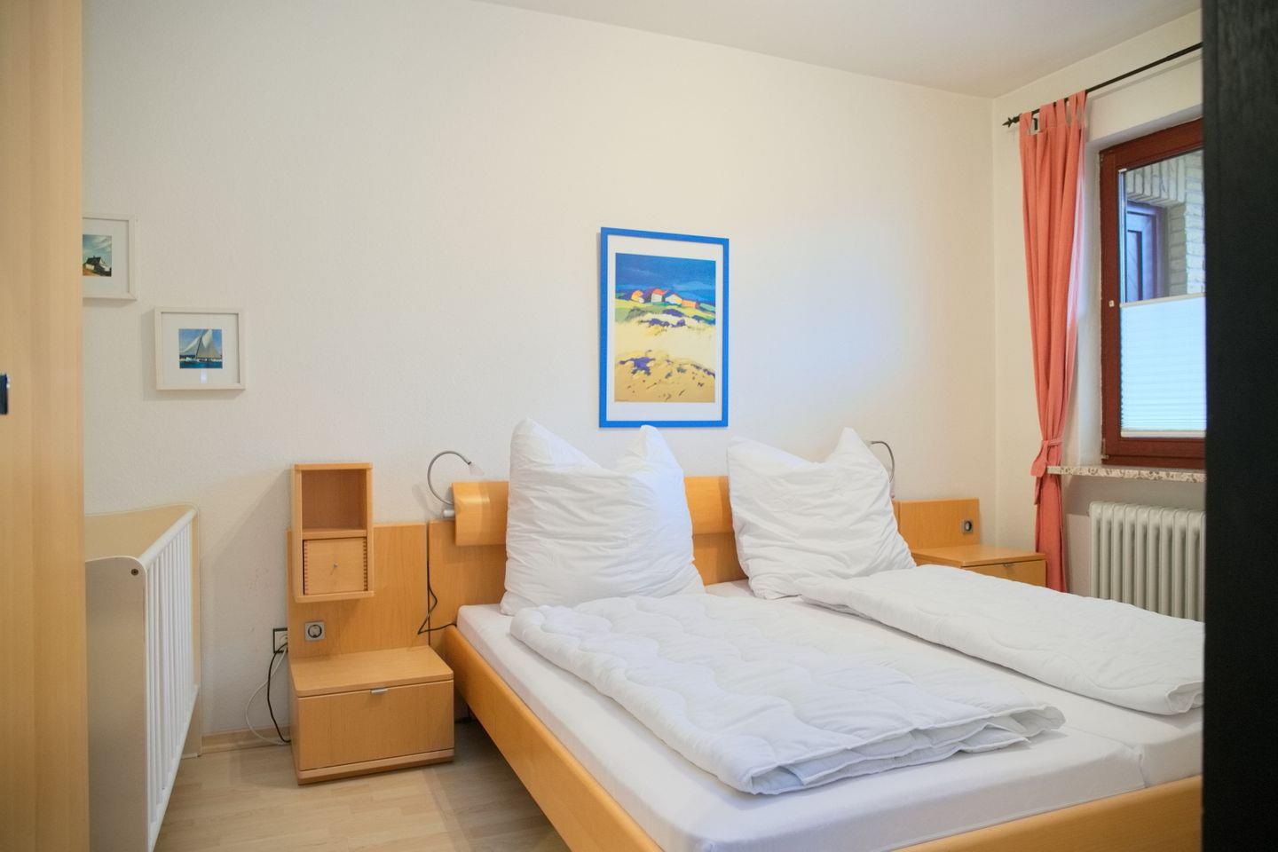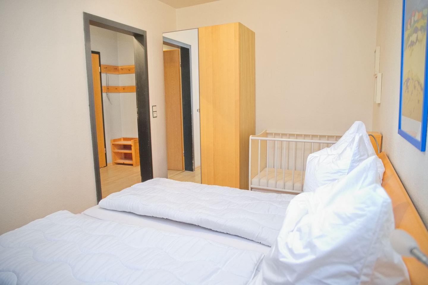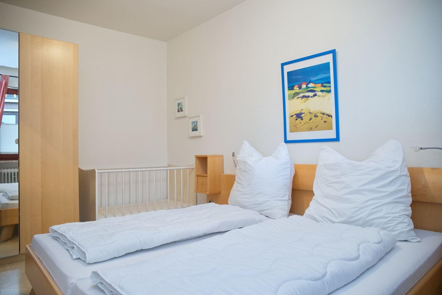 Die Wohnung verfügt über zwei Schlafzimmer. Das Elternschlafzimmer ist mit einem niedrigen Doppelbett (2 x 90 x 200 cm), Kleiderschrank sowie einem Kindergitterbett ausgestattet. Im zweiten Schlafzimmer befindet sich ein Etagenbett und ebenfalls ein Kleiderschrank – ideal für Kinder oder Jugendliche. Außenrollläden an allen Fenstern sorgen für angenehme Verdunkelung und erholsamen Schlaf.