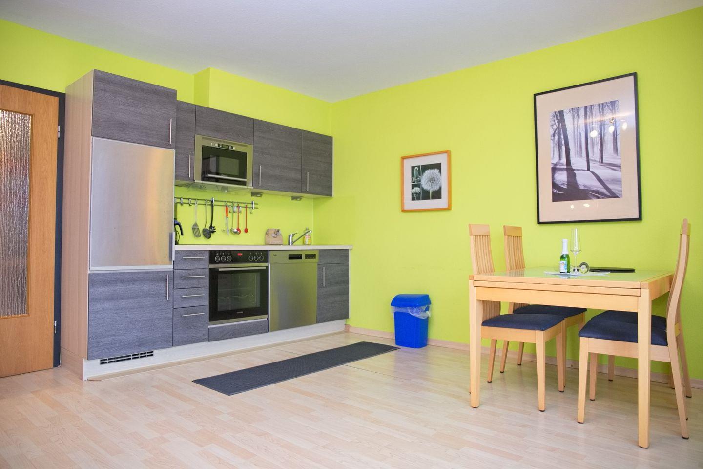 Die offene Küche ist voll ausgestattet und ermöglicht eine unkomplizierte Selbstverpflegung. Zur Verfügung stehen ein Cerankochfeld, Backofen, Geschirrspüler, Mikrowelle, Kühlschrank mit 3-Sterne-Gefrierfach sowie Kaffeemaschine, Wasserkocher und Toaster – alles, was man für den Urlaub braucht.
