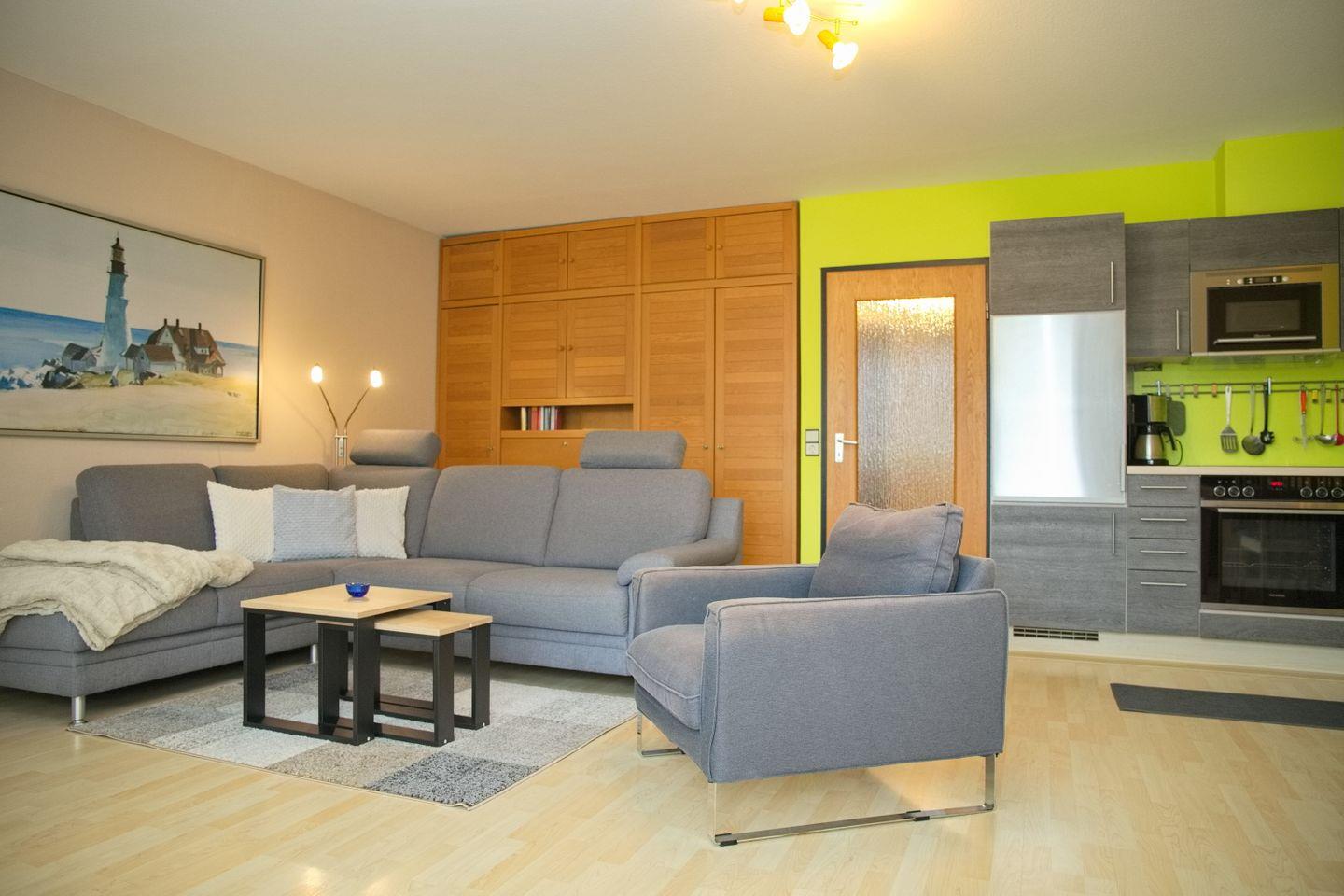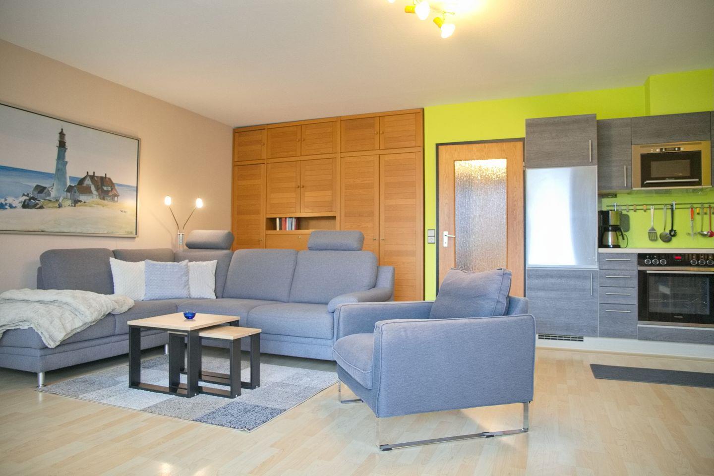 Der helle Wohnbereich ist gemütlich eingerichtet und lädt mit einer bequemen Couchecke, Sessel und TV zu entspannten Stunden ein – perfekt nach einem erlebnisreichen Tag am Meer. Direkt angrenzend befindet sich der Essbereich, der Platz für vier Personen bietet und sich ideal für gemeinsame Mahlzeiten oder Spieleabende eignet.