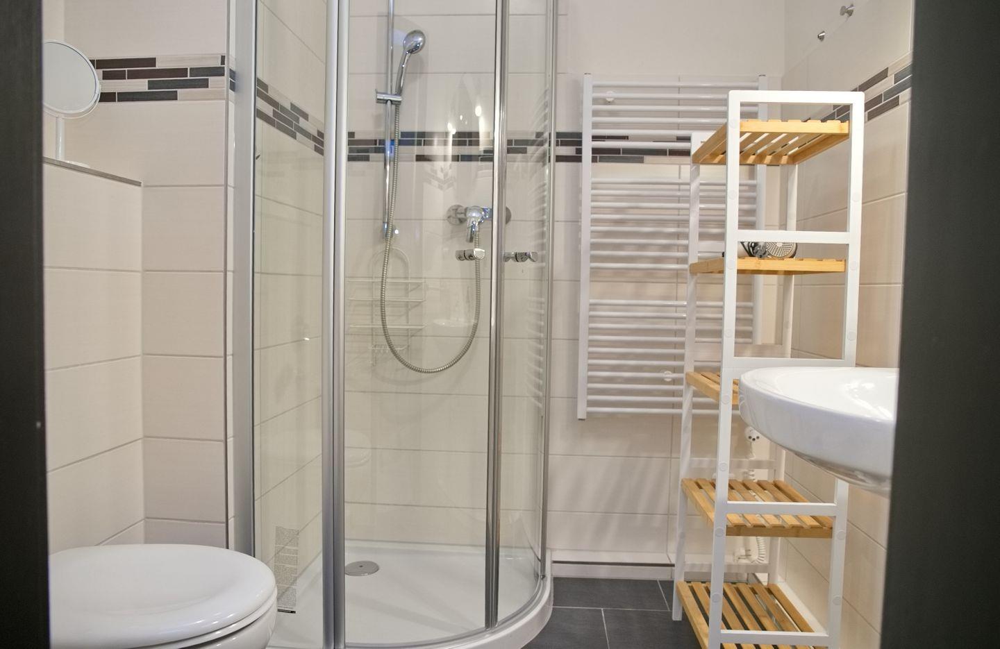 Das Badezimmer ist funktional gestaltet und verfügt über eine Dusche, WC und Waschbecken. Zusätzlich steht im Haus eine gemeinschaftlich nutzbare Waschmaschine zur Verfügung – besonders praktisch bei längeren Aufenthalten.
