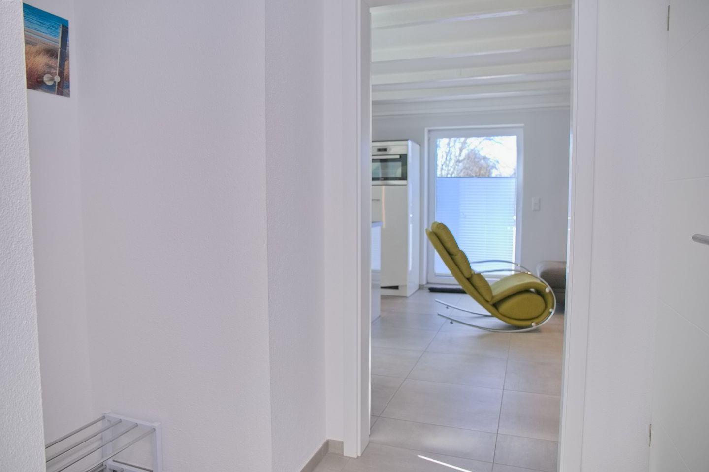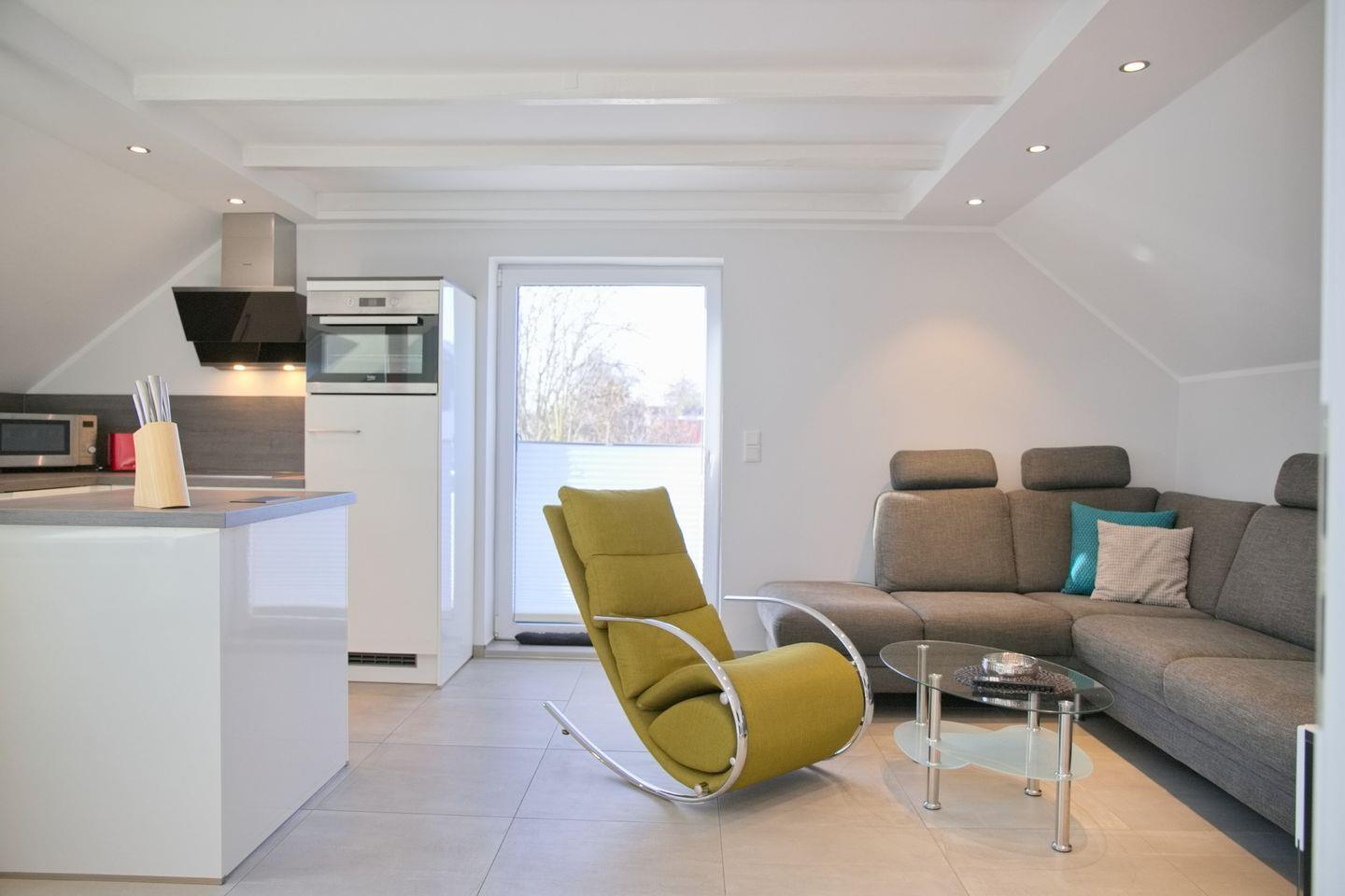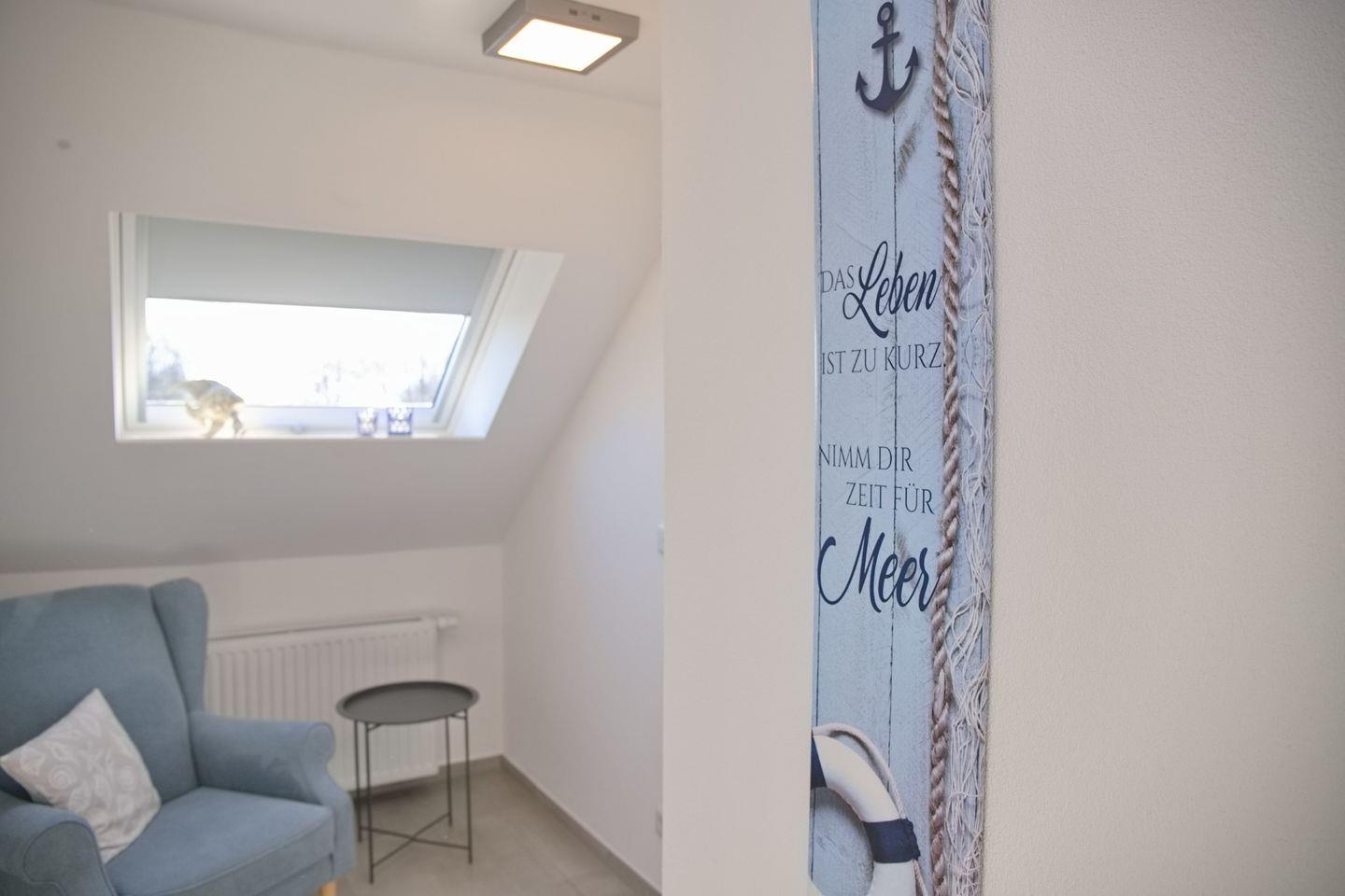 Moderne Dachgeschosswohnung mit Balkon und kleinem Meerblick, nur 450 m vom Strand in Grömitz entfernt.