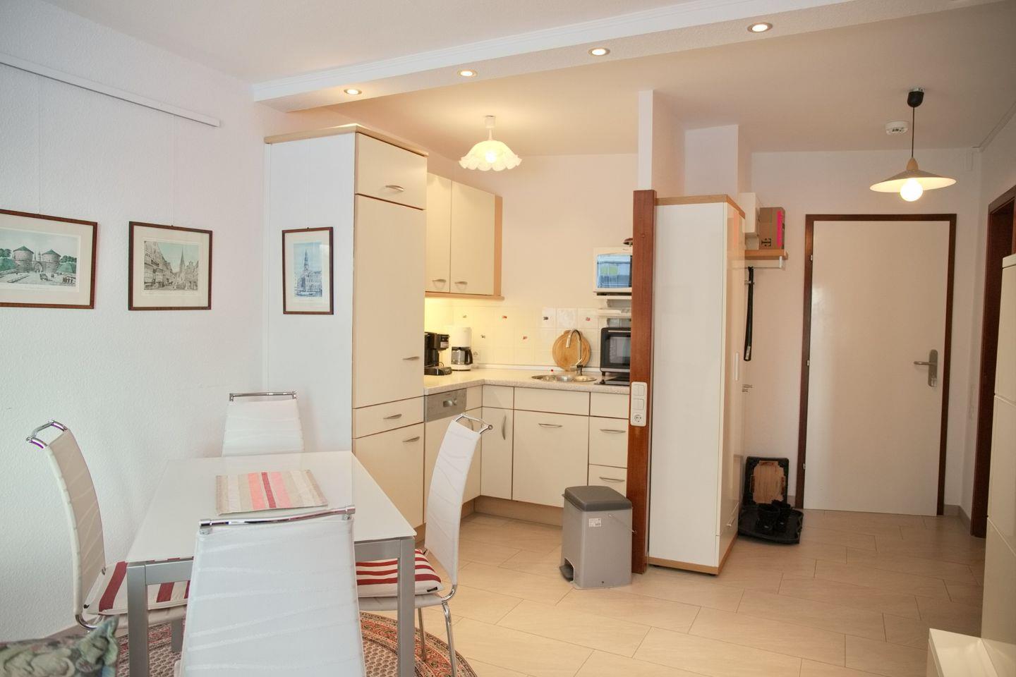 Die kompakte Küche ist funktional ausgestattet und ermöglicht eine angenehme Selbstverpflegung. Zur Verfügung stehen ein 2-Platten-Cerankochfeld, ein Mini-Backofen, eine Mikrowelle mit Grillfunktion, ein Geschirrspüler sowie ein Kühlschrank mit Gefrierfach. Kaffeemaschine, Toaster und Wasserkocher ergänzen die Küchenausstattung.