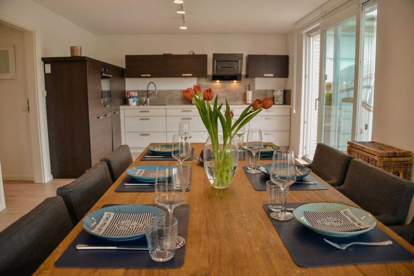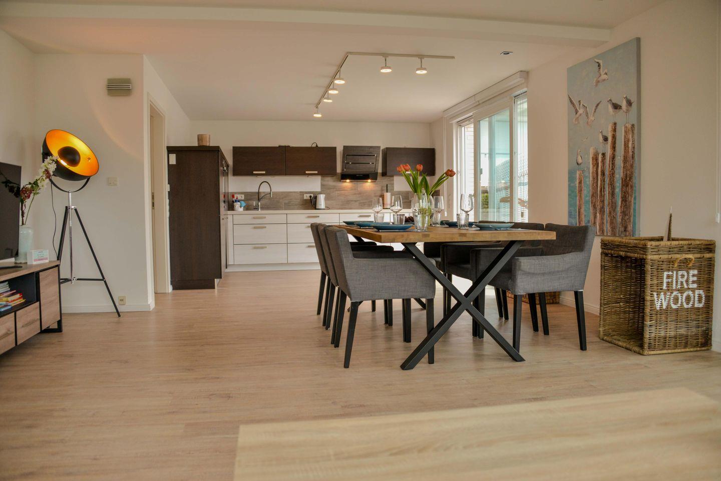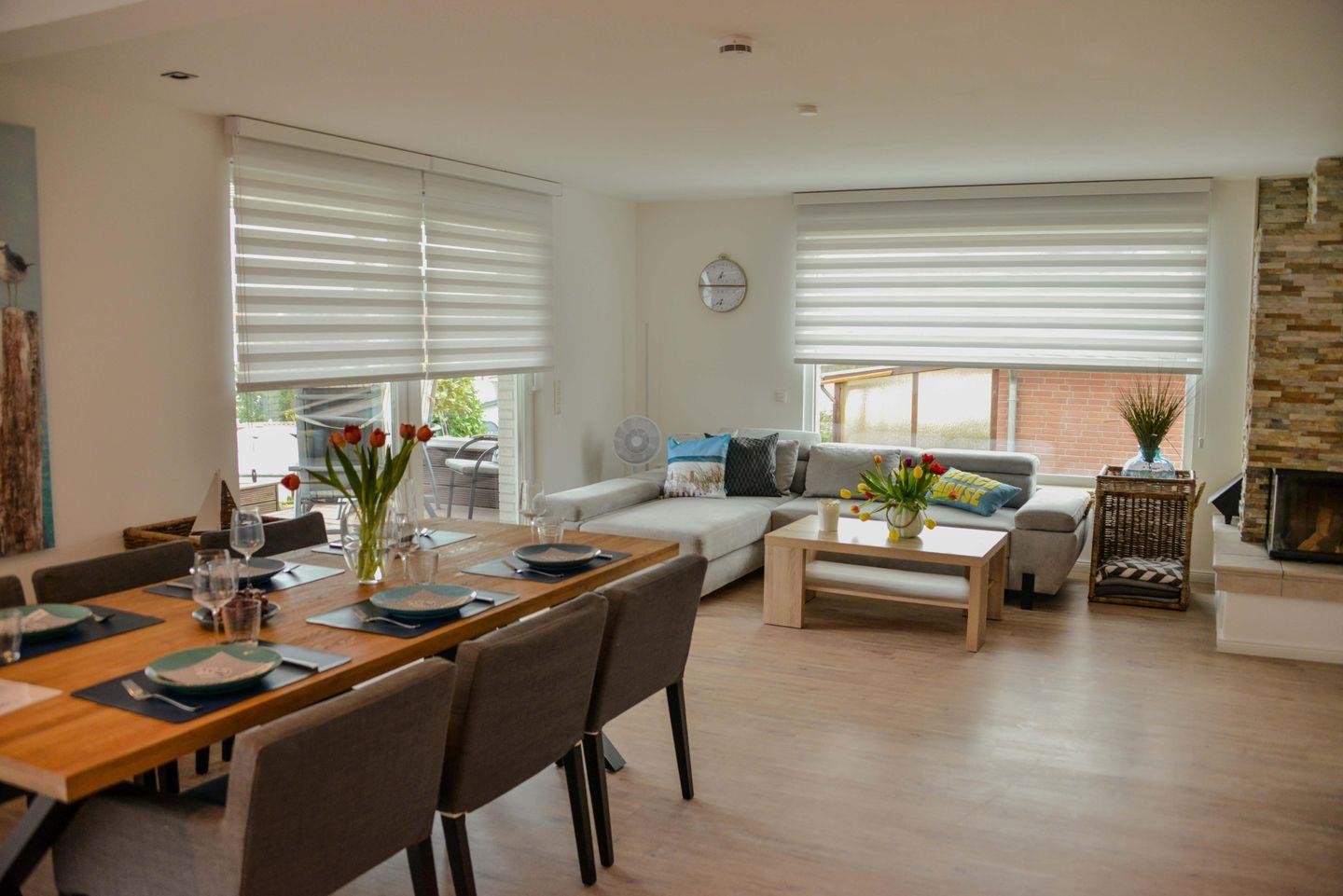 Im offenen Wohn- und Essbereich erwartet Sie eine gemütliche Sofaecke inklusive TV und Kaminofen, der an kühlen Tagen für wohlige Wärme sorgt. Der Essbereich mit hochwertigem Esstisch ist ideal für gemeinsame Mahlzeiten. Die offene Küche ist komplett ausgestattet und verfügt über einen Induktionsherd, Backofen (elektrisch), Spülmaschine, Kaffee- und Nespresso-Maschine, Wasserkocher, Toaster, Kühlschrank mit Gefrierfach sowie umfassendes Küchenzubehör. Ein großzügig bemessener Abstell- und Stauraum sorgt für Übersichtlichkeit und Bequemlichkeit während des Aufenthalts.