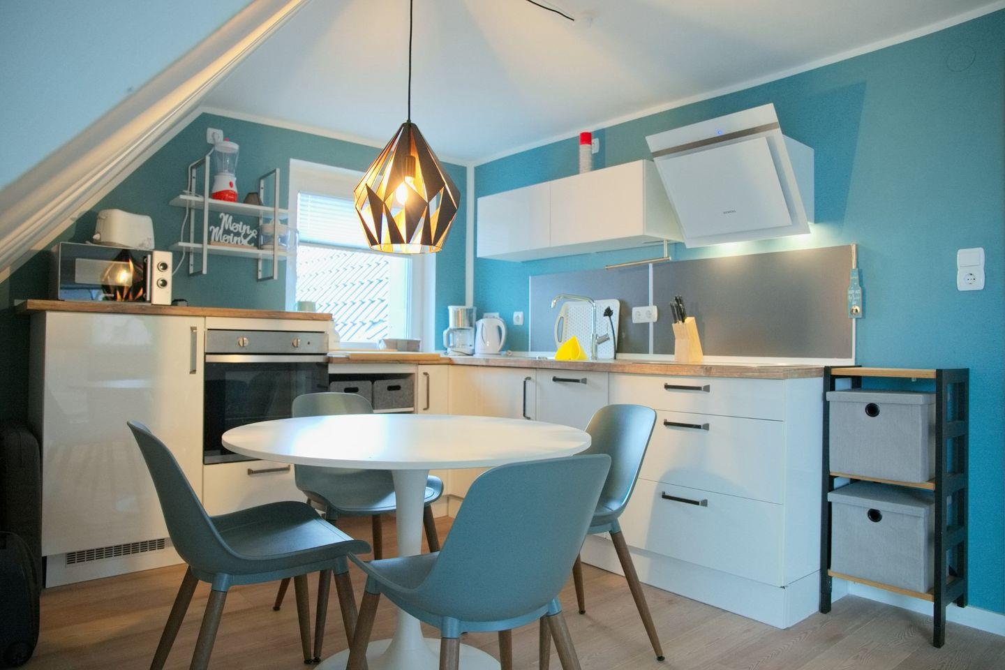 In der offenen, voll ausgestatteten Einbauküche findest du alles, was du brauchst, um dich auch im Urlaub ganz zuhause zu fühlen: Ceranfeld, Backofen, Mikrowelle, Geschirrspüler, Kühl-Gefrierkombination sowie Kaffeemaschine, Wasserkocher und Toaster. Ob schneller Kaffee am Morgen oder gemeinsames Kochen – hier entsteht Genuss ganz ohne Aufwand.