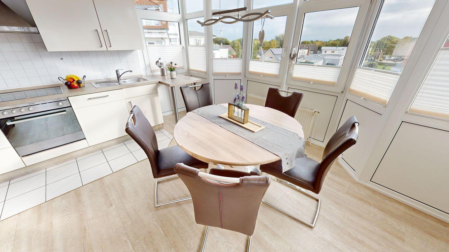 Im Anschluss an den Wohn-/Essbereich mit offener, schicker Küche liegt der möblierte Balkon mit Strandkorb, wo Sie entspannte Stunden verbringen können.