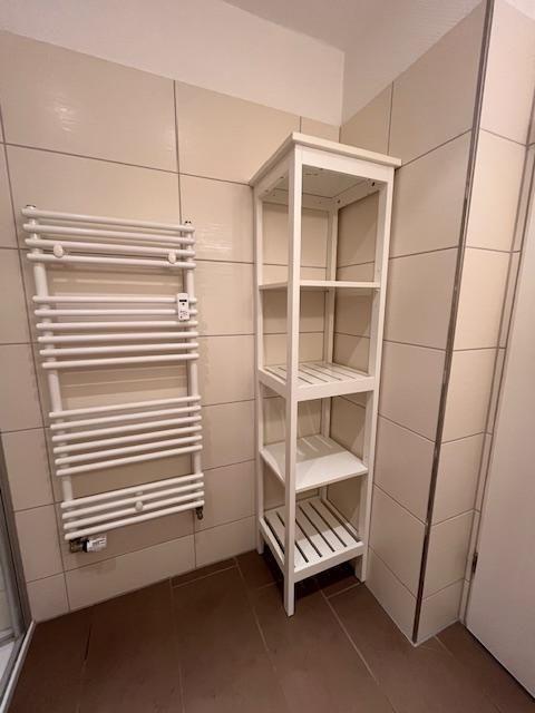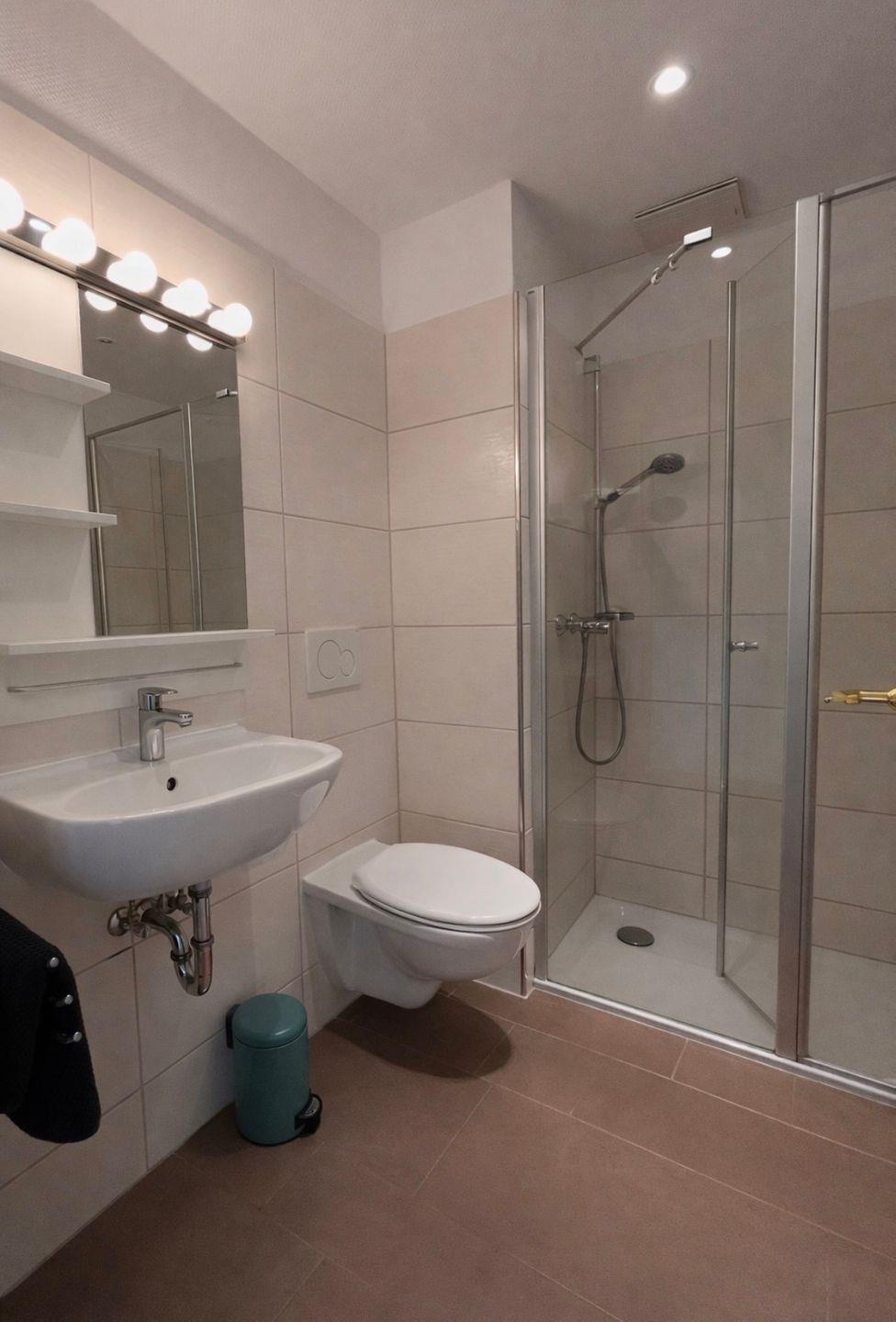 Das Duschbad mit seiner bodentiefen Dusche ist hell gefliest und bietet genug Platz für die persönlichen Dinge.