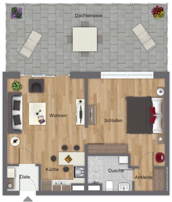 Vom Schlafzimmer, mit einem Doppelbett und Kleiderschrank, gelangen Sie, ebenso wie vom Wohnzimmer, auf die ca. 32 m² große Dachterrasse mit Gartenmöbeln.