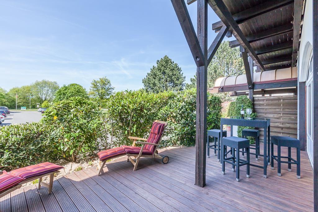 Vom Wohnzimmer gelangen Sie auf die ca. 30 qm große West-Terrasse, wo Sie auf dem neu verlegten Holzdeck mit Gartenmöbeln die Nachmittags- und Abendsonne genießen können.