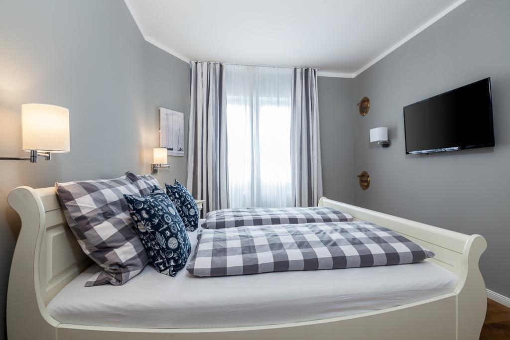 Im ganz in grau gehaltene Schlafzimmer schaffen das einladende Doppelbett im Landhausstil und der moderne Wand-Fernseher gemütliche Atmosphäre.