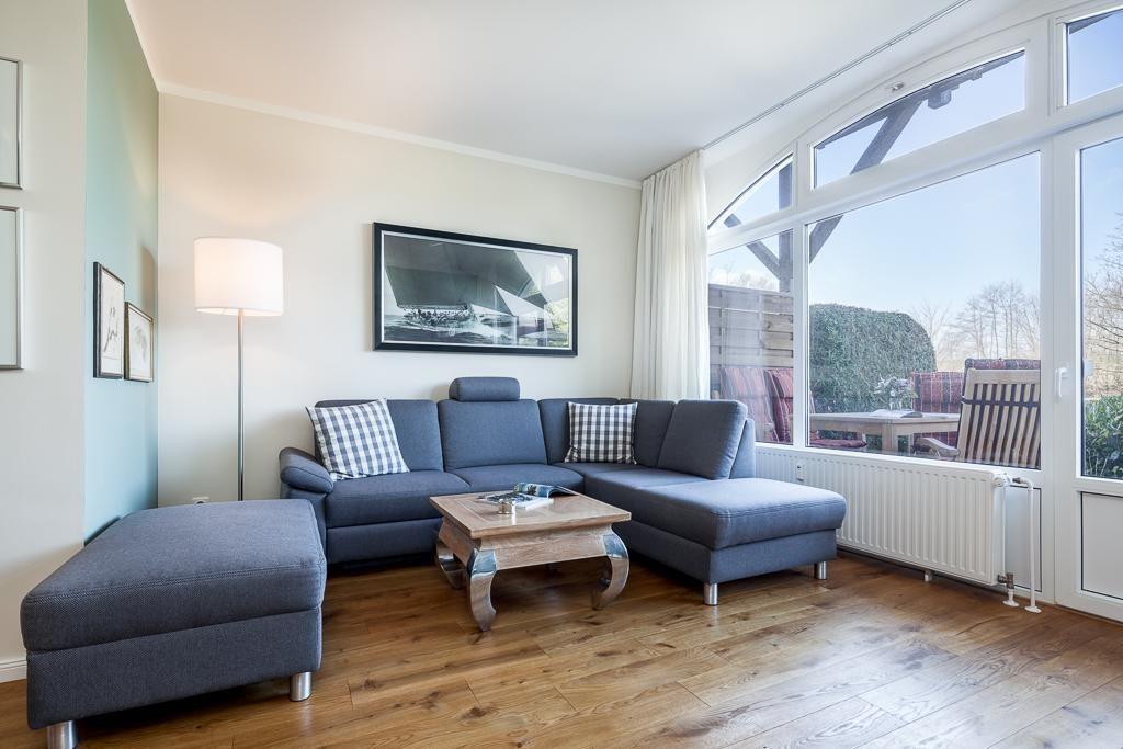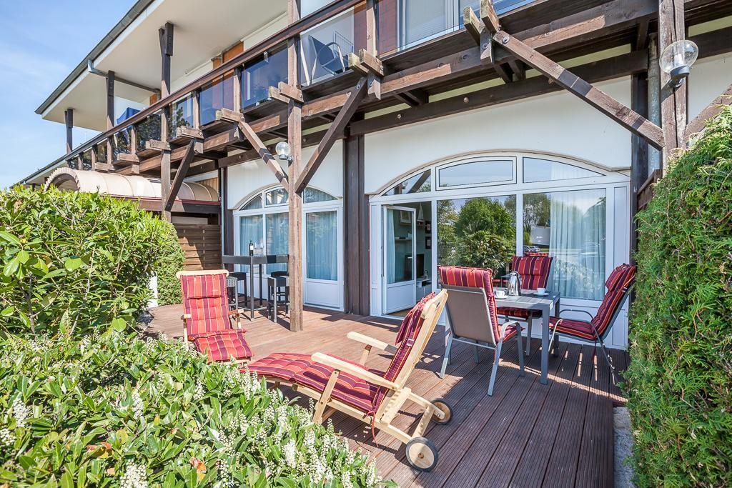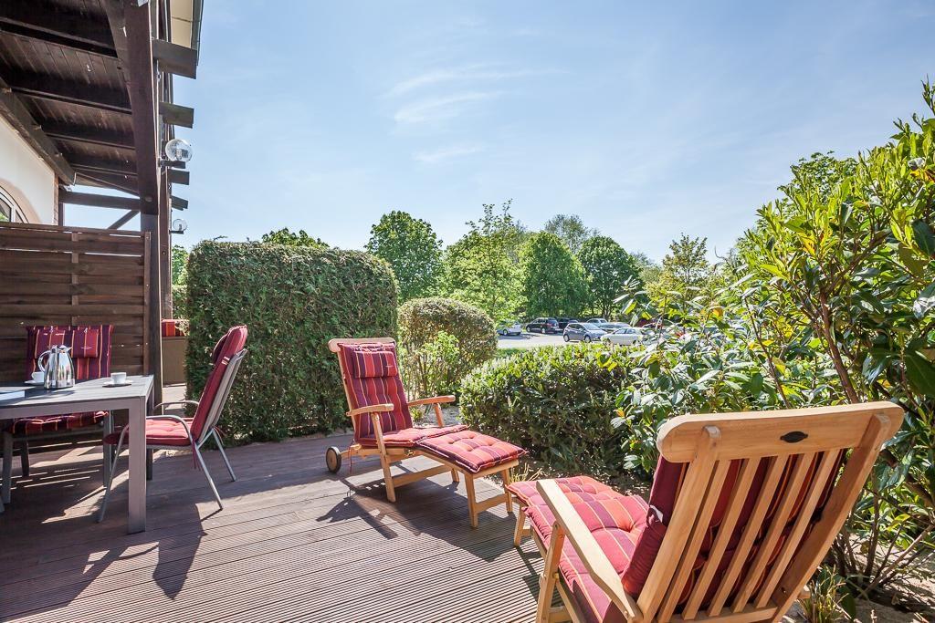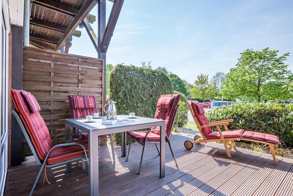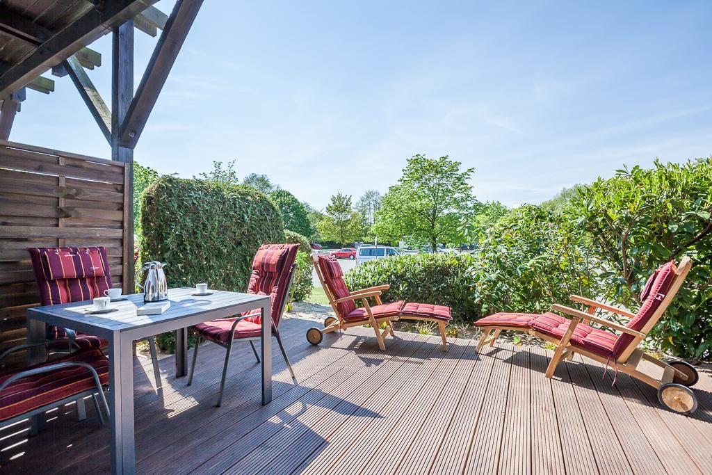 Sowohl vom Schlaf- als auch vom Wohnzimmer gelangen Sie auf die ca. 25 qm große West-Terrasse wo Sie auf dem neu verlegten Holzdeck mit Gartenmöbeln die Nachmittags- und Abendsonne nach einem tollen Strandtag genießen können.