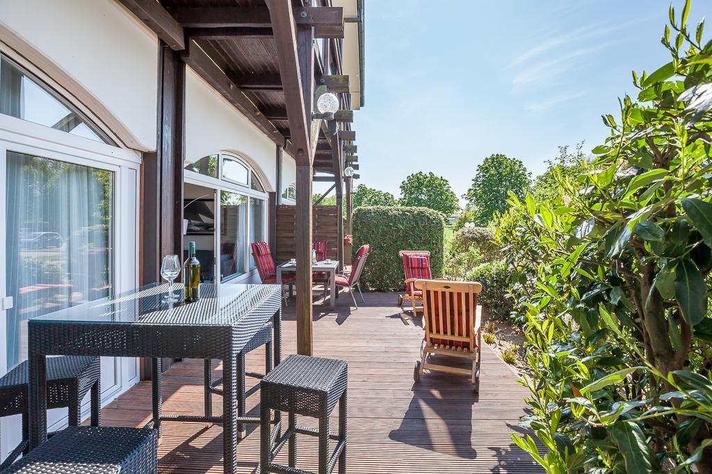 Moderne Ferienwohnung in Grömitz mit Terrasse, Pool, Sauna und WLAN, ideal für erholsame Tage in grüner Lage.
