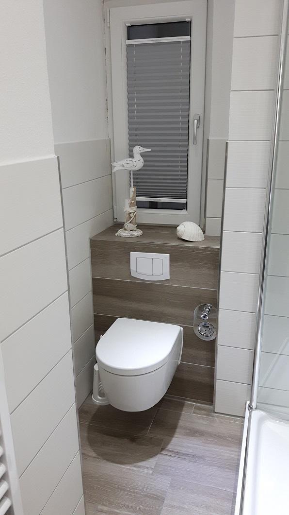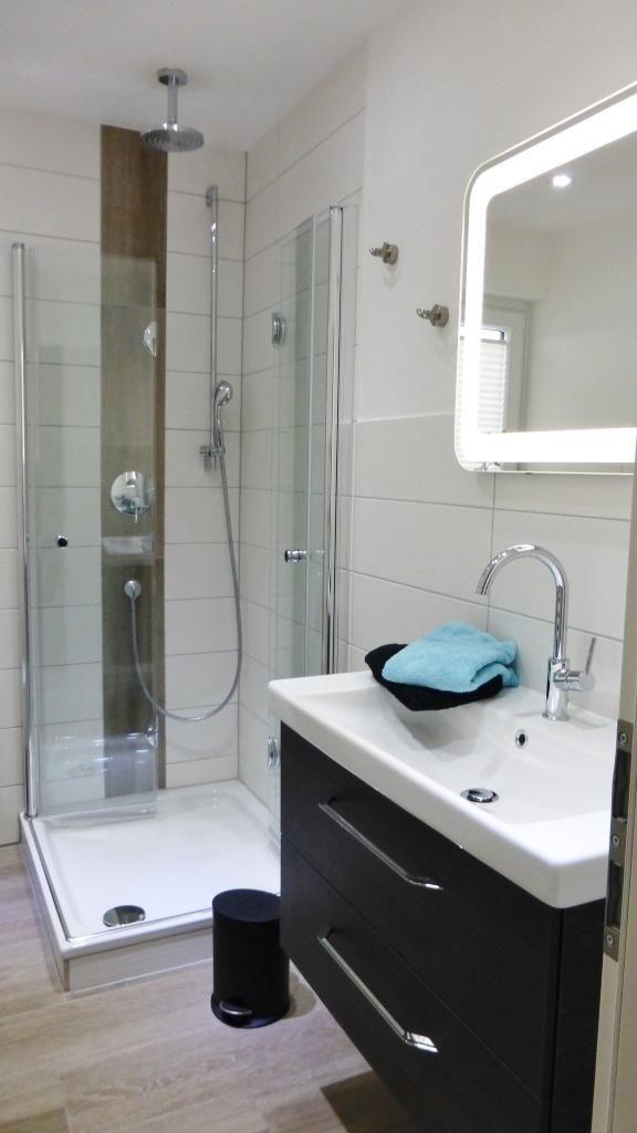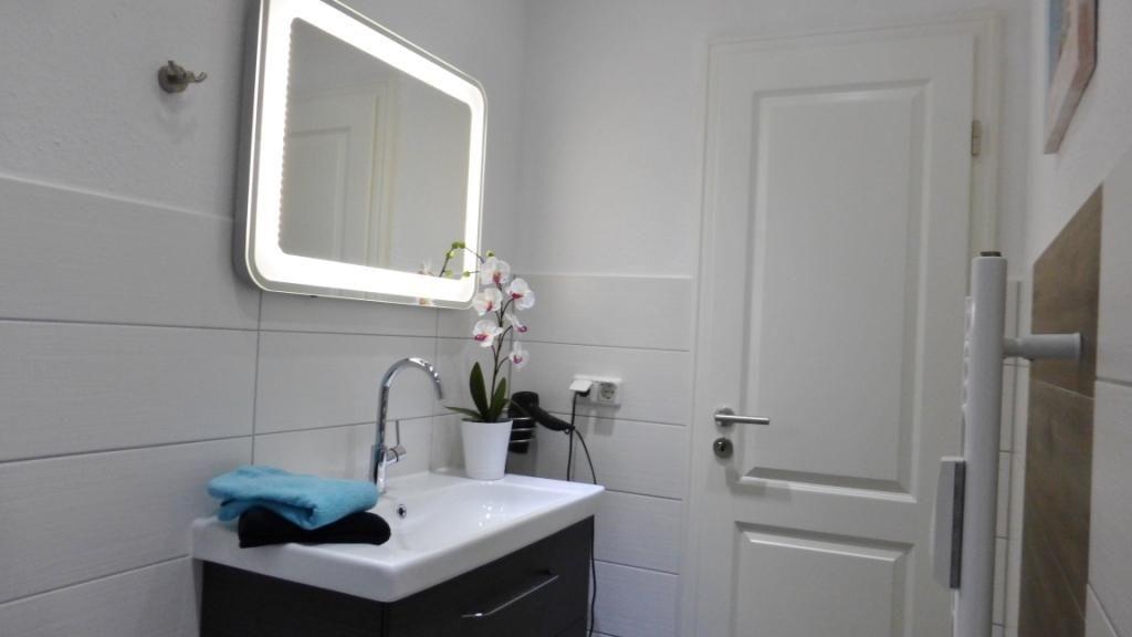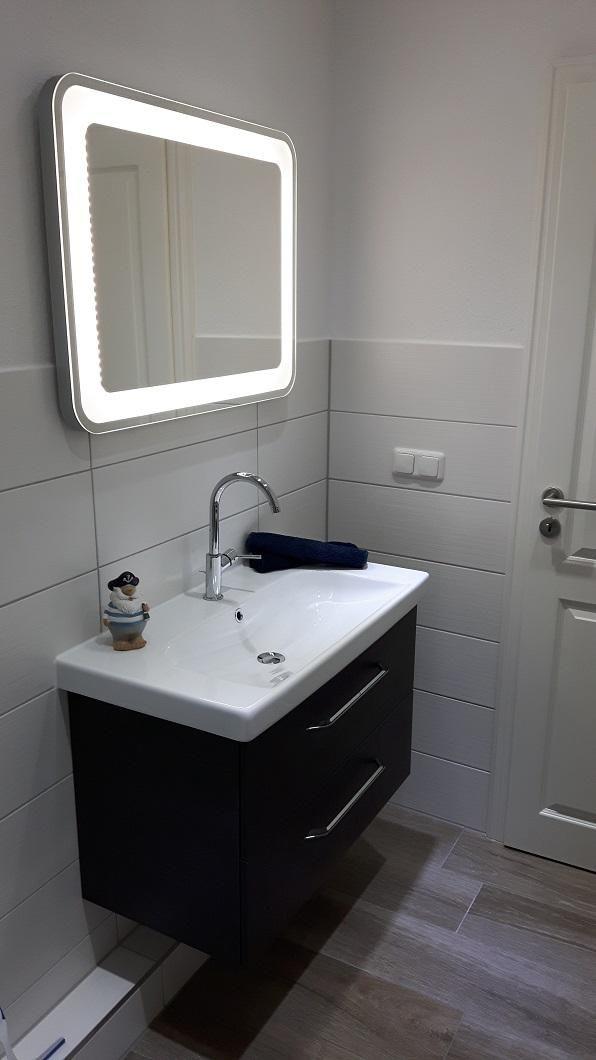 Das Duschbad wurde vollständig renoviert und mit einer Regen-/ und Handdusche, Waschtisch mit beleuchtetem Spiegel und Handtuchheizung ausgestattet.