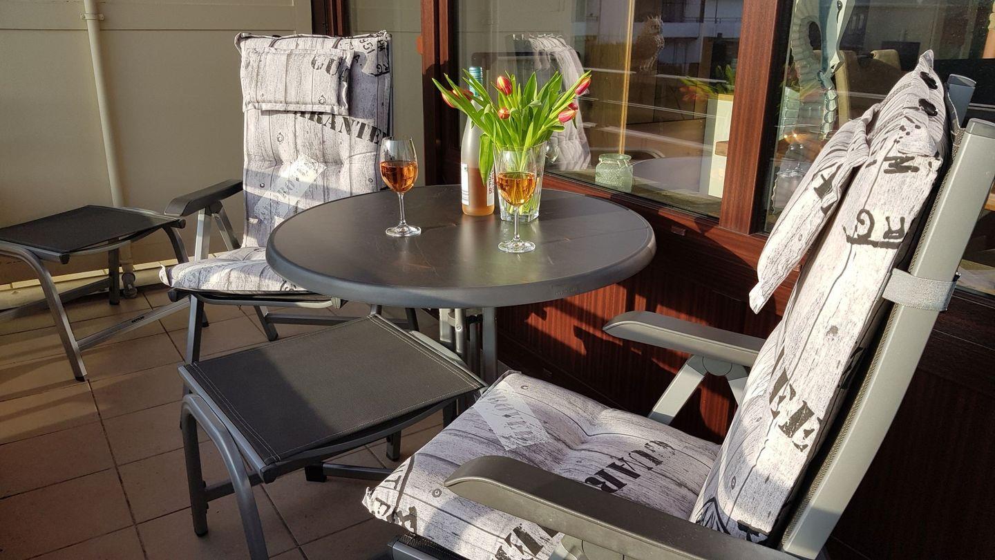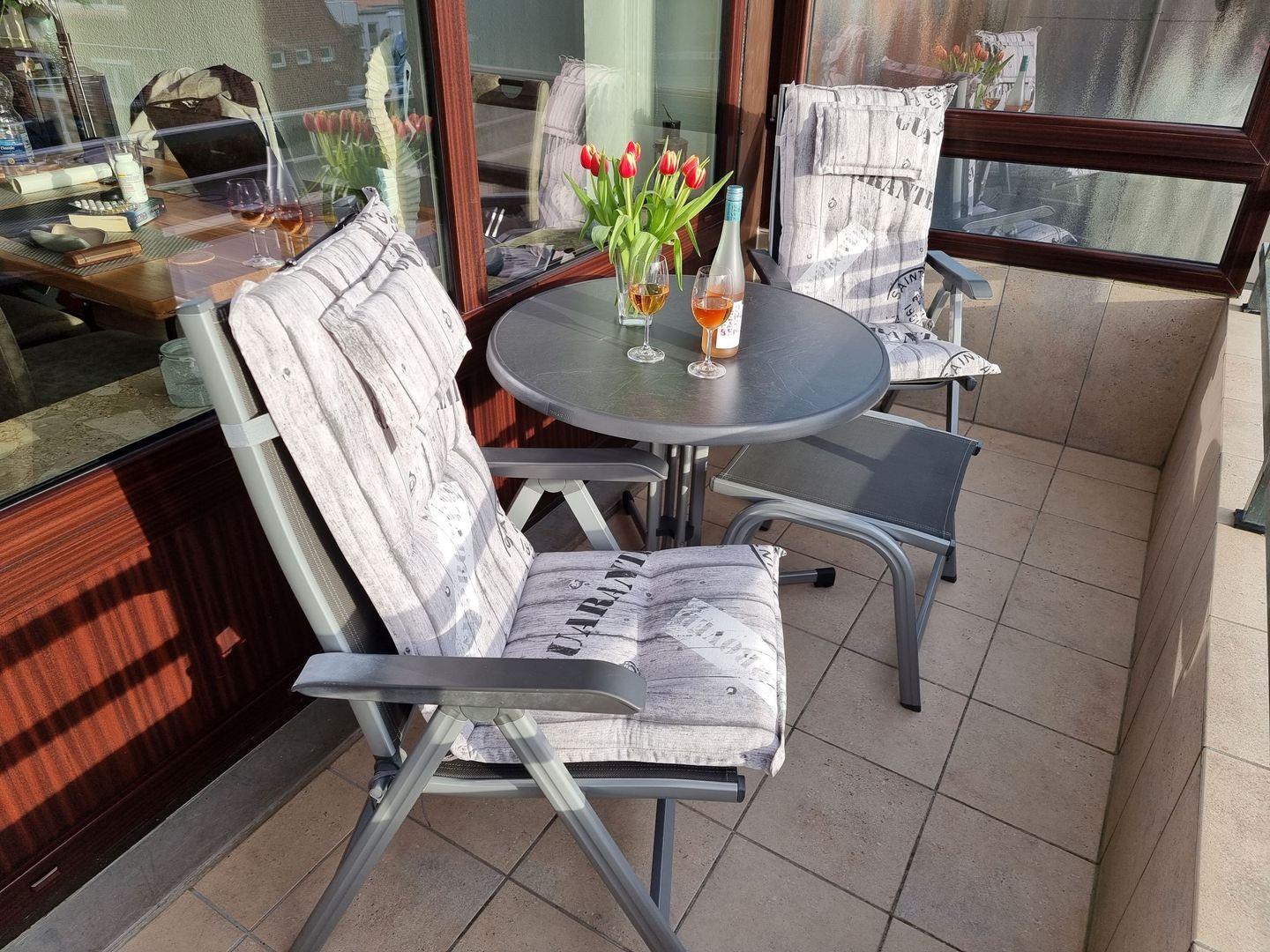 Vom großzügigen Wohnzimmer gelangen sie auf den Balkon in Südwest-Lage (mit elektrischer Markise) , wo sie bis zum Abend die Sonne genießen können.